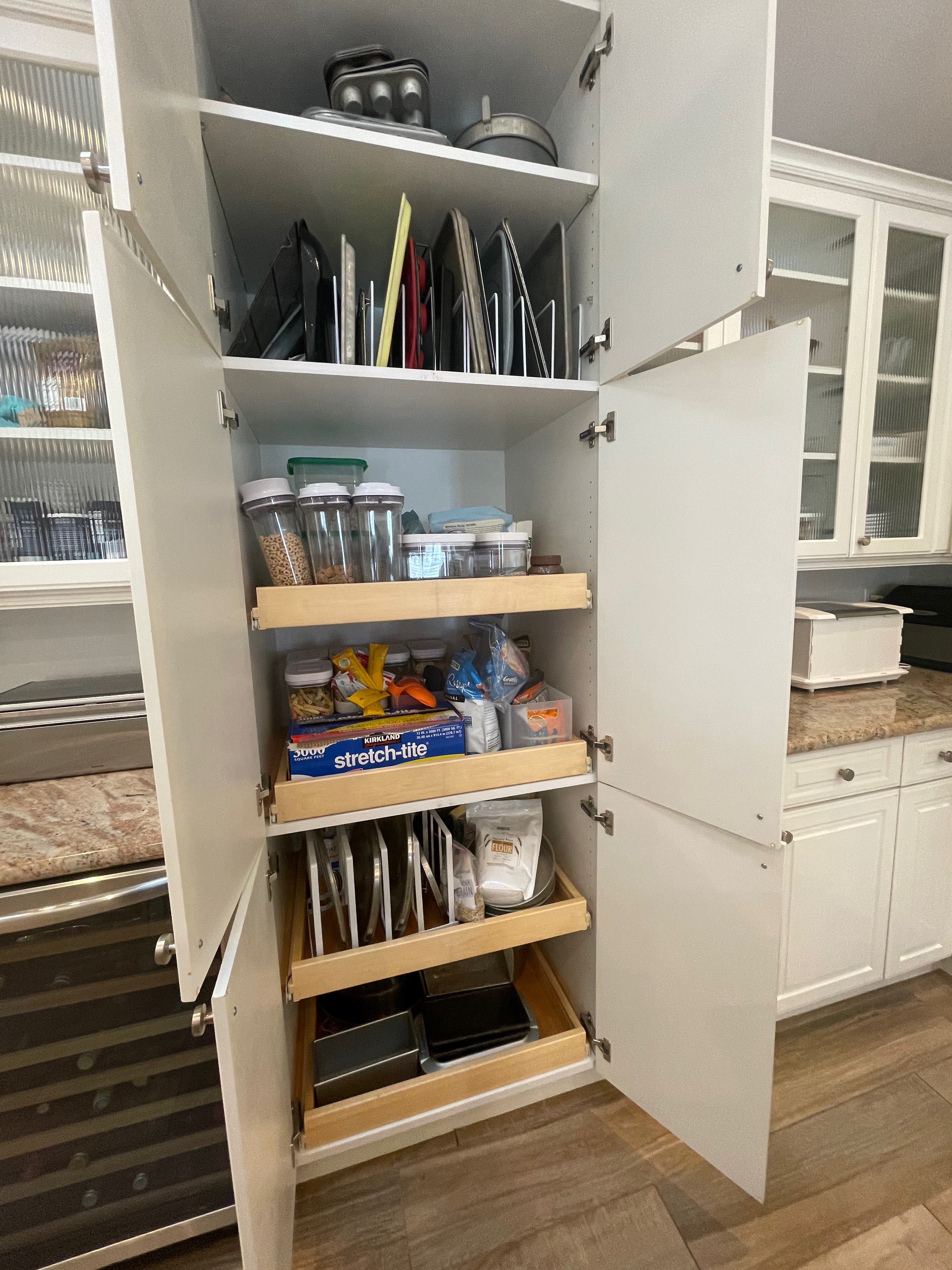 1-Six door double pantry cabinet w/4 pull out drawers inside Dim.: 30 “w x 96“w/ x 24”d