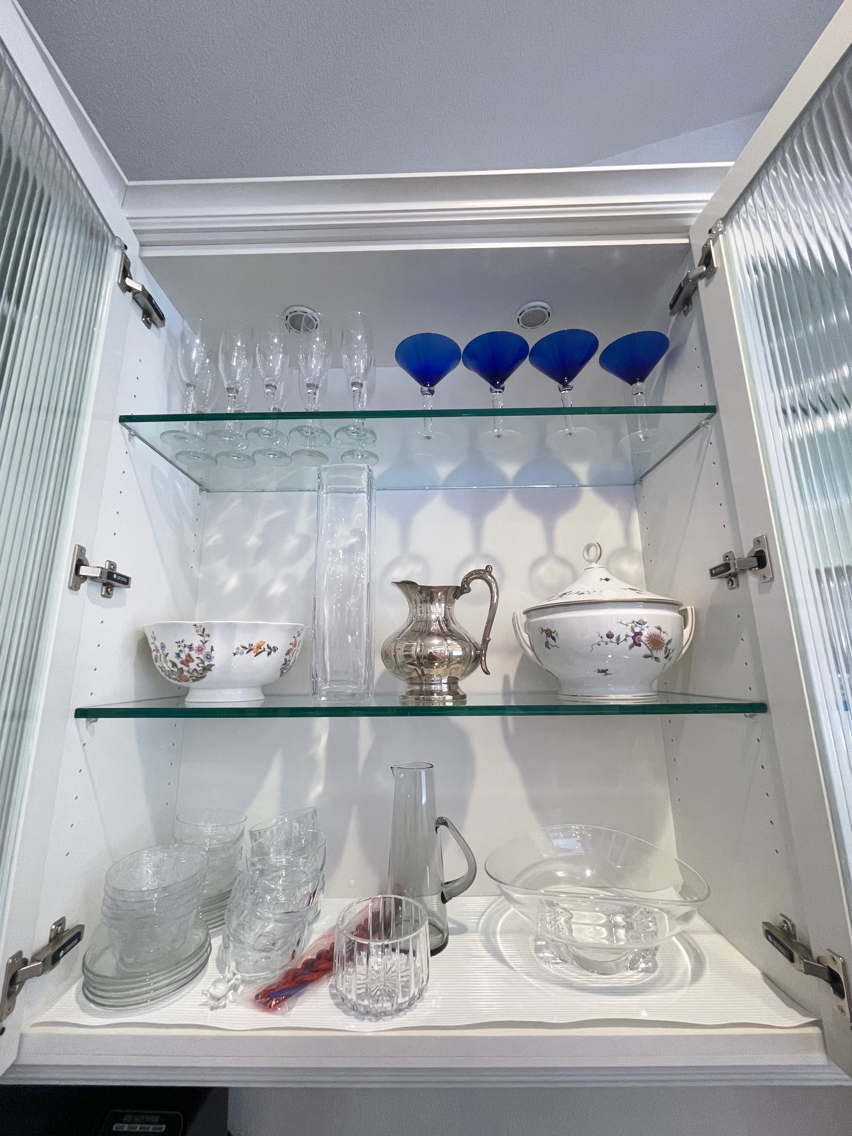 2-Two door glass wall cabinet Dim.: 36“w x 42“ h cab. only/44”h w/crown/45 ½”h x 12“d