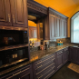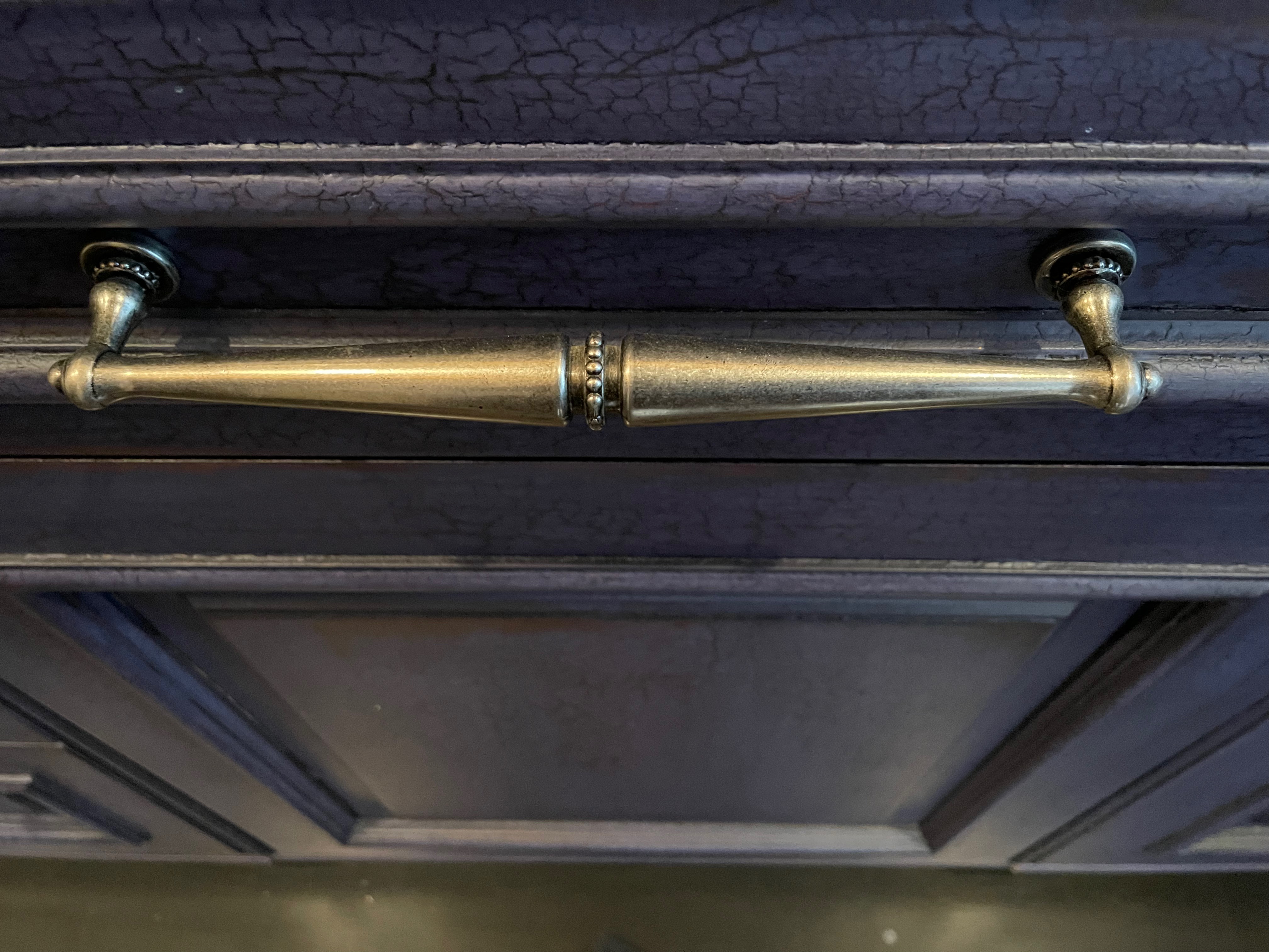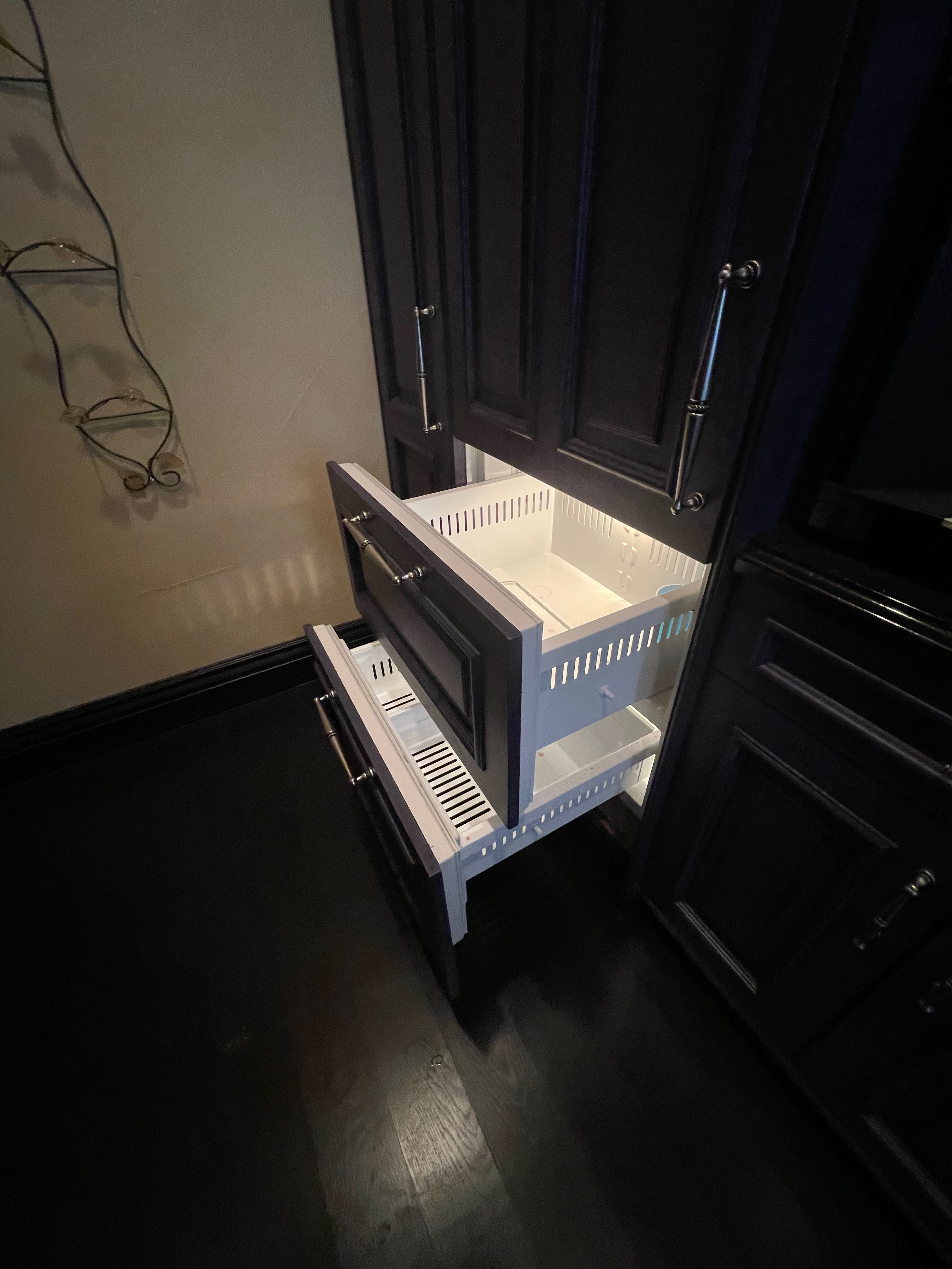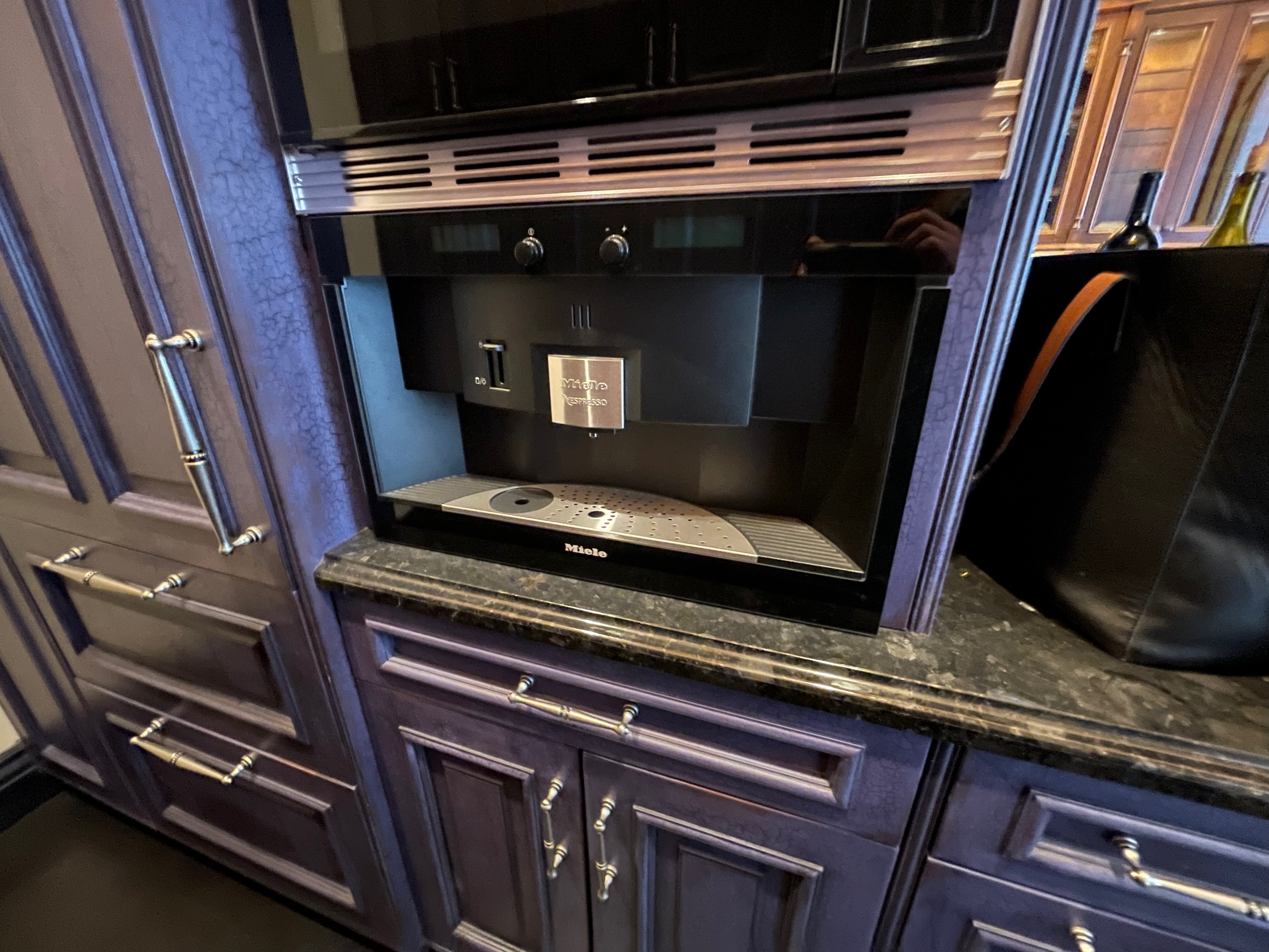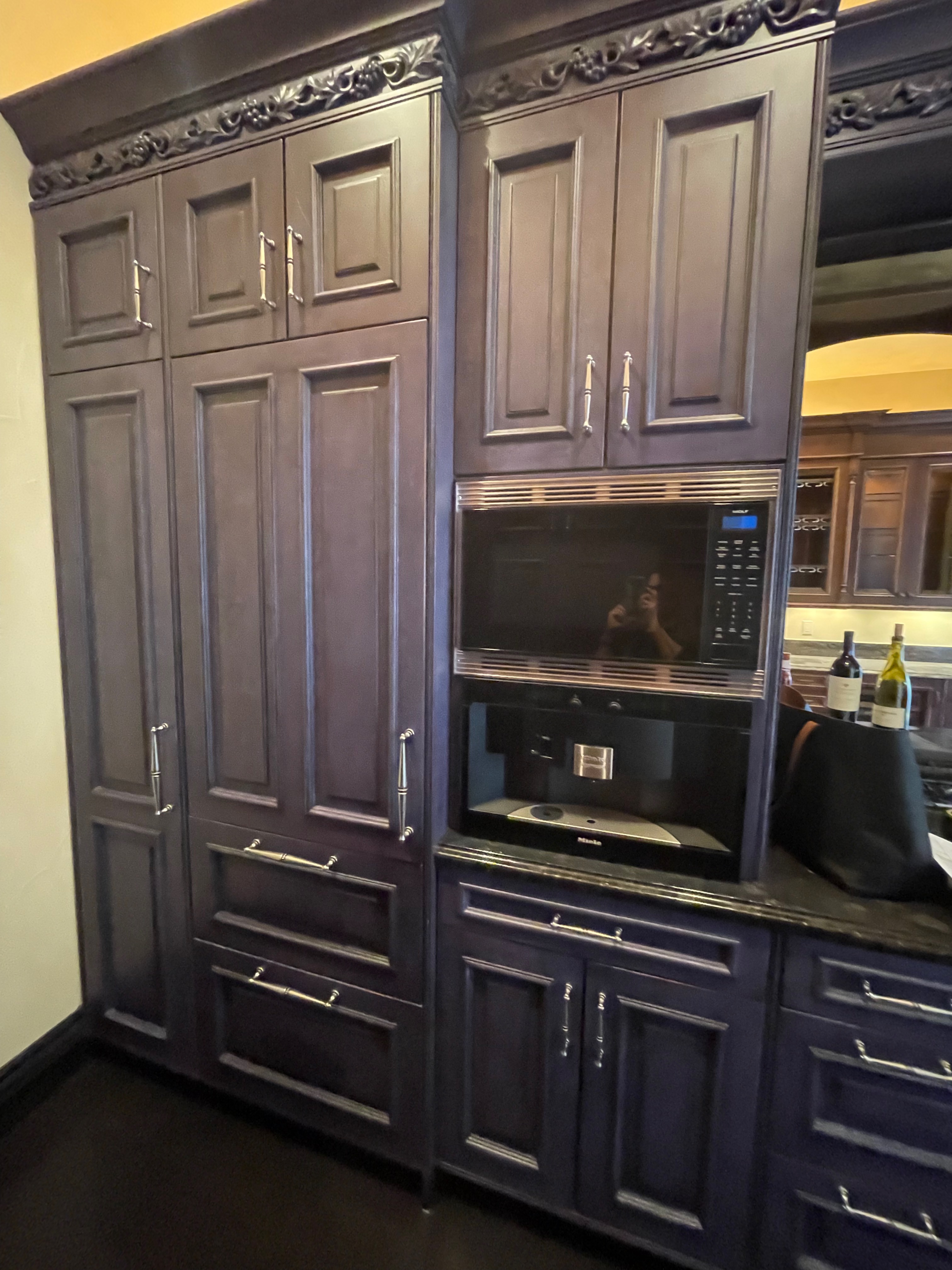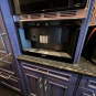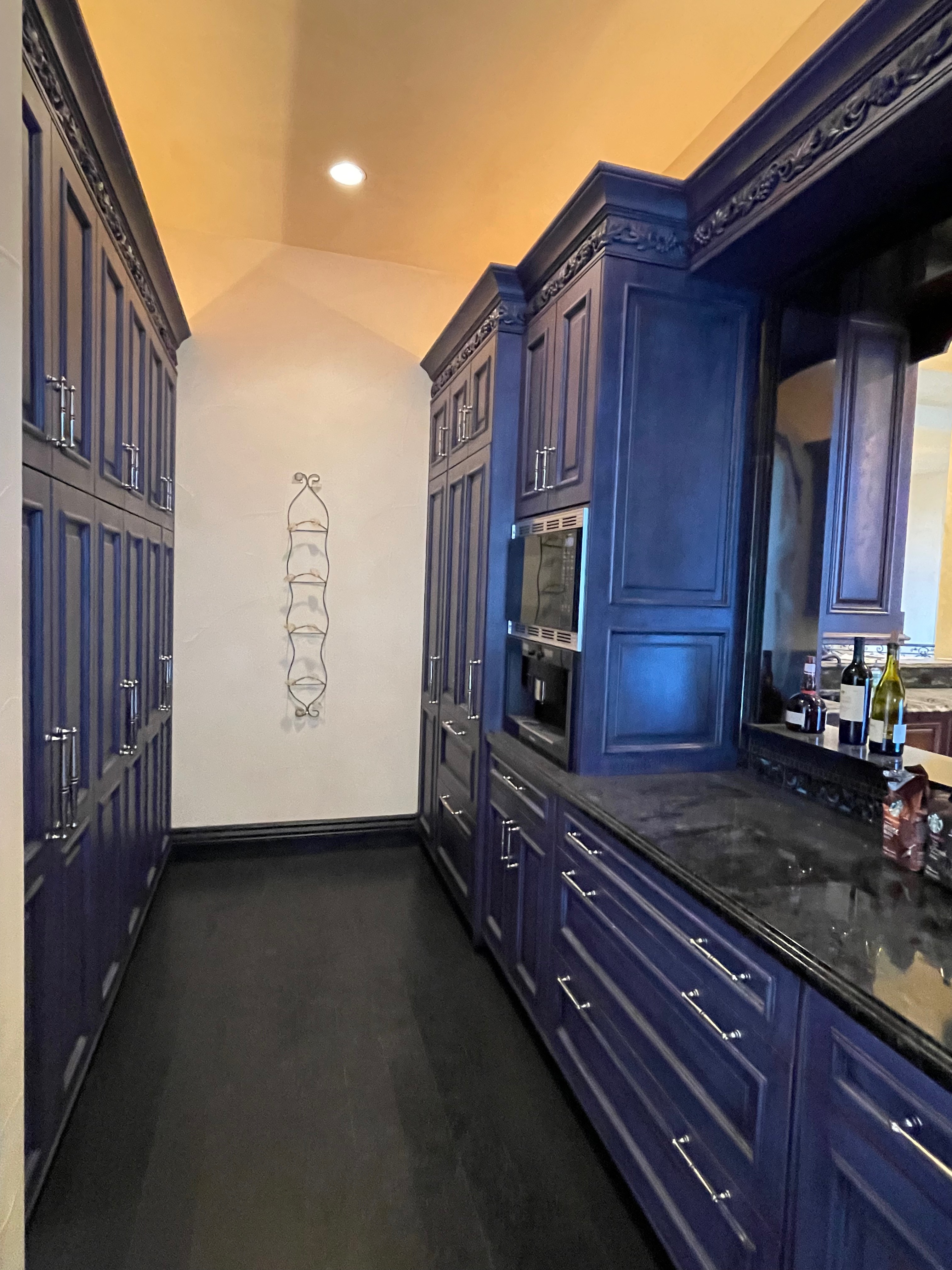 William Ohs kitchen cabinetry in a custom high-end crackle blue finish. This set could be used as a small kitchen, auxiliary kitchen, butler’s pantry, or coffee bar coming out of a large private estate. The high-end cabinets have soft close doors and drawers. The package comes with a 27” Sub-Zero panel ready refrigerator w/bottom freezers, Miele coffee system, Wolf Microwave and Asko Dishwasher. You could add a contrasting island to make it a larger kitchen. Cabinet drawings attached. Price for the set below.