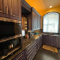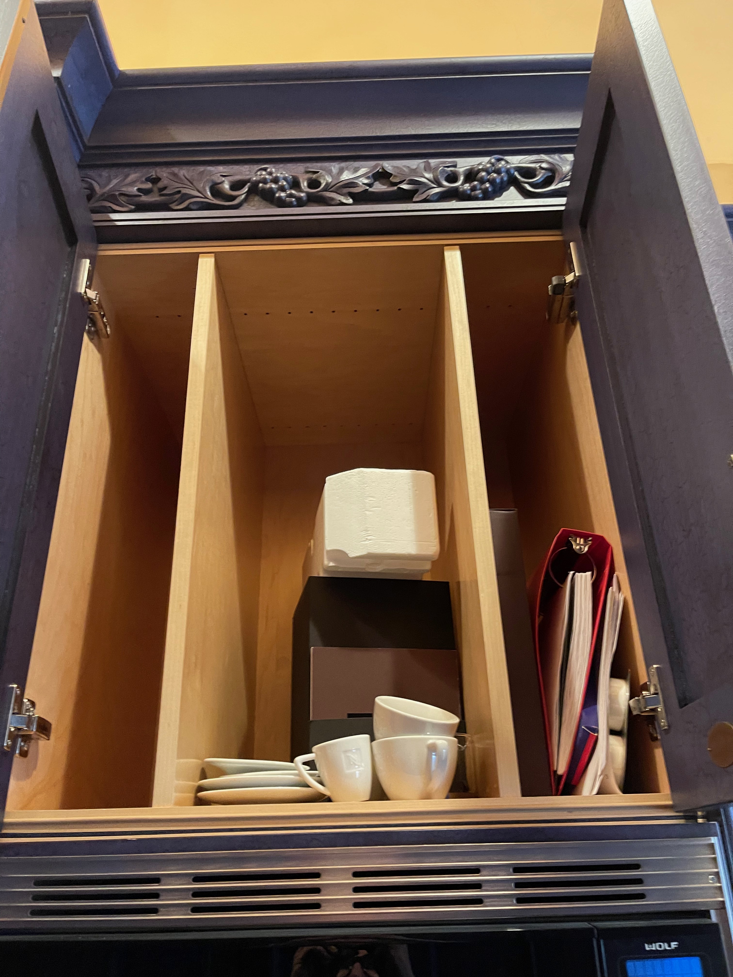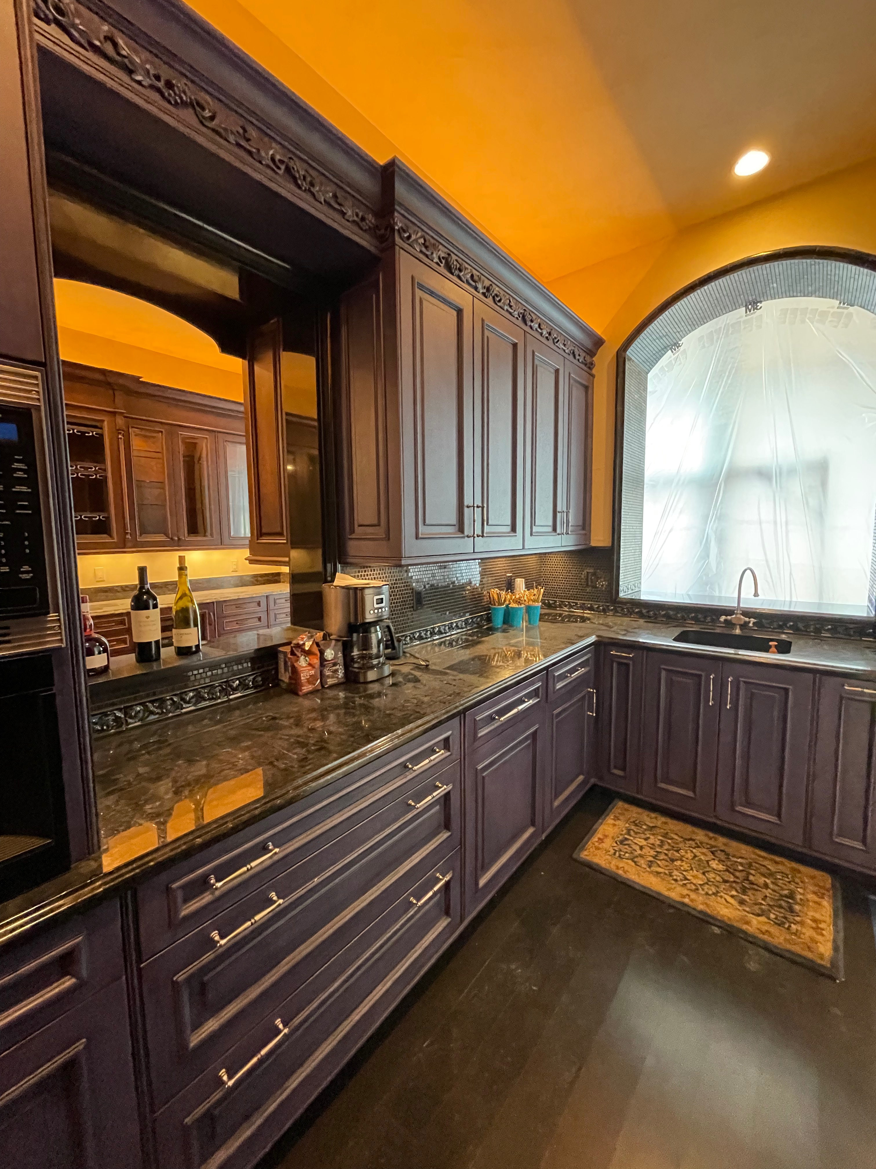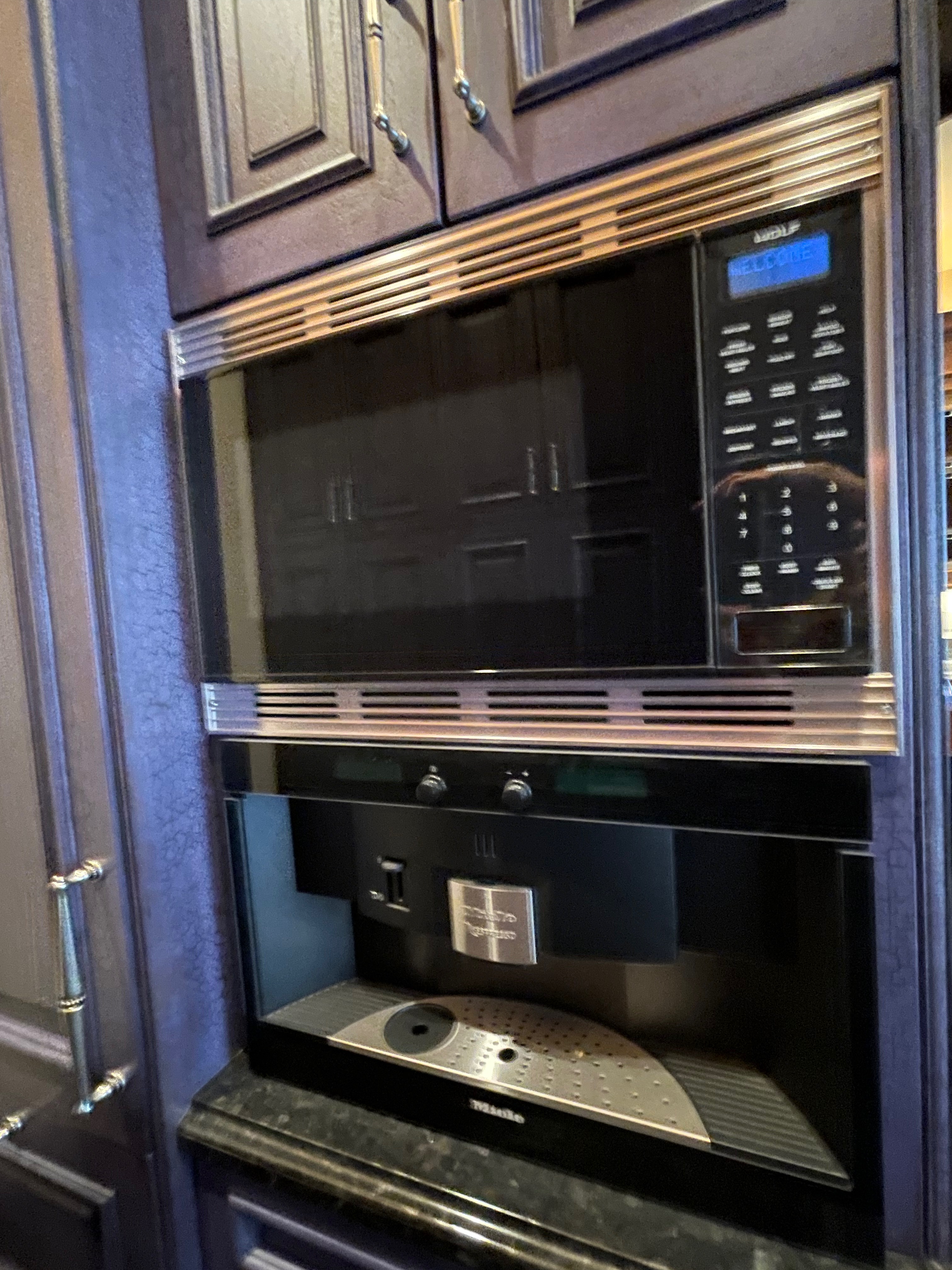 1-Two door counter cabinet that holds the microwave and coffee system Dim.: 27”w x 60 ¼”h appliances/cabinet/69 1/8” w/stacked crown x 22 1/8”d