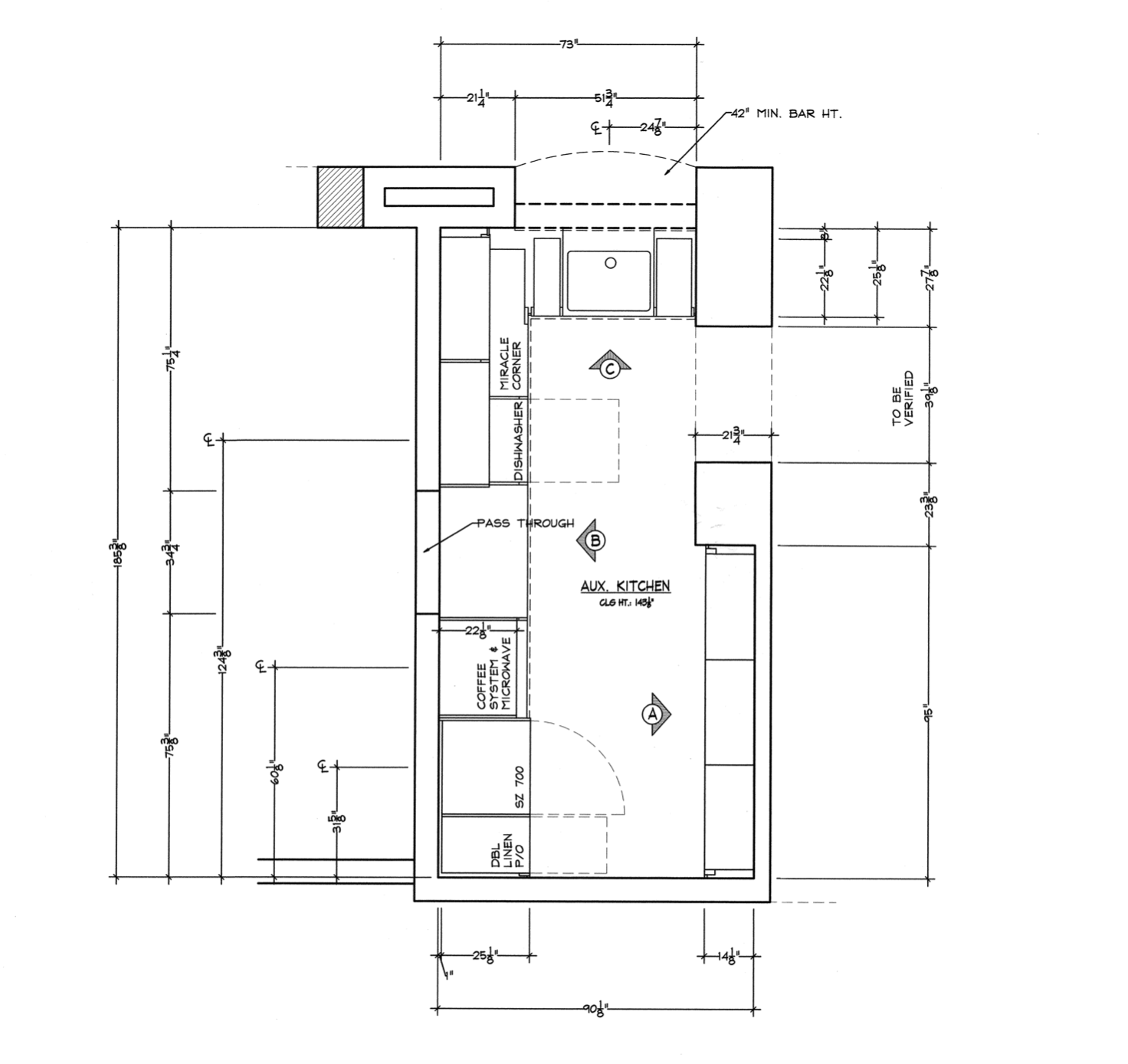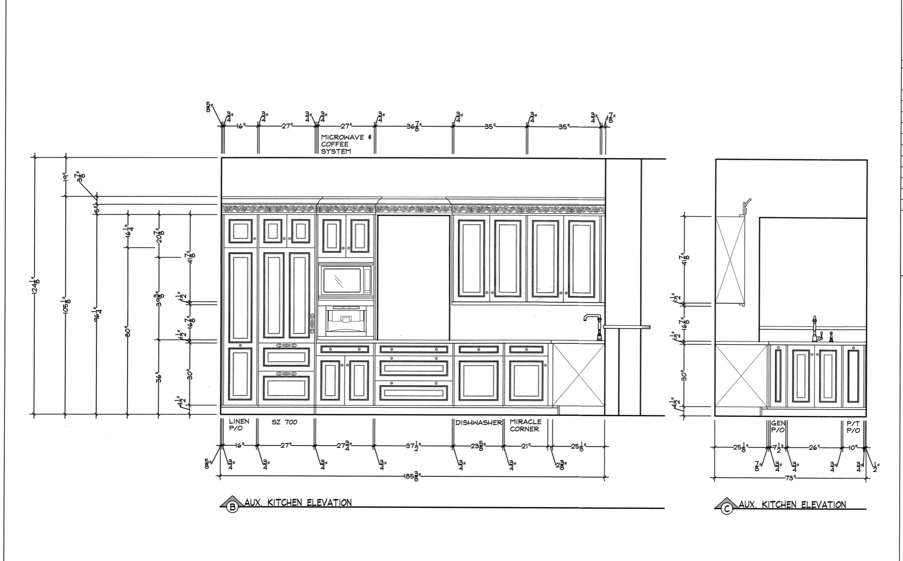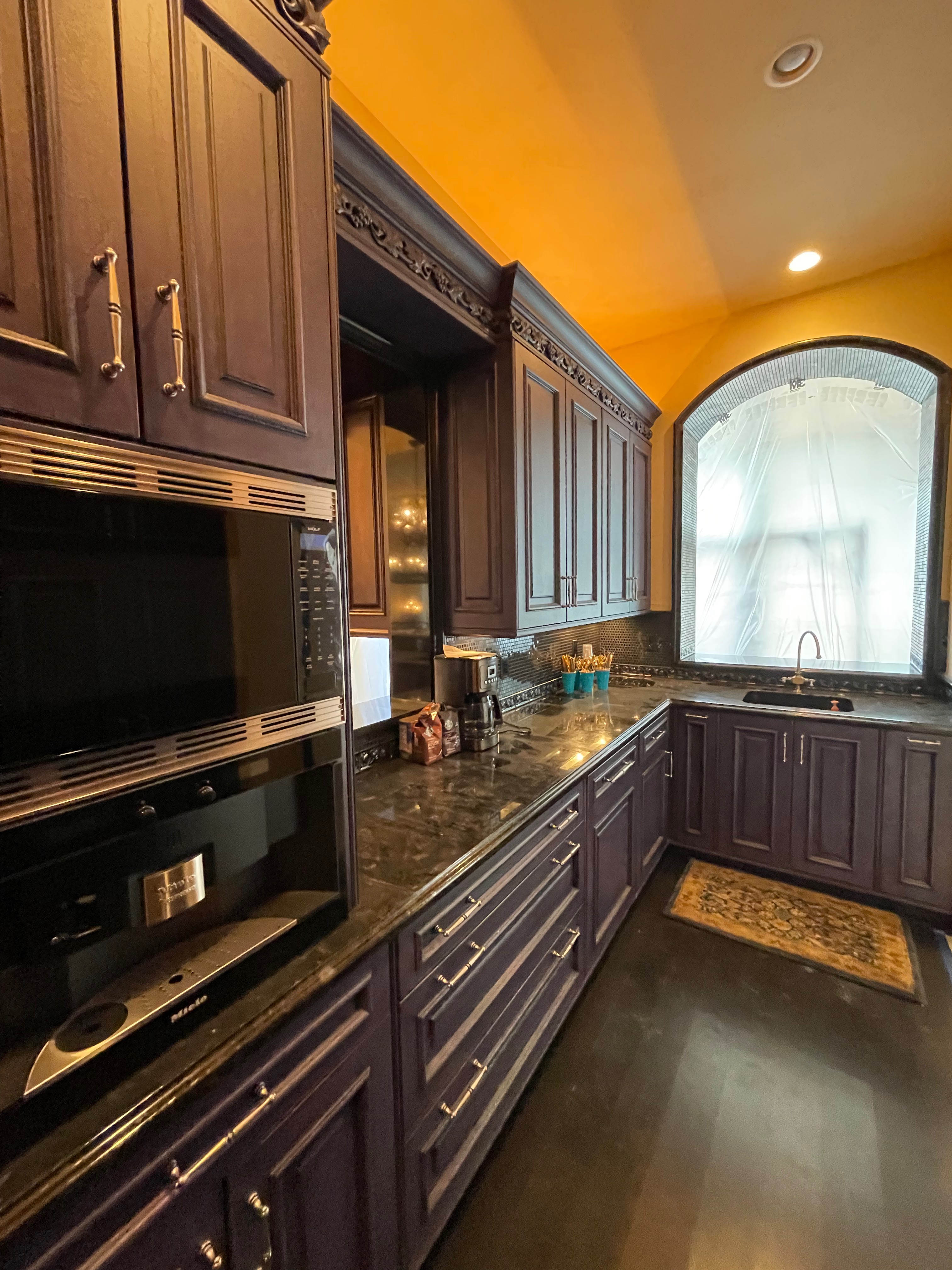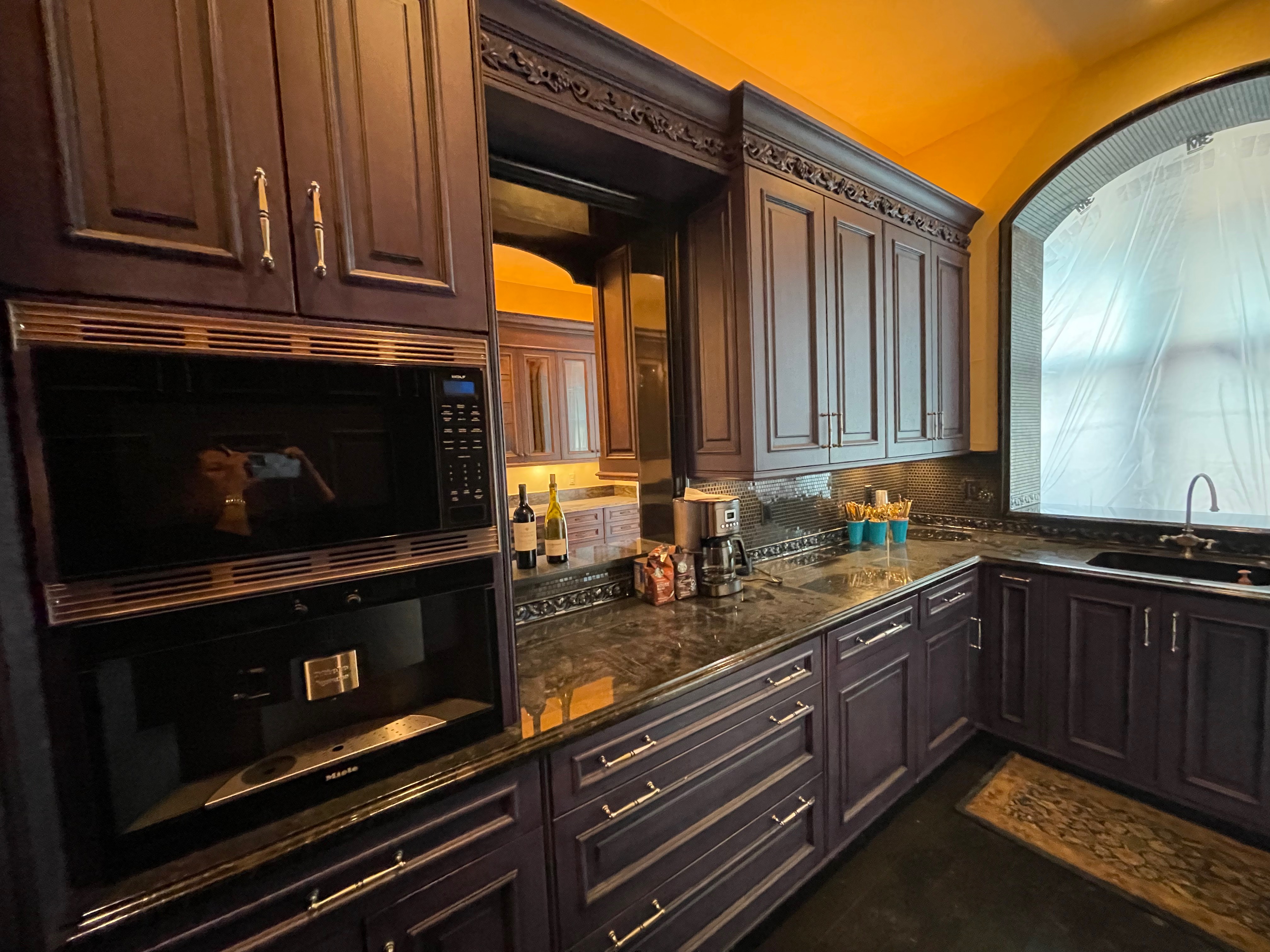 1-Two door counter cabinet that holds the microwave and coffee system Dim.: 27”w x 60 ¼”h appliances/cabinet/69 1/8” w/stacked crown x 22 1/8”d