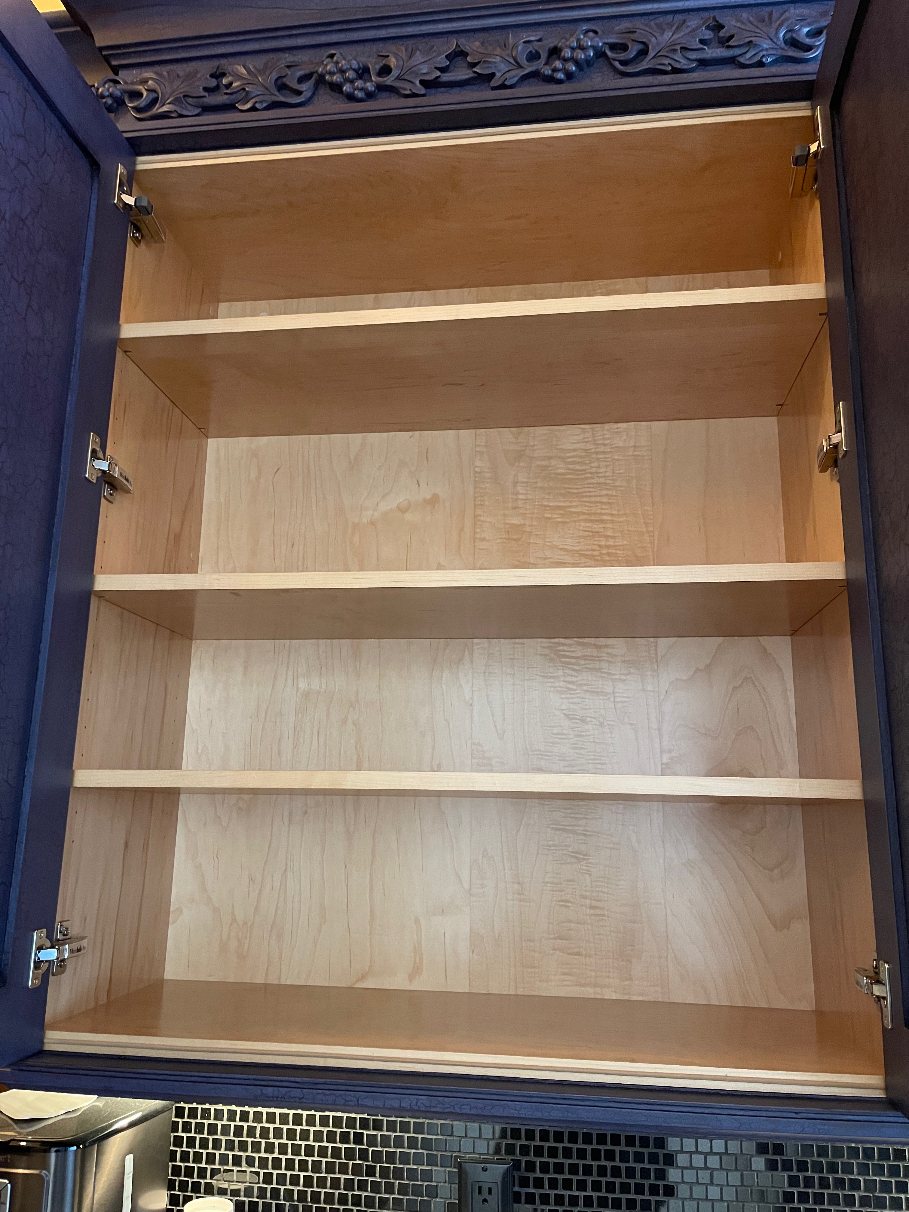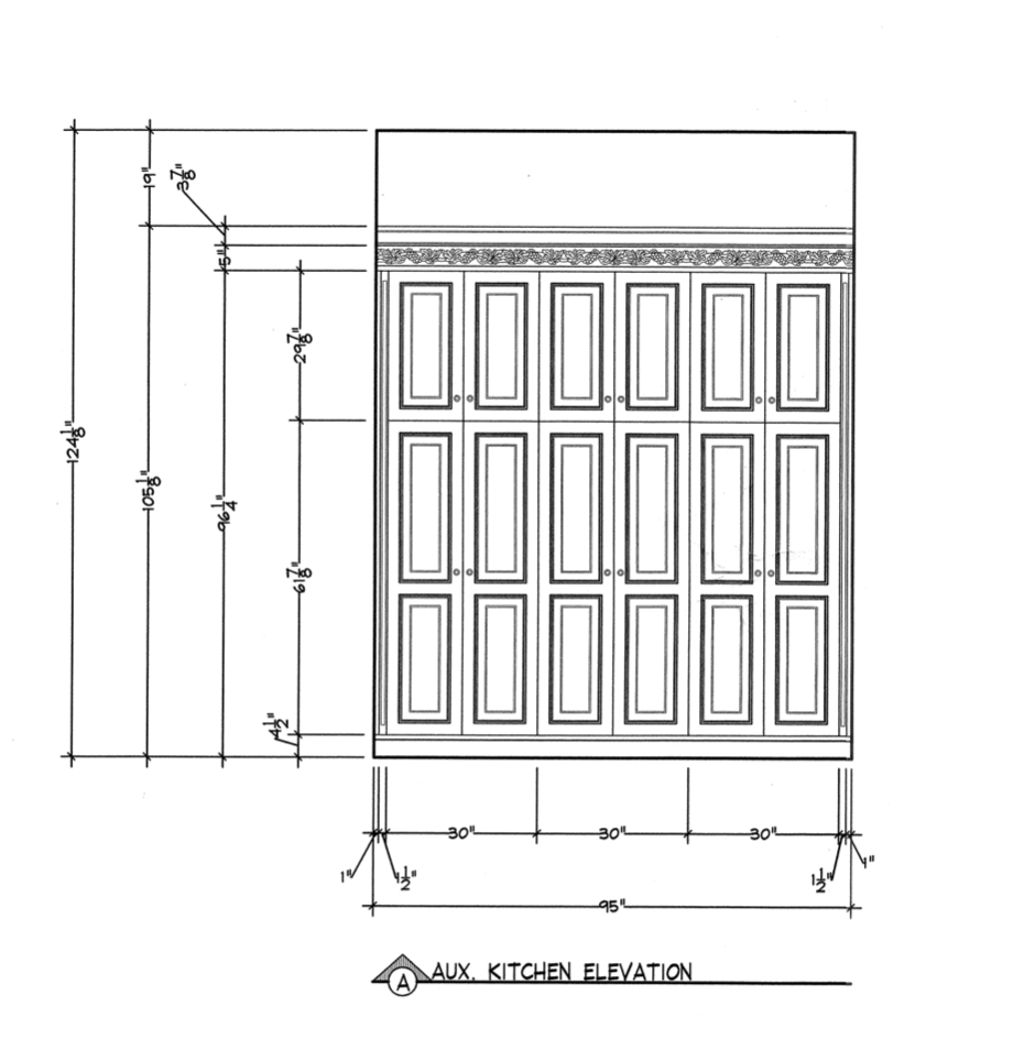 1-Two door cabinet over the refrigerator Dim.: 27”w x 16 ¼” cab.only/25 1/8” with stacked crown x 24”d