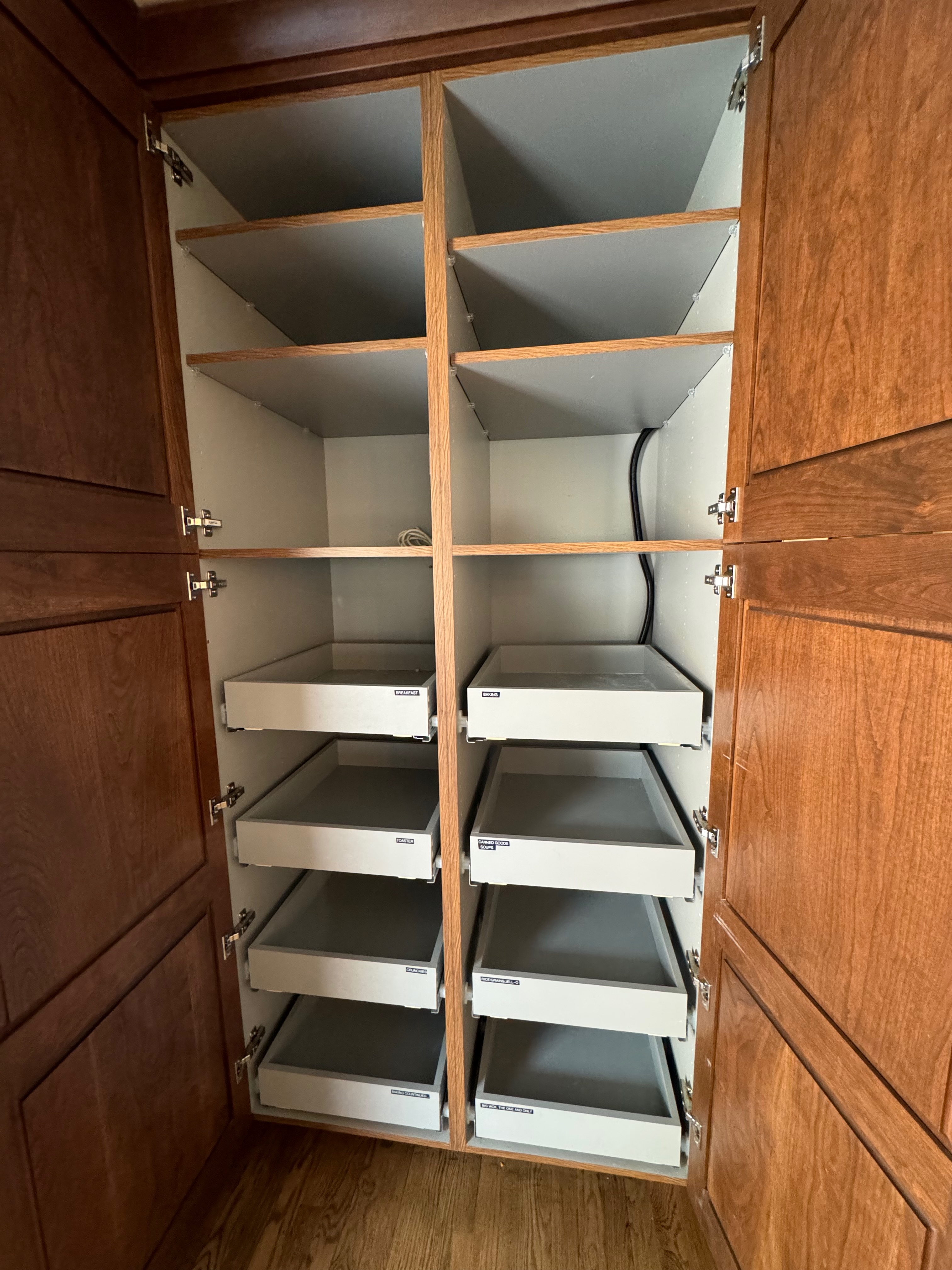 1-Four door pantry double tall cabinet w/ 8 pull out drawers inside Dim.: 42” w x 90” h cabinet only/93 3/8”h w/ crown x 24”d