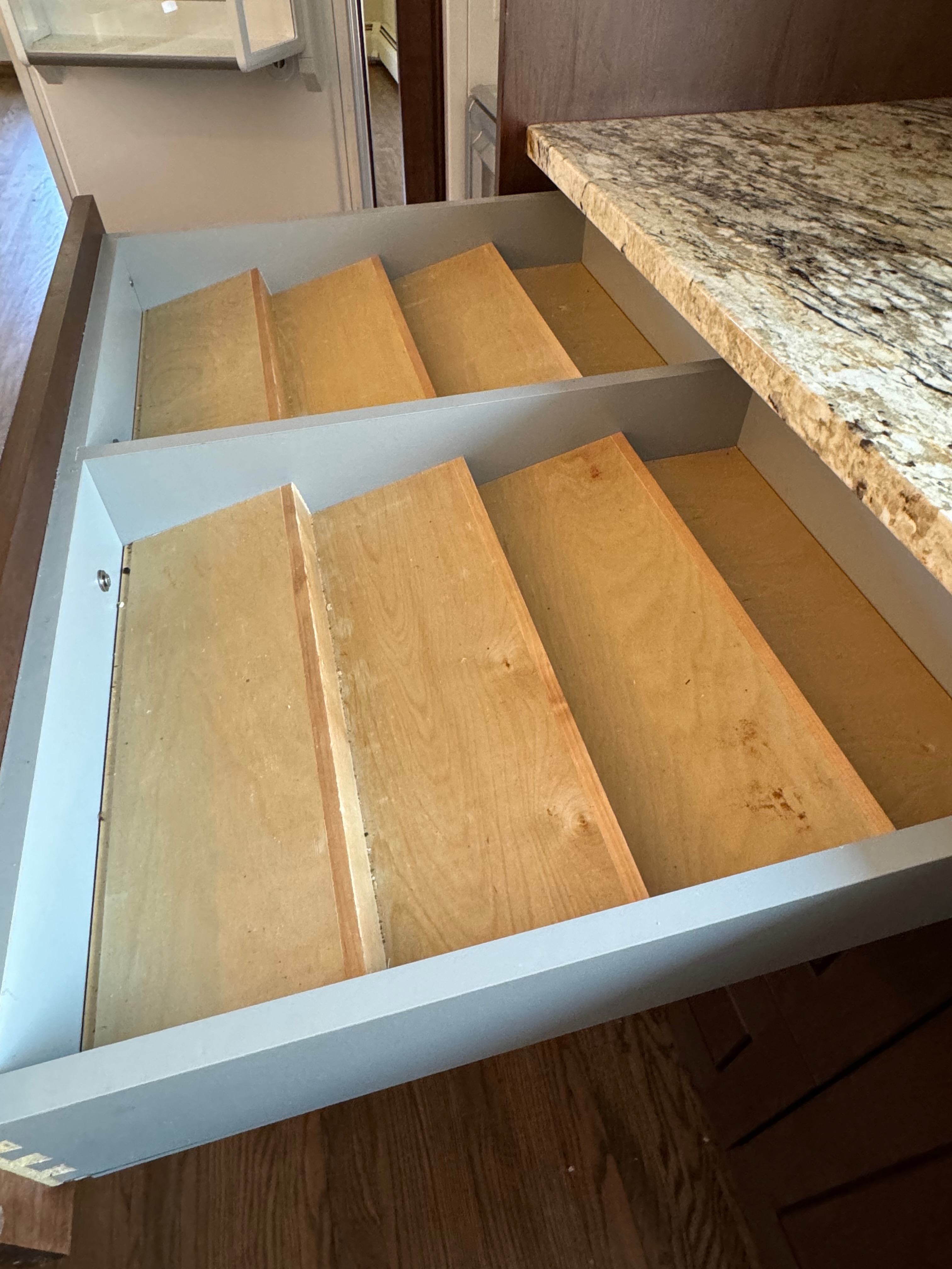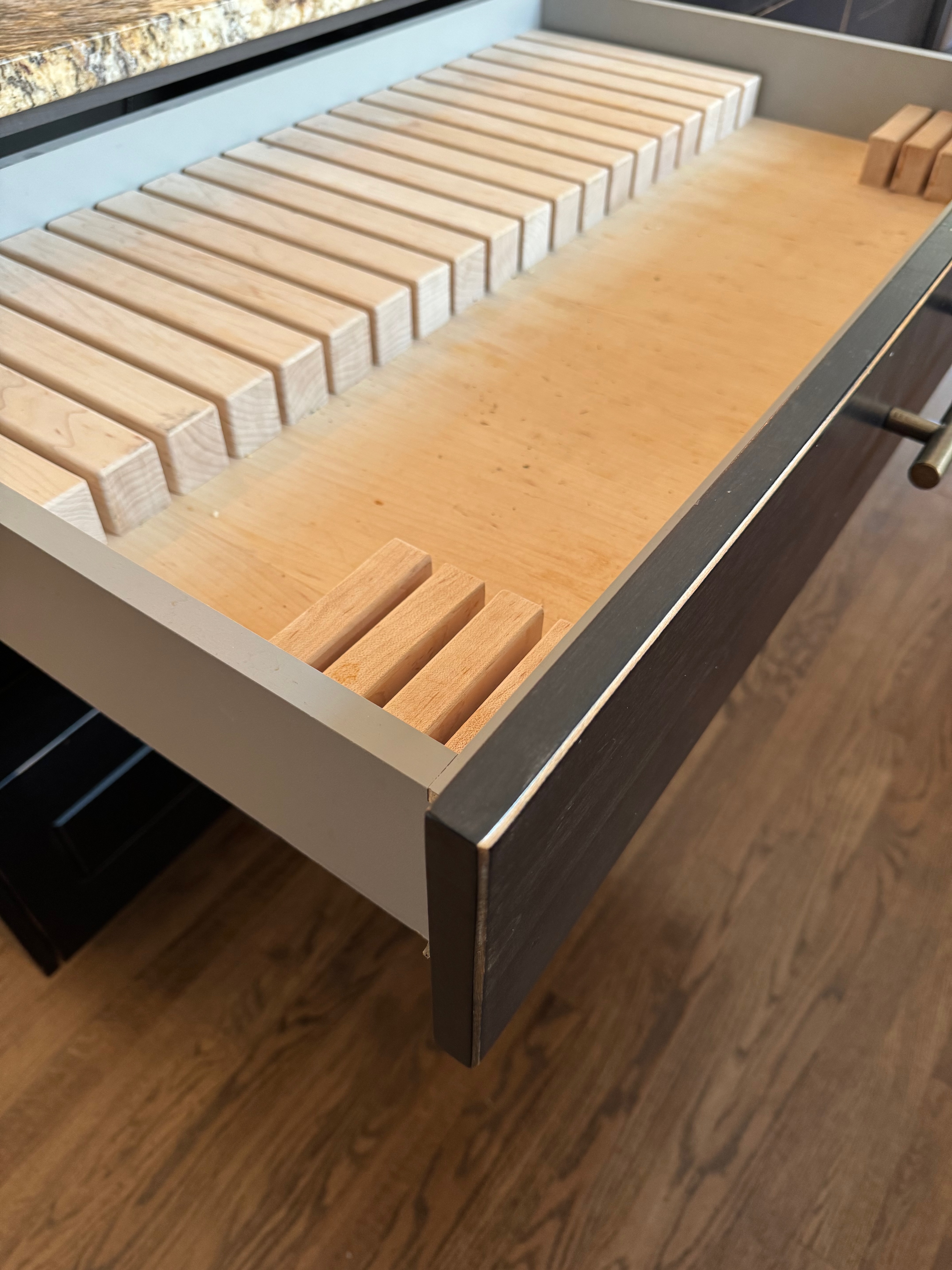 1-Three drawer base cabinet w/ wood spice rack in the top drawer Dim.:33” w x 34 ½”h/36”h x 24” d