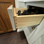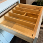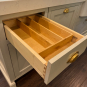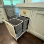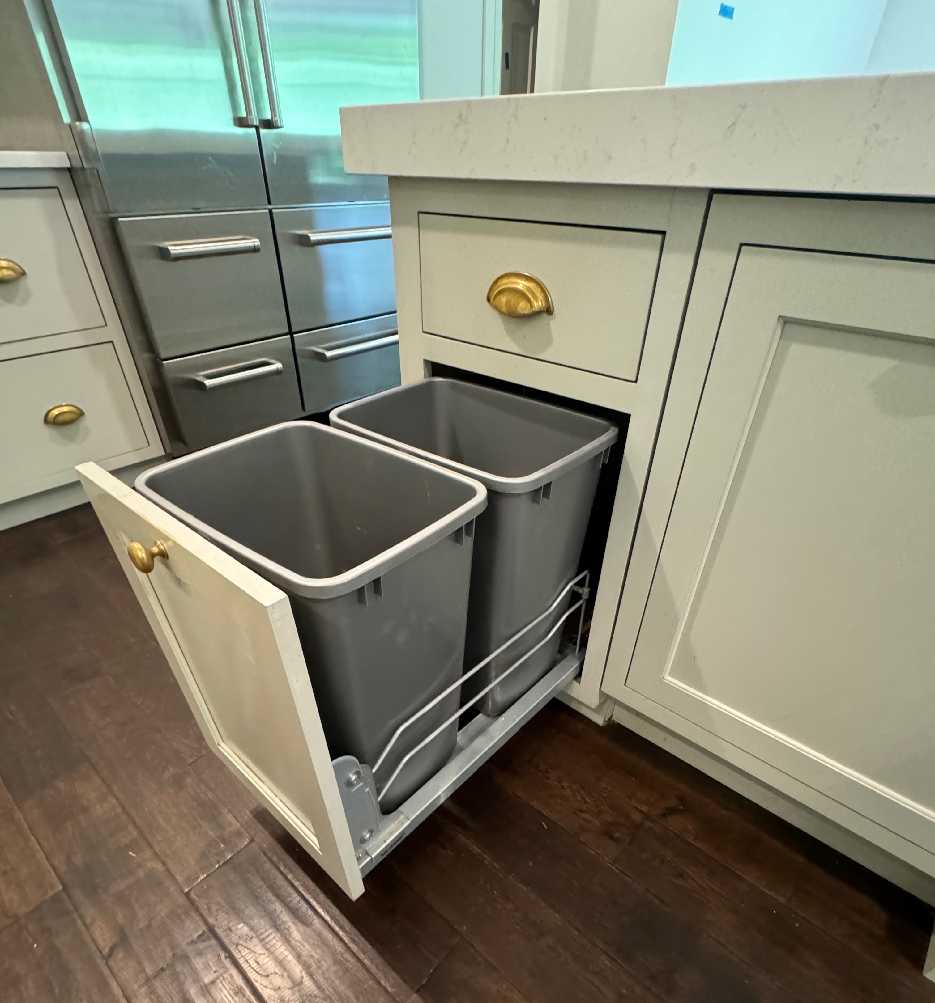 1-One drawer w/wood utensil dividers, One door base cabinet w/ 2 trash cans Dim.:18” w x 36”h X 24”d