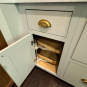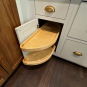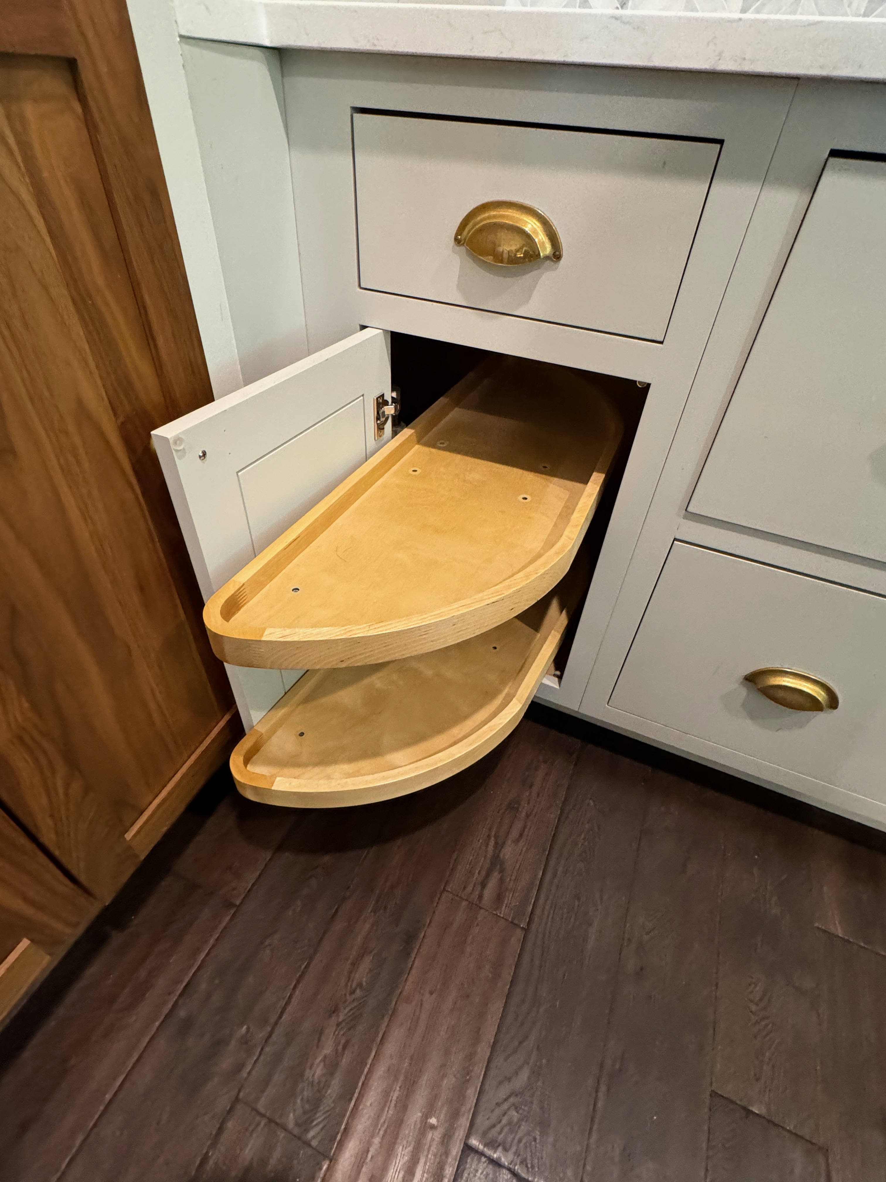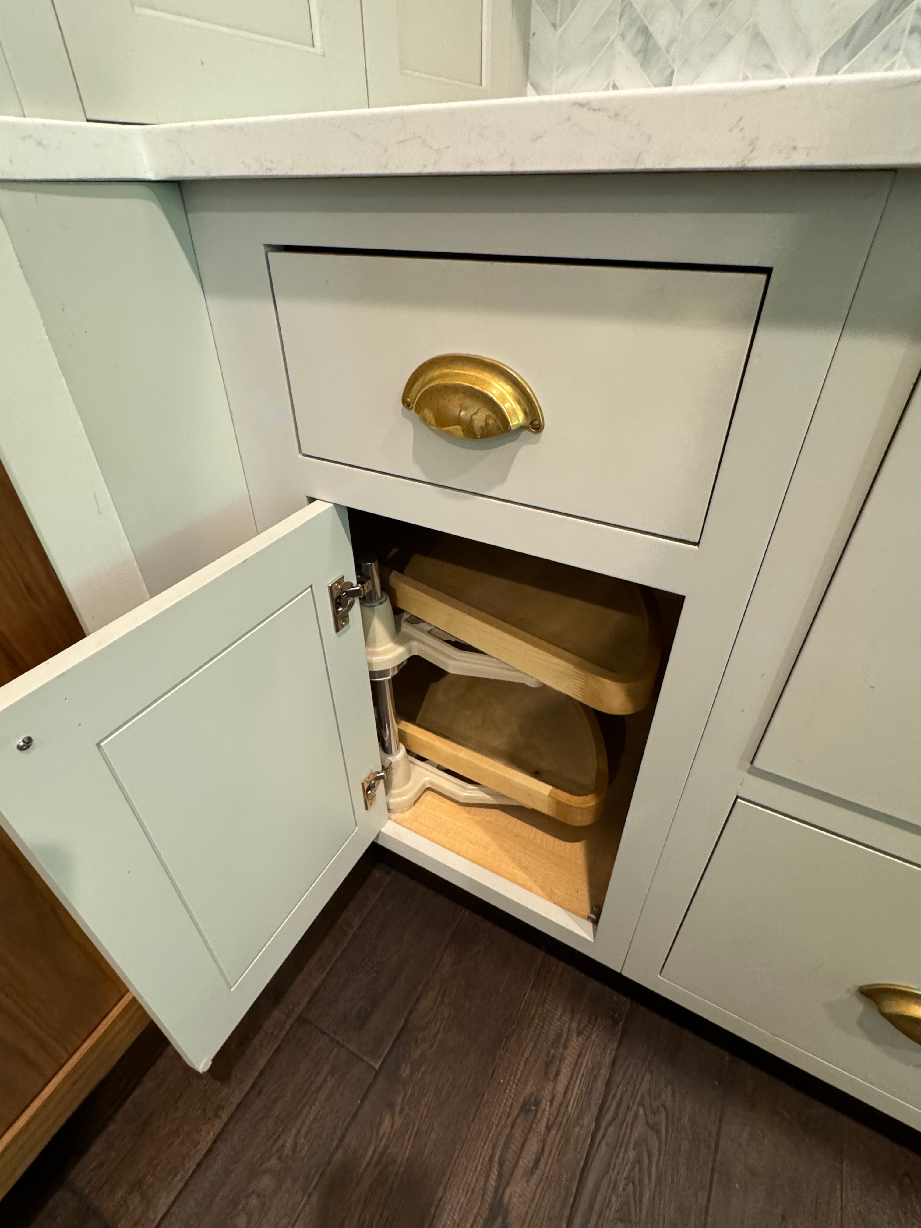 1-One drawer, one door blind corner cabinet dimensions, with blind corner organizer pull-out shelving w/ soft close ($659) Dim.: 40 ½” w x 36” x 24”d