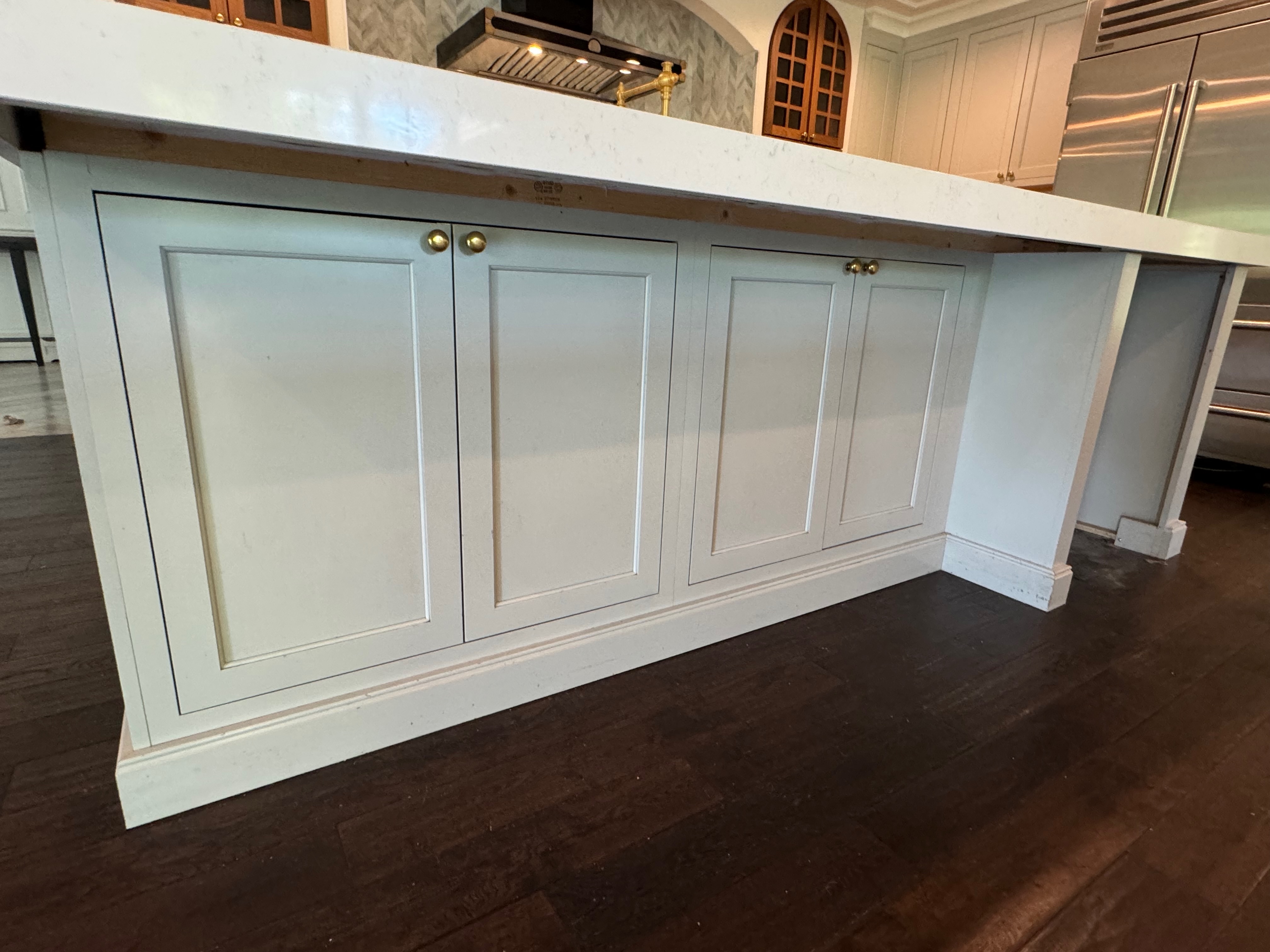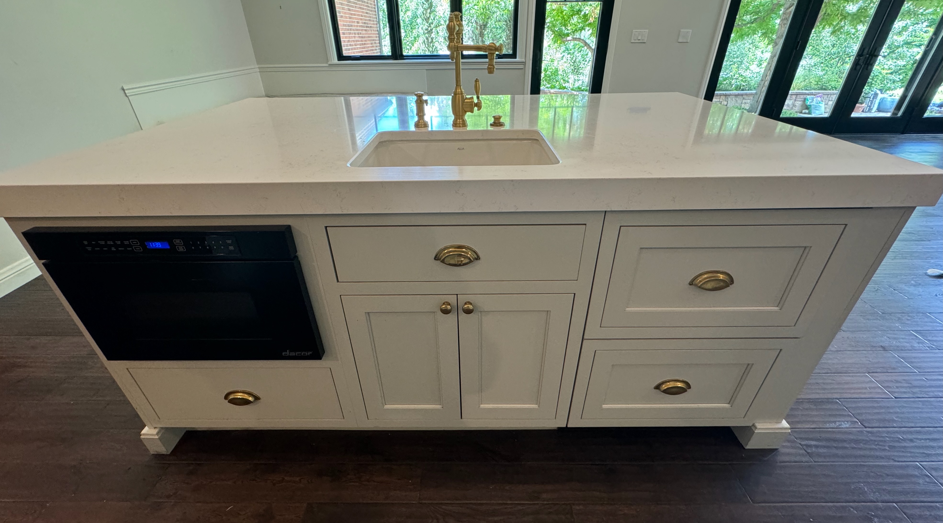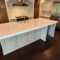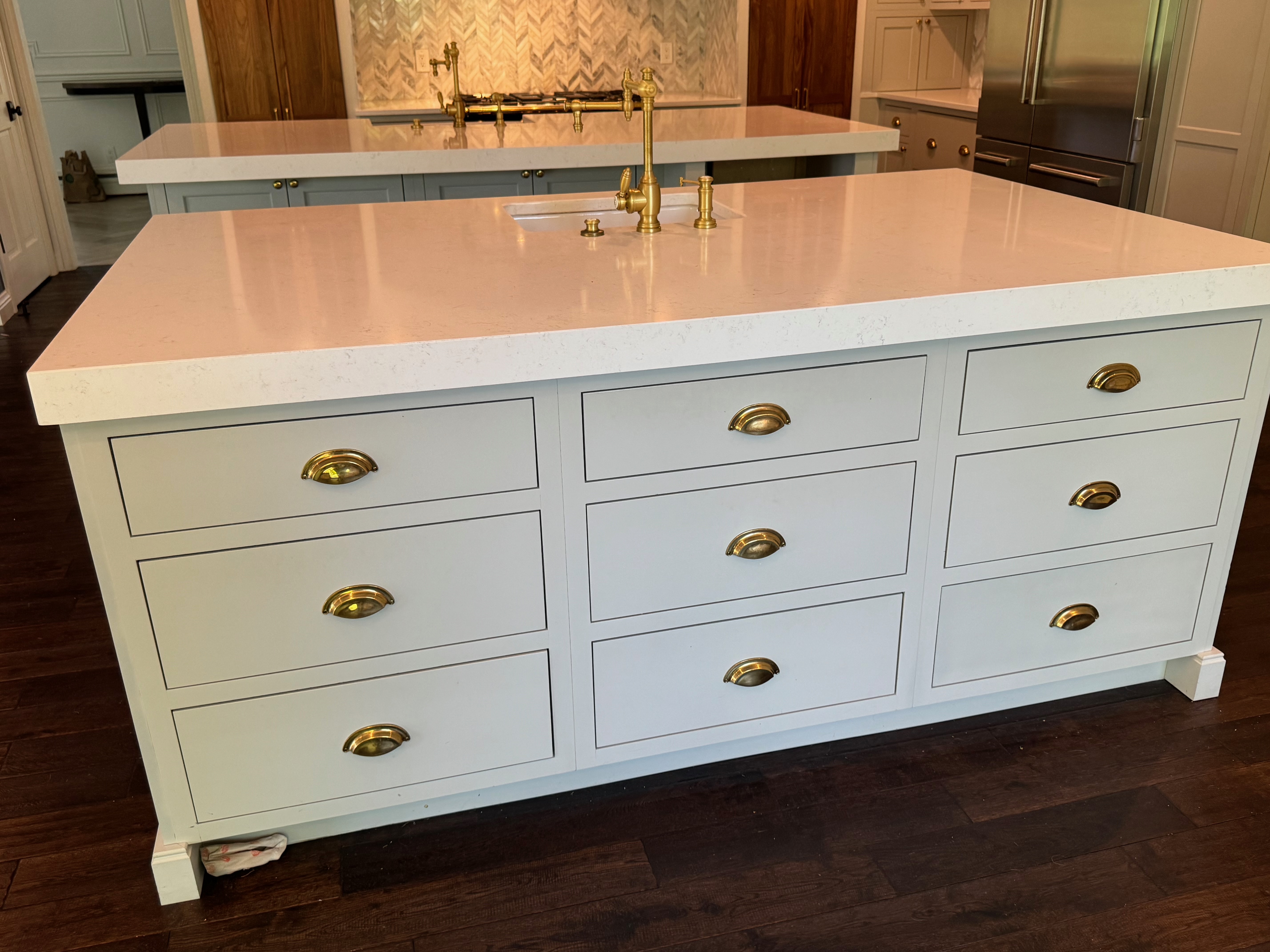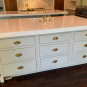 ISLAND #1-Dimensions 110” x 1/4 X 49 7/8". Cabinets overall dimensions: 106” x 48” this island. The island has a Shaw classic farmhouse sink measuring 30” w x 10”h x 24”d