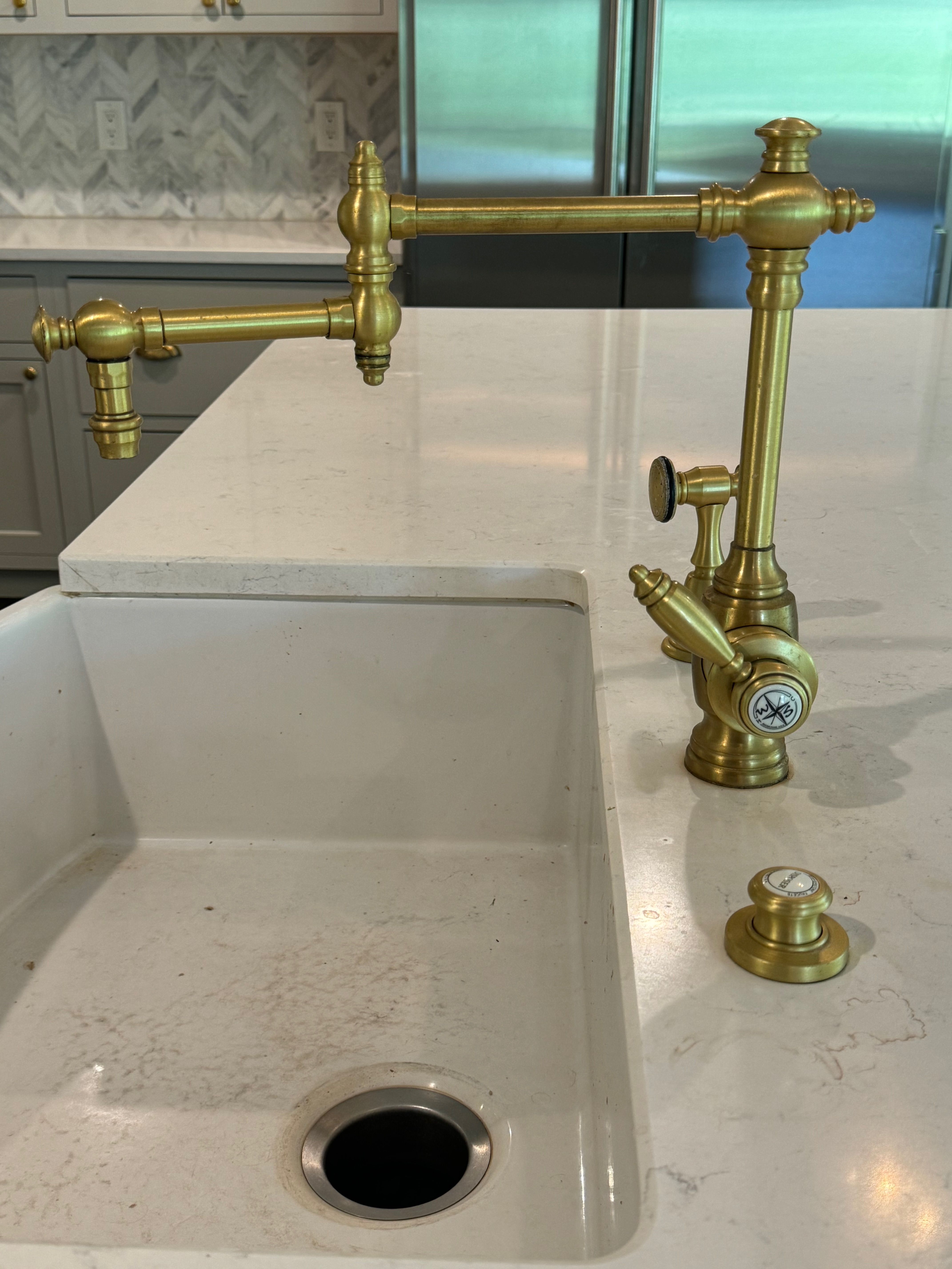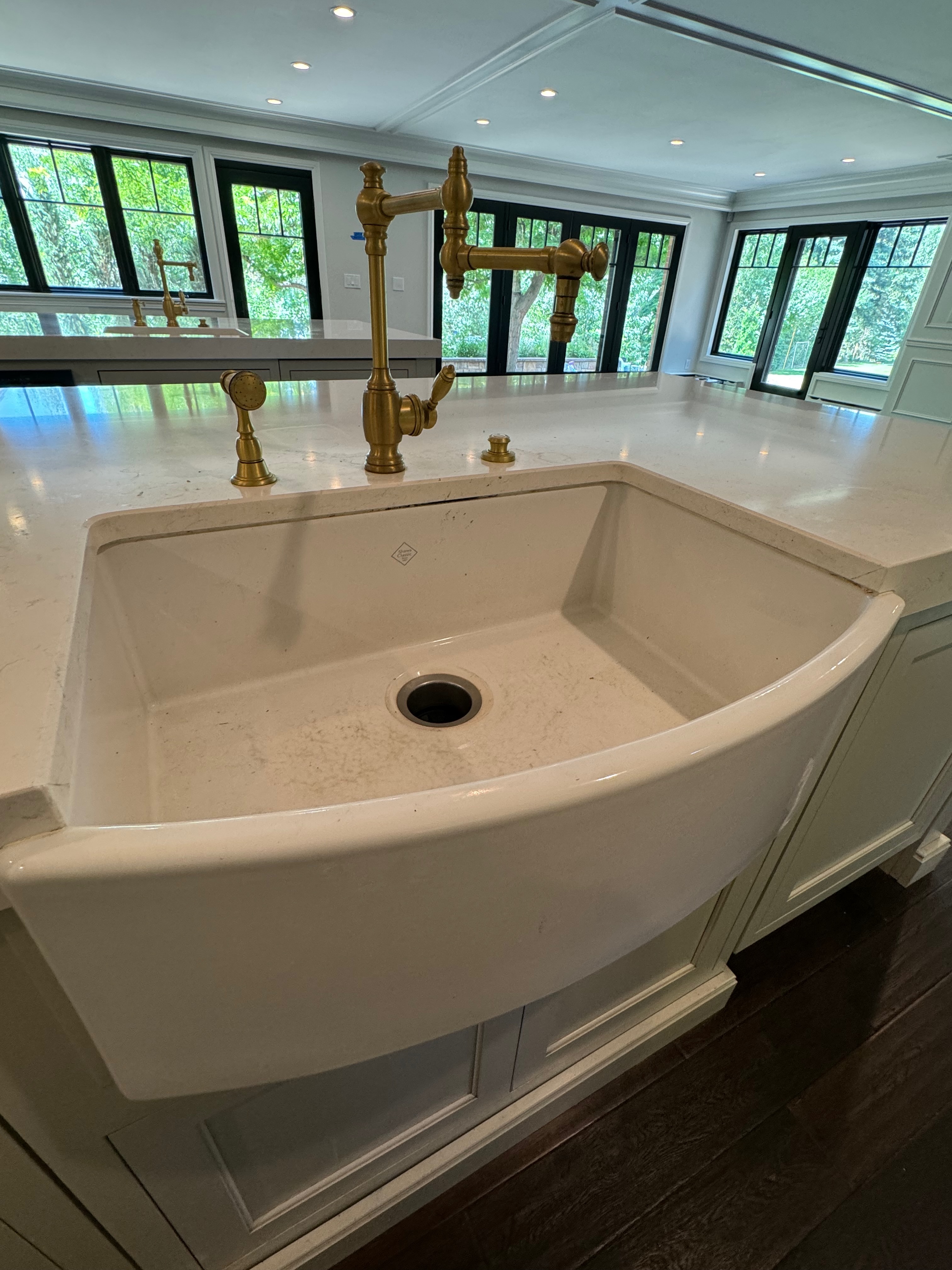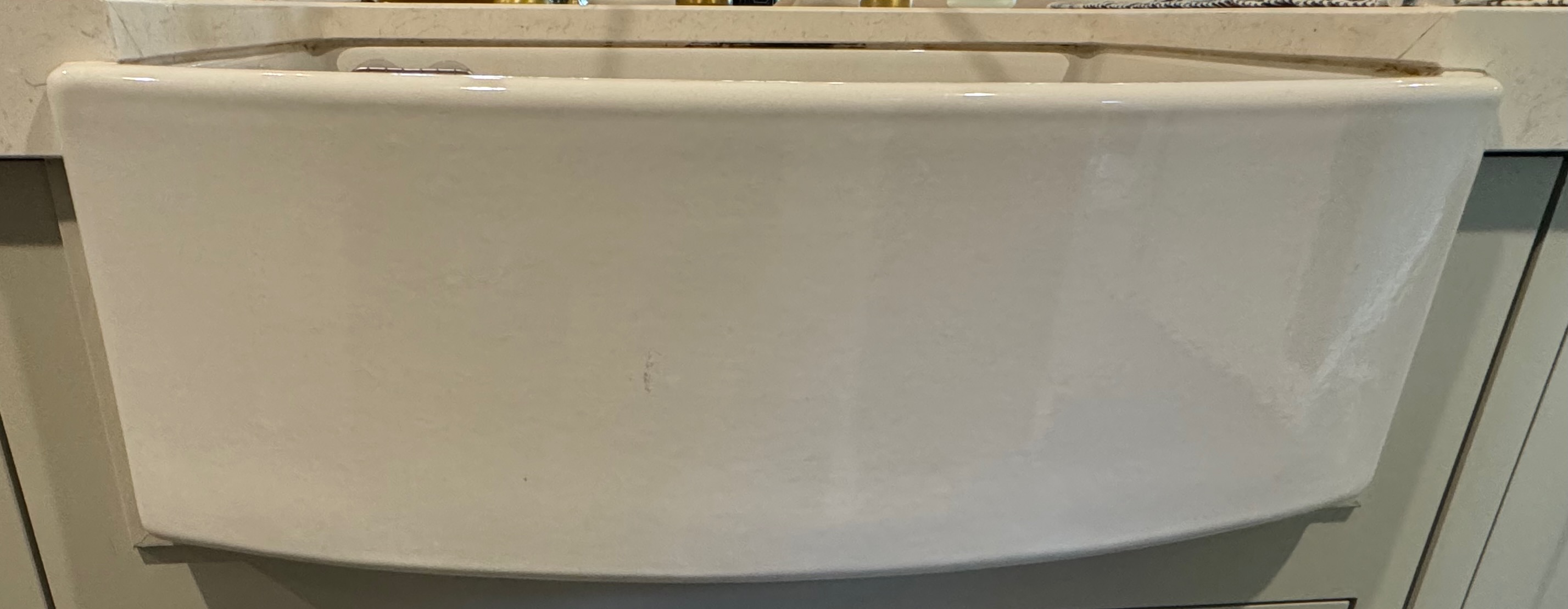 1-Two door Farmhouse sink base Dim.: 36” w x 26” h x 24” d, Waterstone faucet set in brass, sprayer and disposer Disposal, Retail $5,500