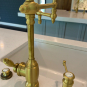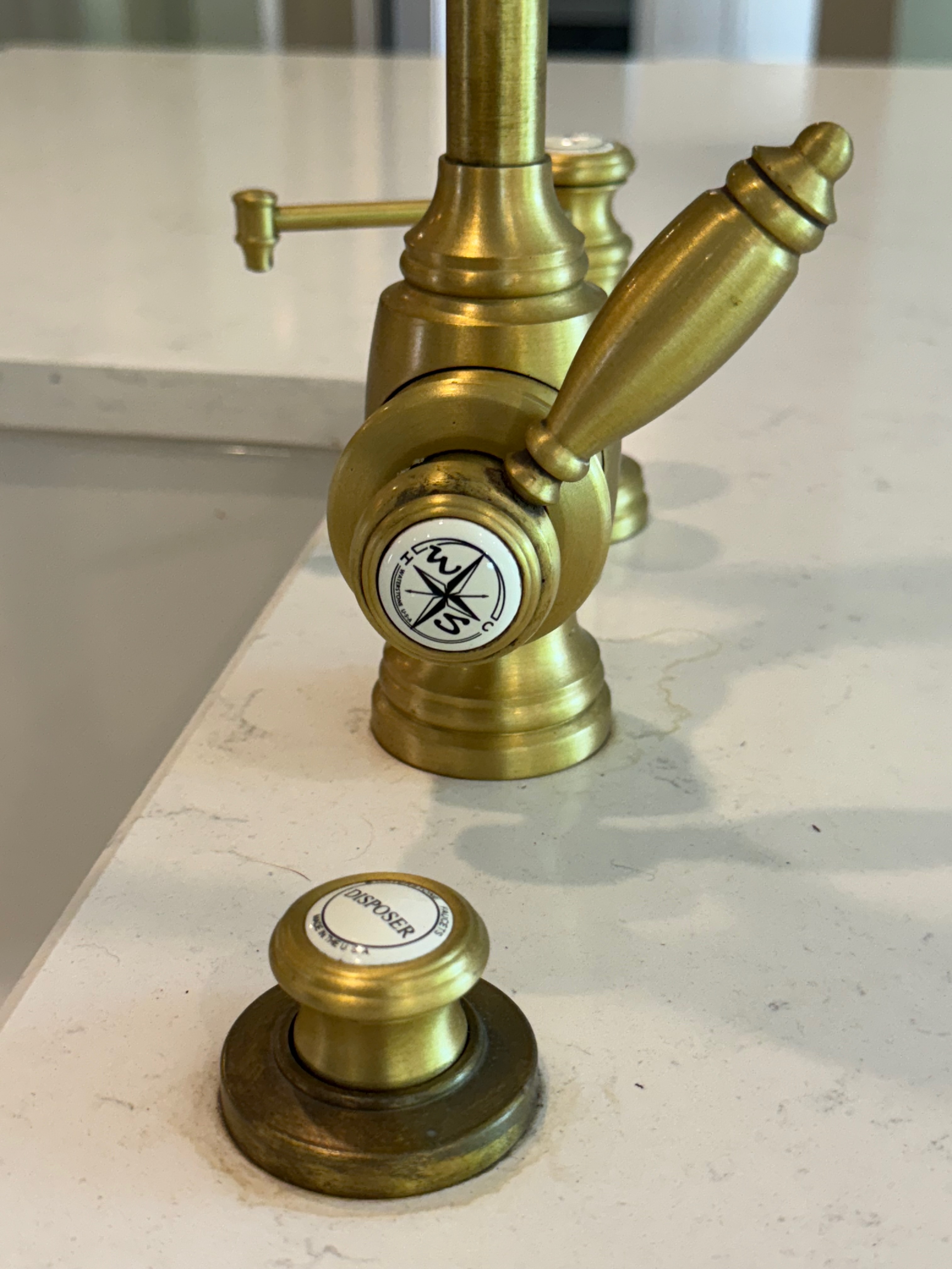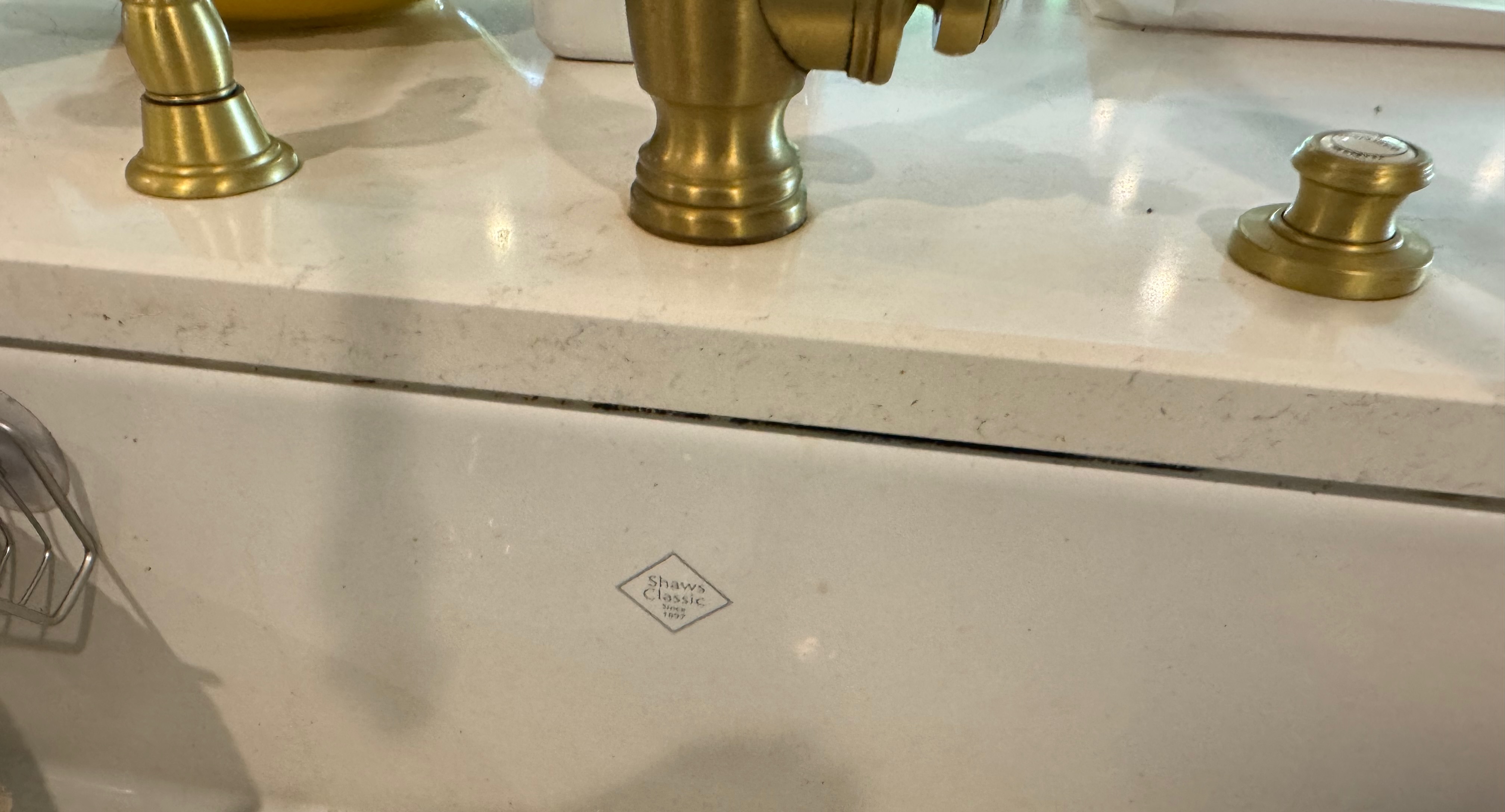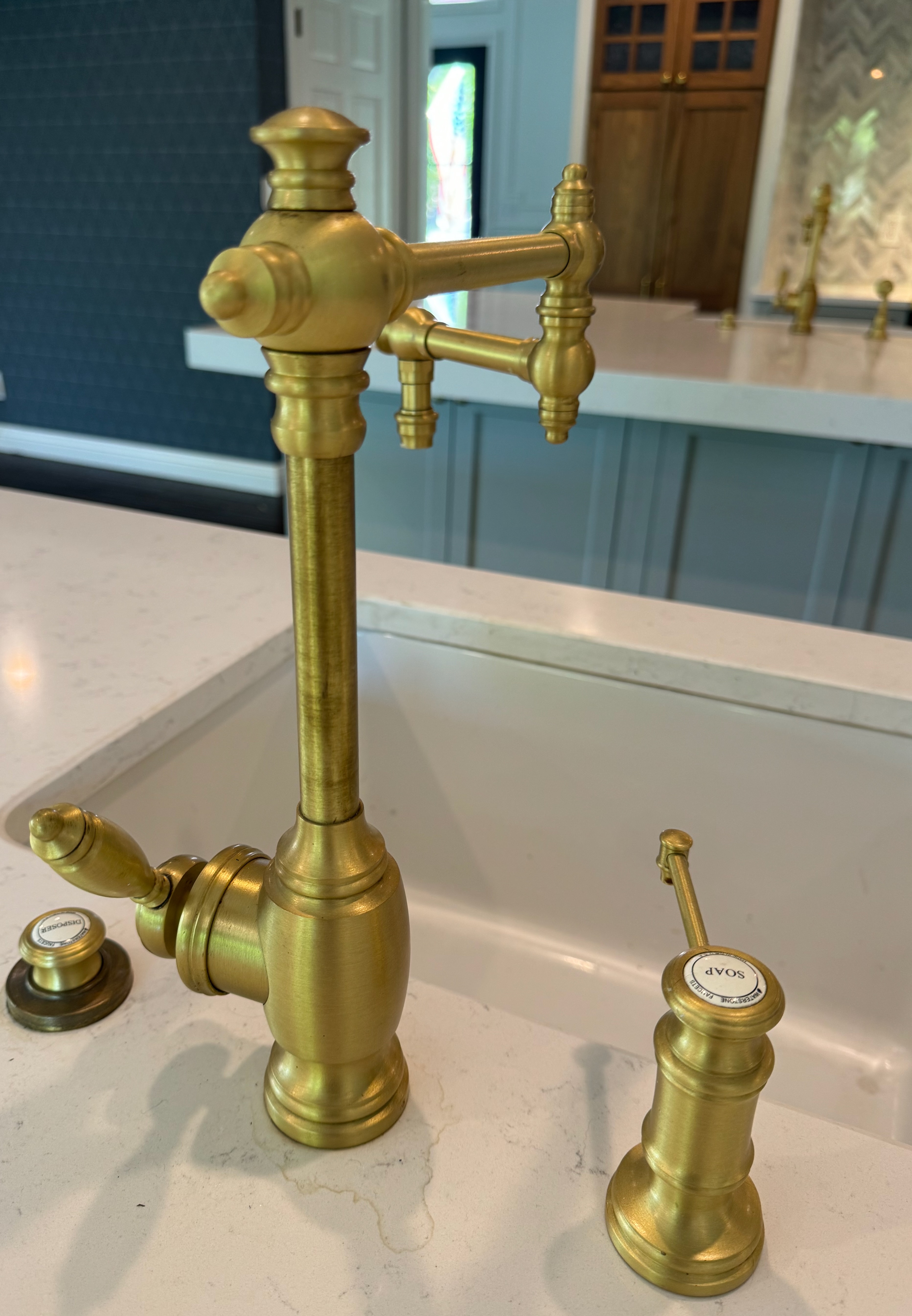 1-Two door Farmhouse sink base Dim.: 36” w x 26” h x 24” d, Waterstone faucet set in brass, sprayer and disposer Disposal, Retail $5,500