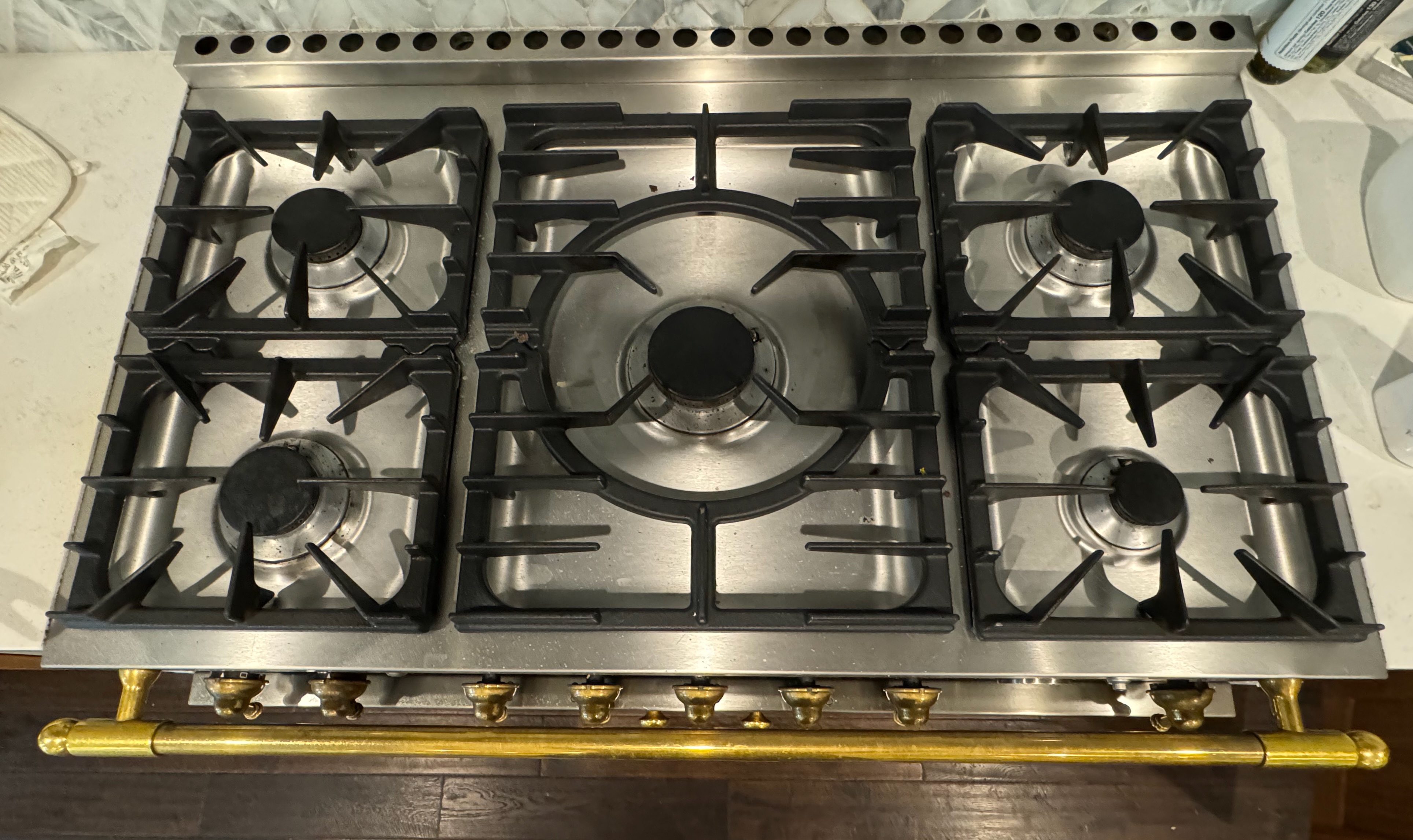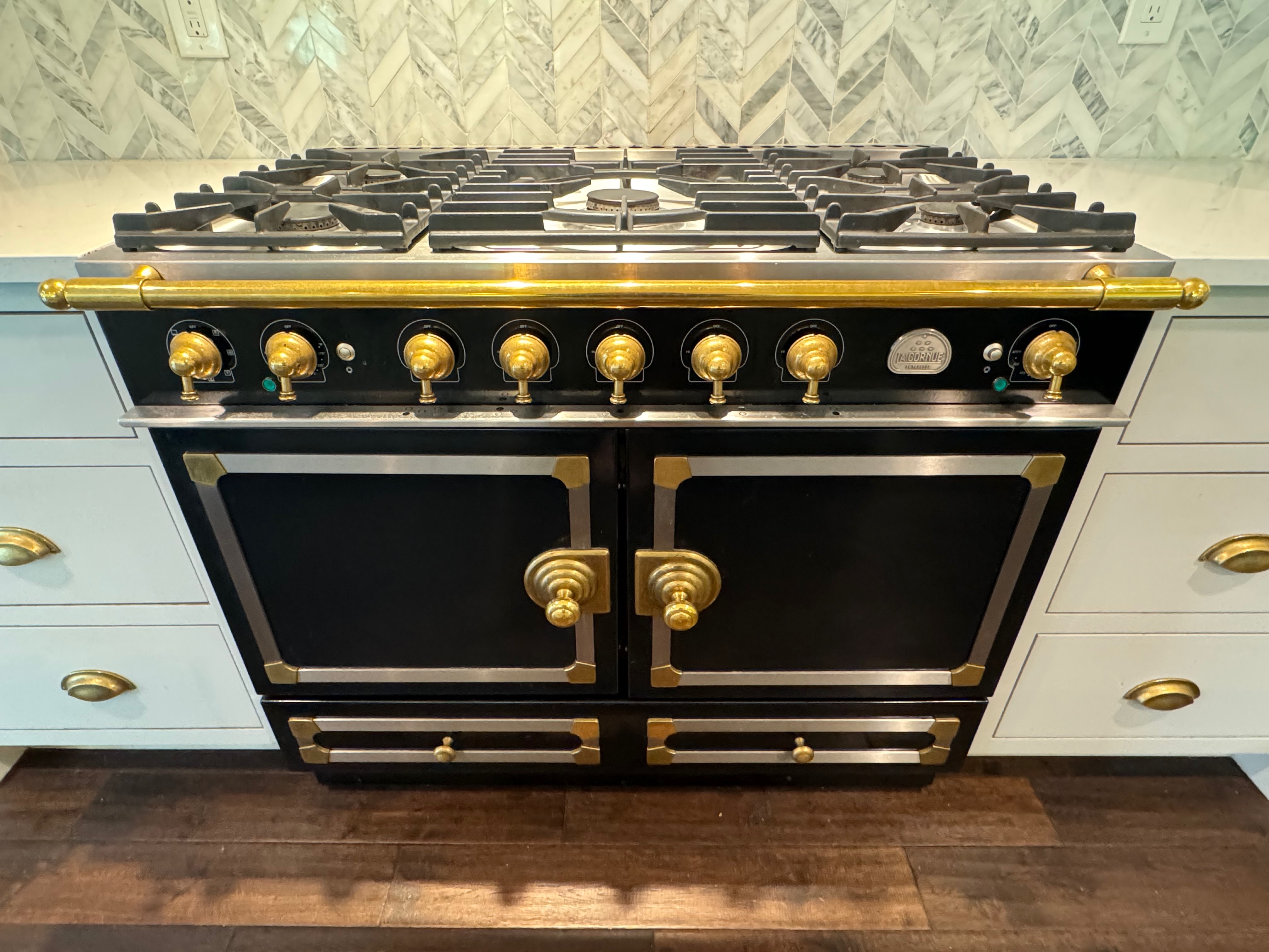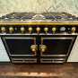 43” La Cornue Cornfu 110 range in black w/ brass hardware, Listing price new $13,275