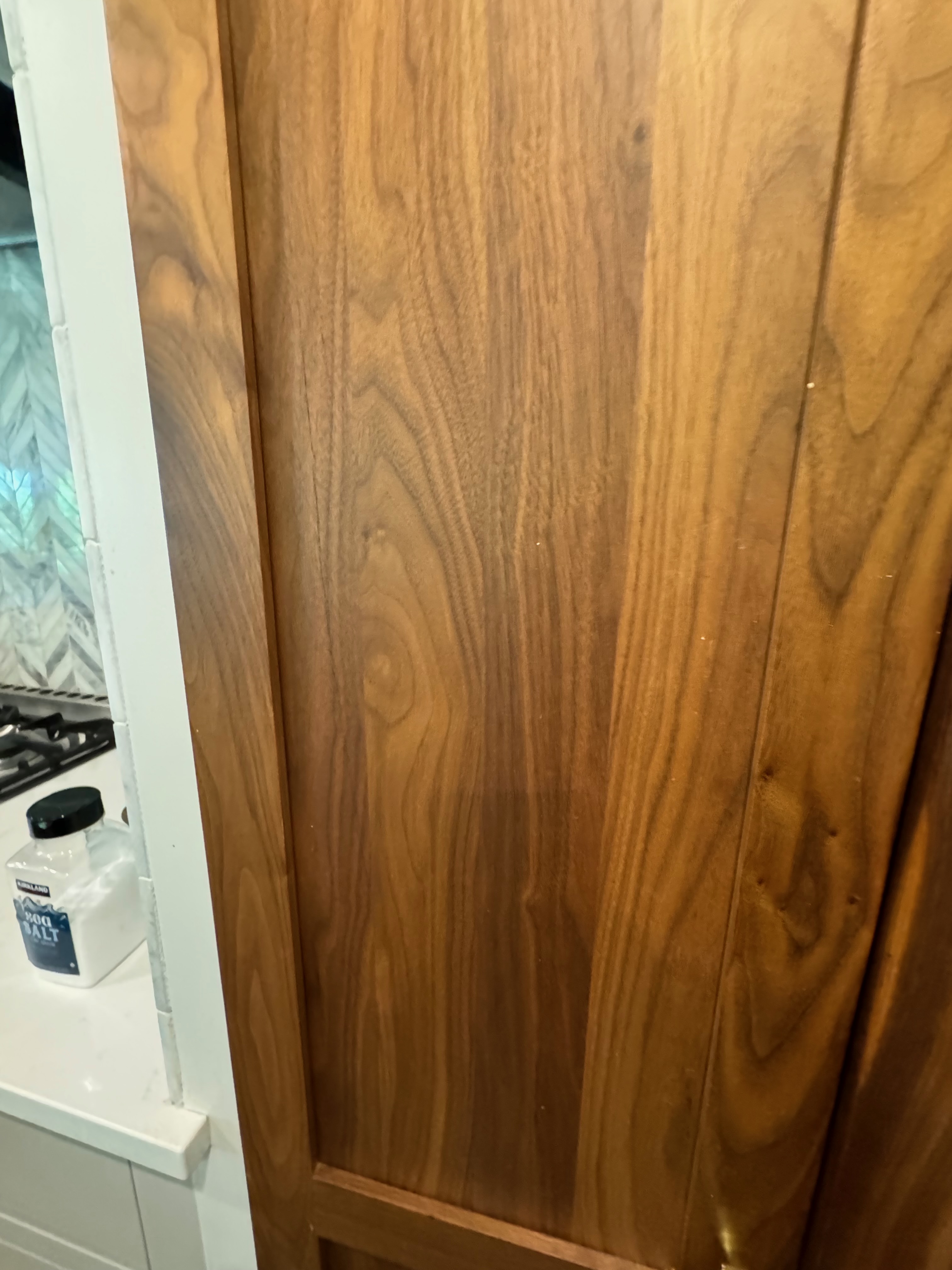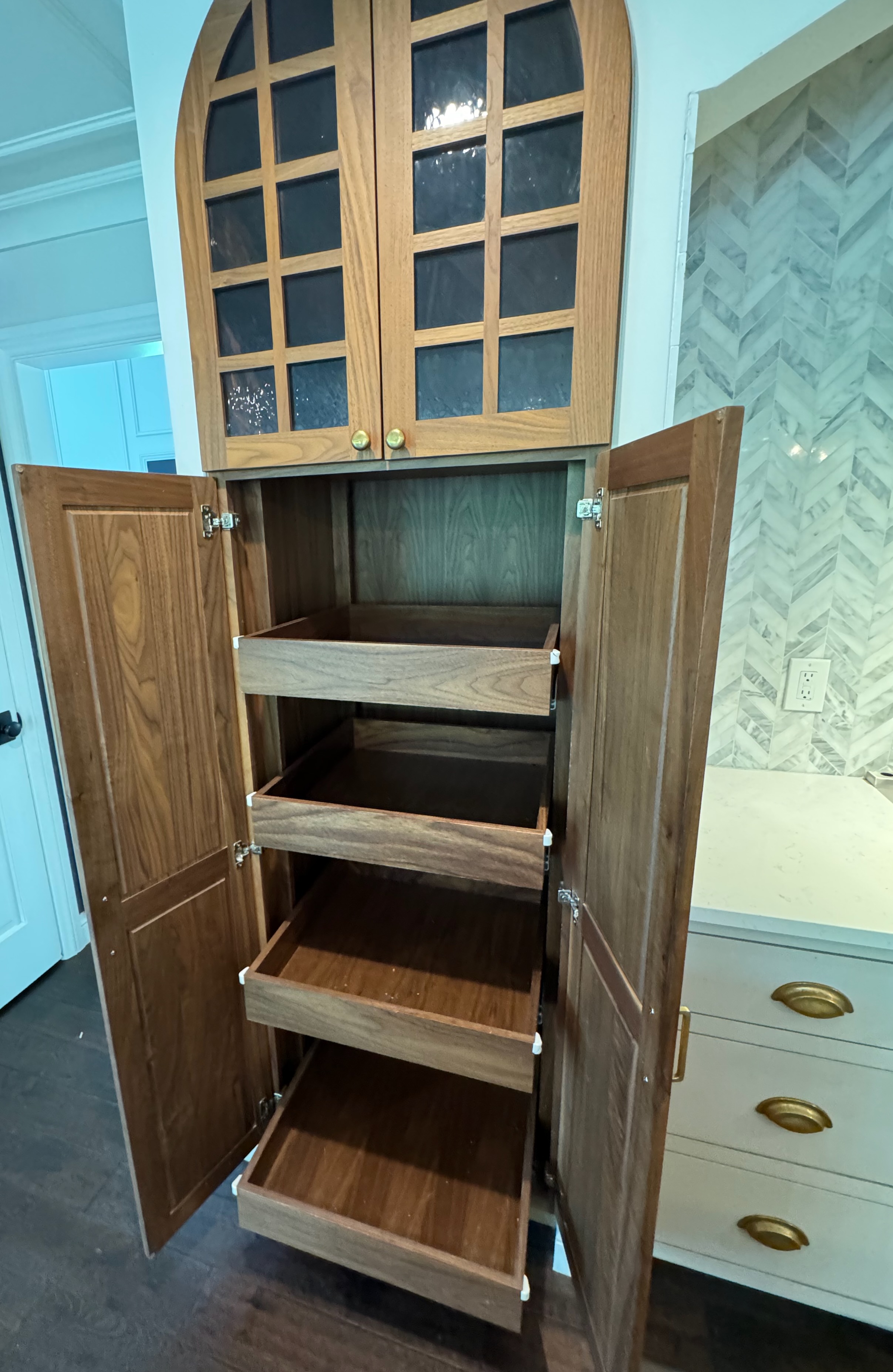 2-Four door Alder wood double tall pantry cabinets w/ four pull-out drawer inserts inside Dim.: 26 ½” w x 88”h/93 ½’h x 24” d