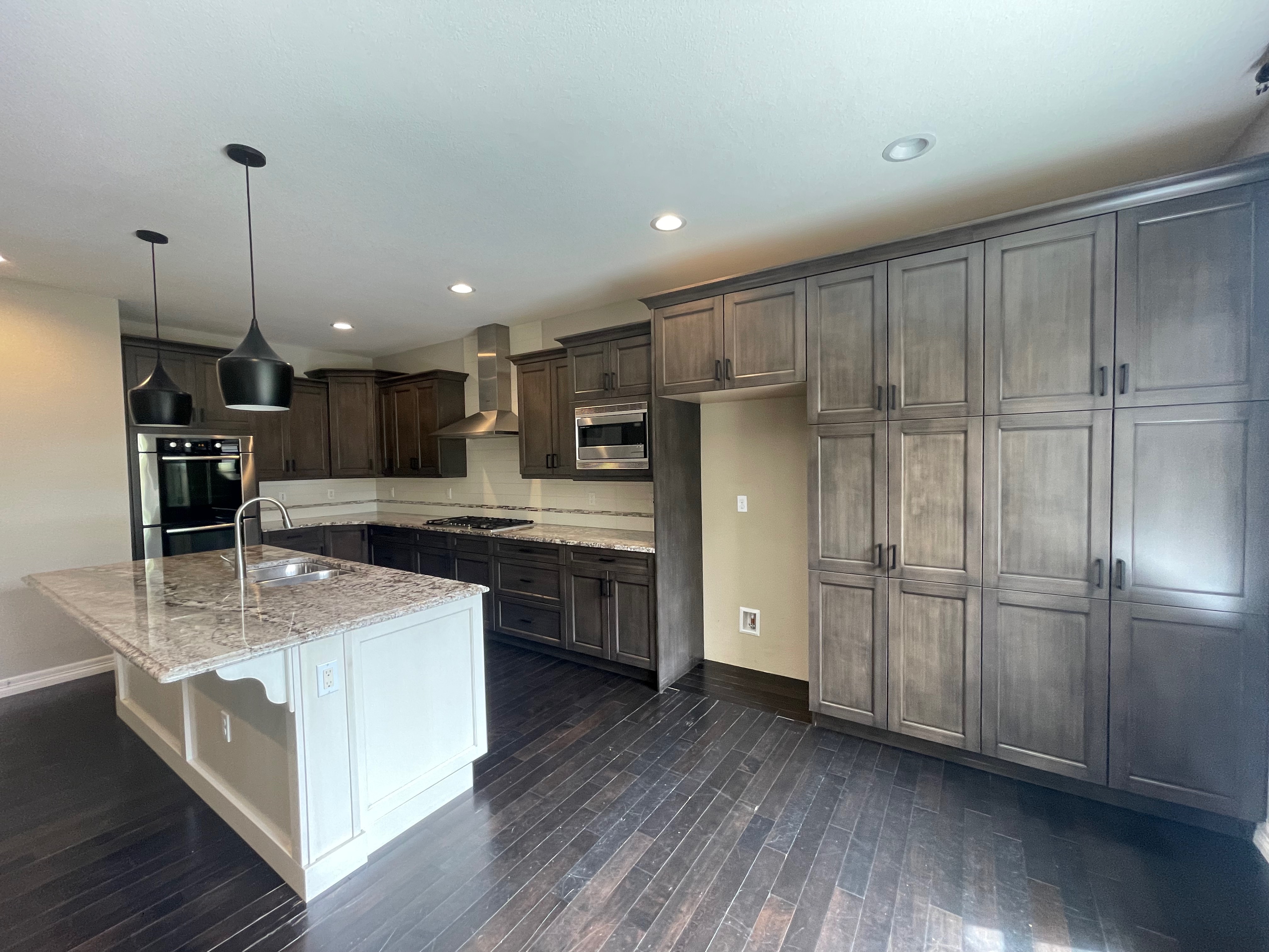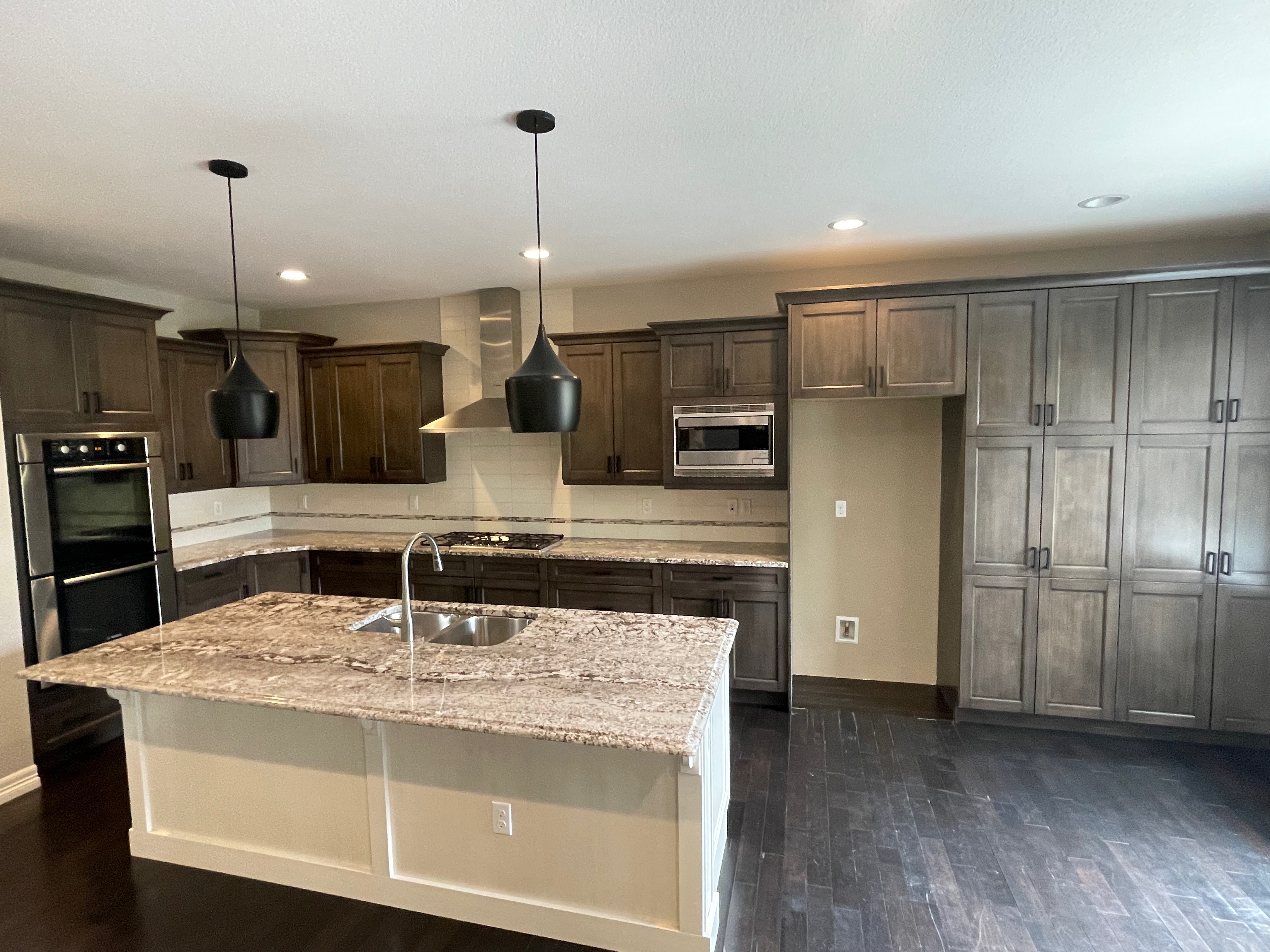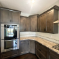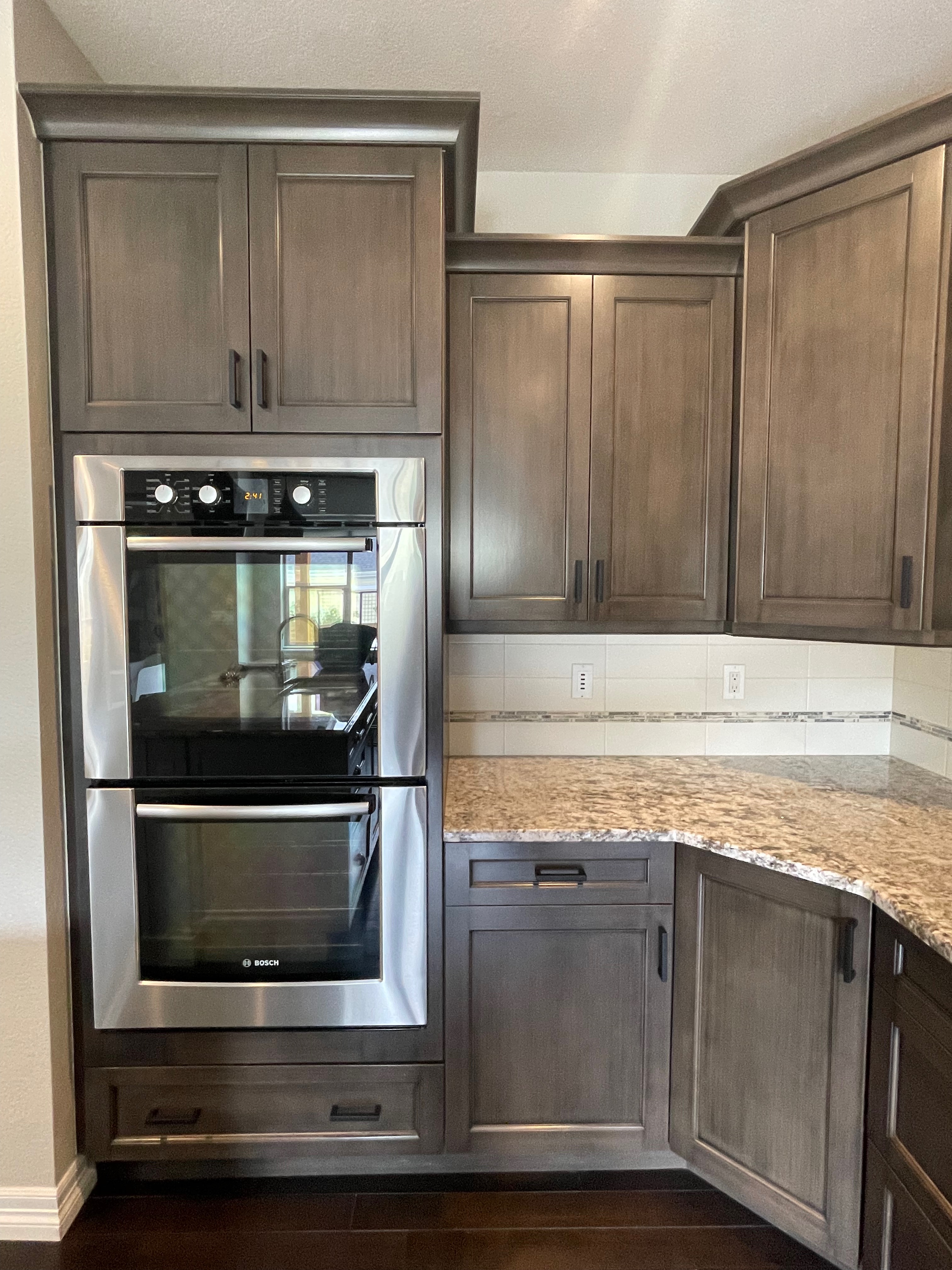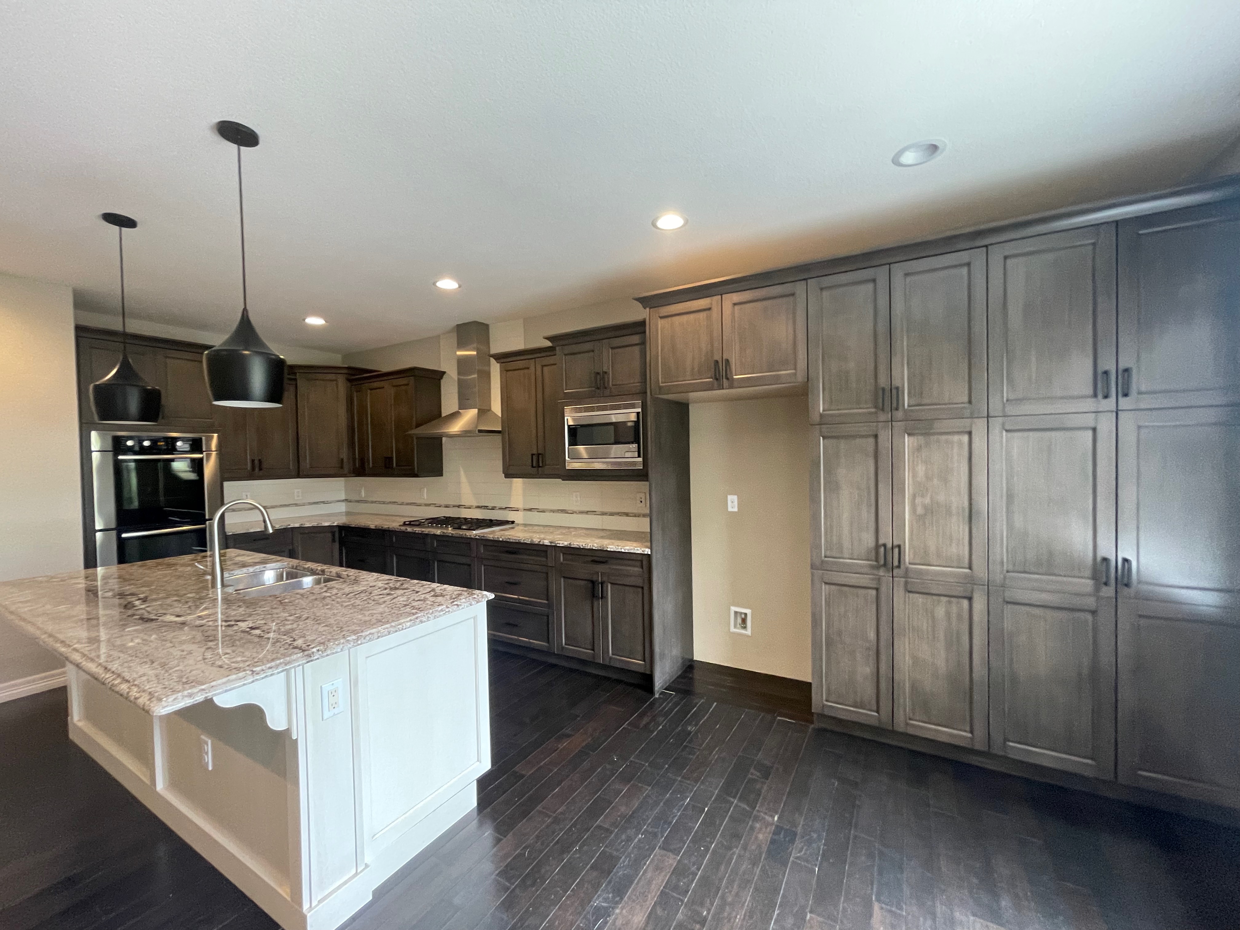Nice! Premier “KitchenCraft” Kitchen package. The kitchen cabinets are the manufacturer’s most popular line of cabinetry. The perimeter cabinets are a gray, brown stain with soft close and dove-tail drawers. The cabinets are in a contrasting creamy white. The kitchen package includes nice Bosch stainless steel appliances with slab granite counter tops. In excellent condition. The kitchen has been professional removed and is ready for pickup. Price for the package below.