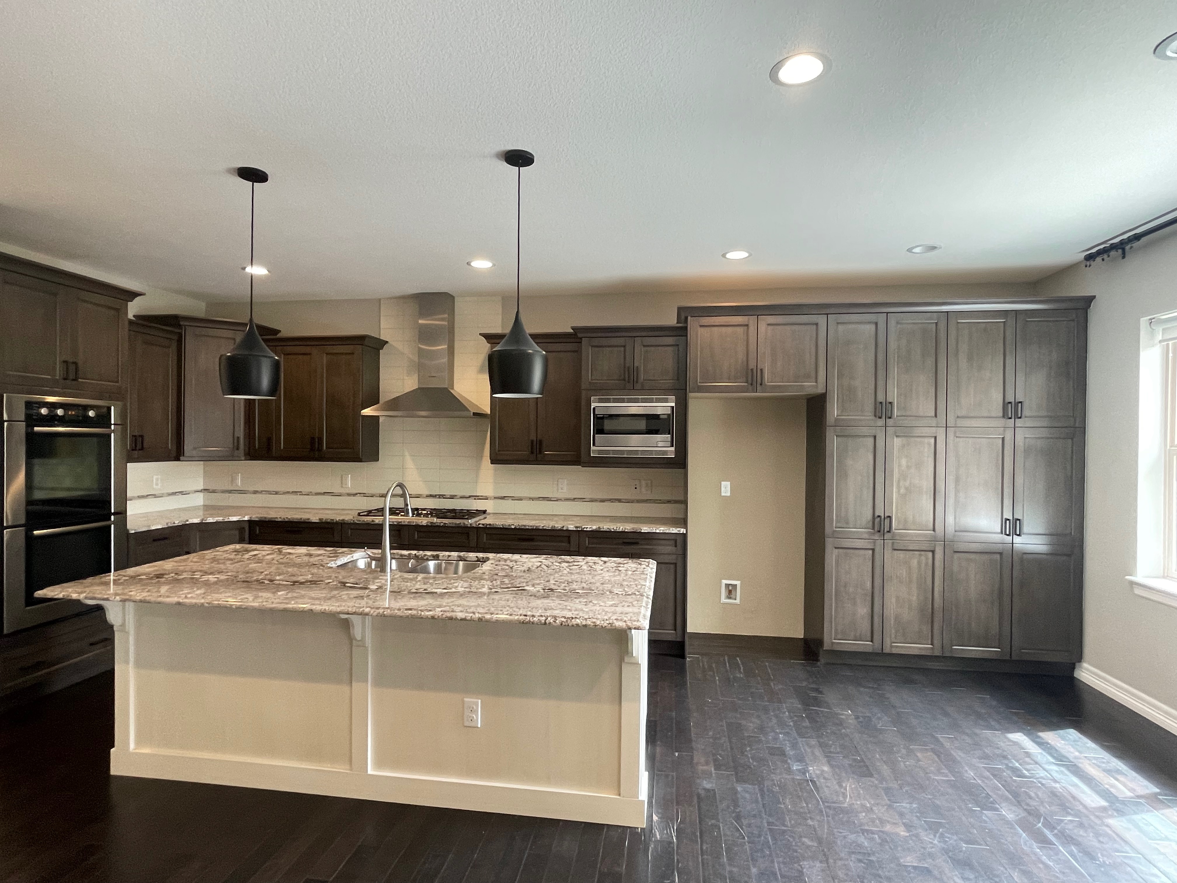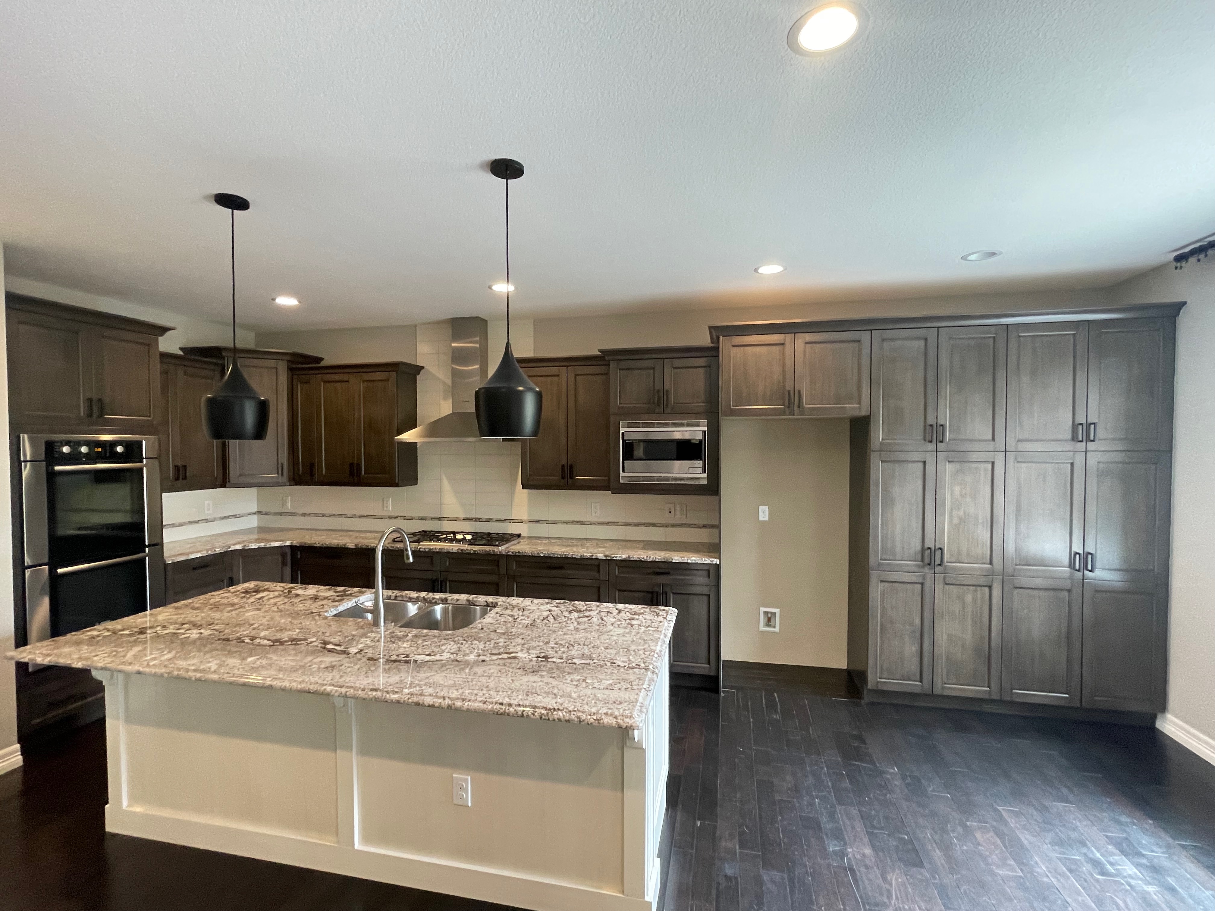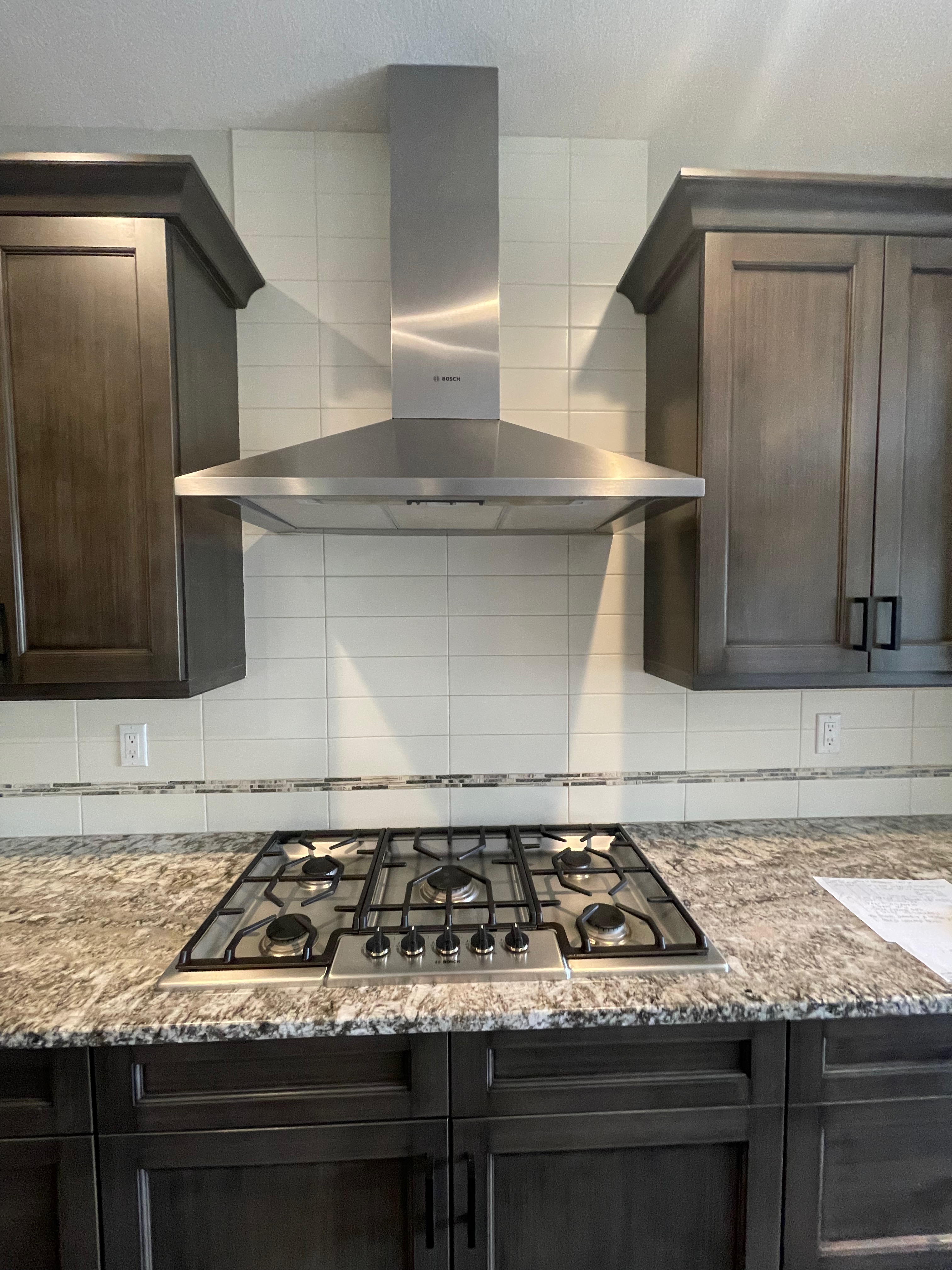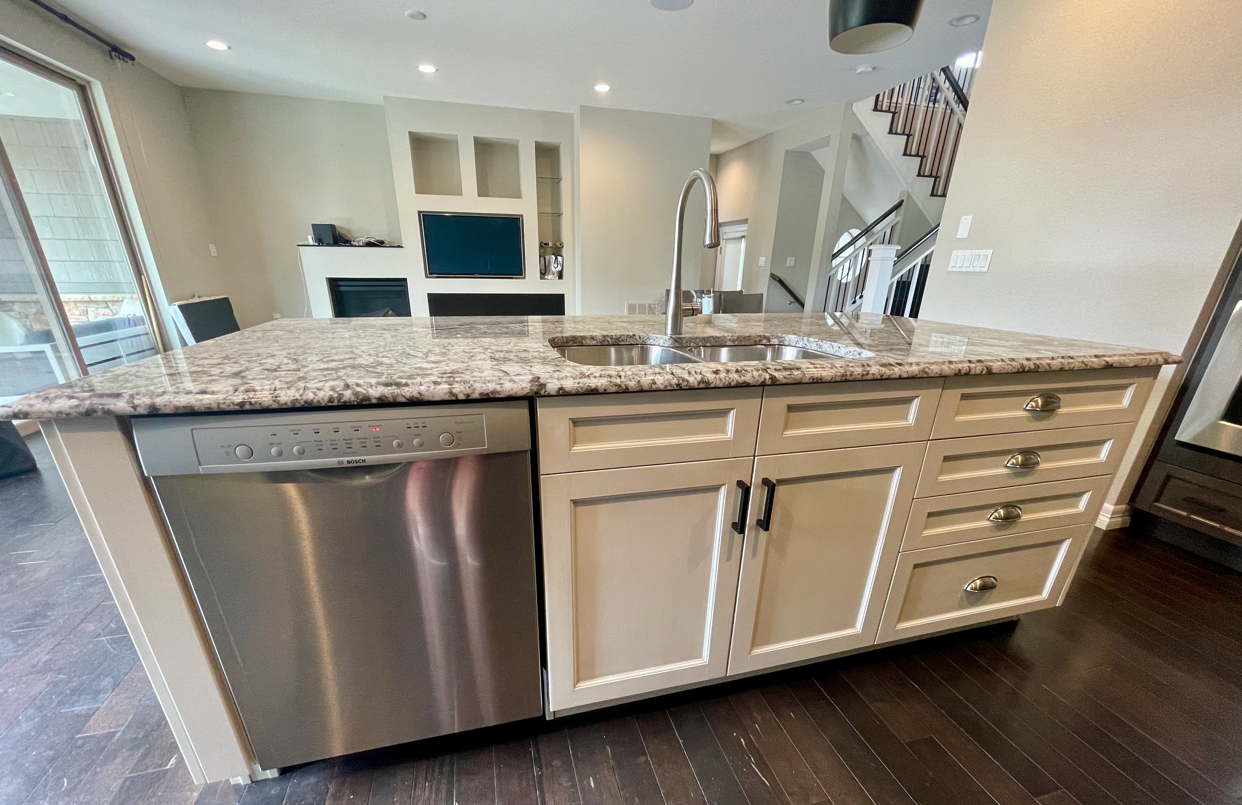 Nice! Premier “KitchenCraft” Kitchen package. The kitchen cabinets are the manufacturer’s most popular line of cabinetry. The perimeter cabinets are a gray, brown stain with soft close and dove-tail drawers. The cabinets are in a contrasting creamy white. The kitchen package includes nice Bosch stainless steel appliances with slab granite counter tops. In excellent condition. The kitchen has been professional removed and is ready for pickup. Price for the package below.