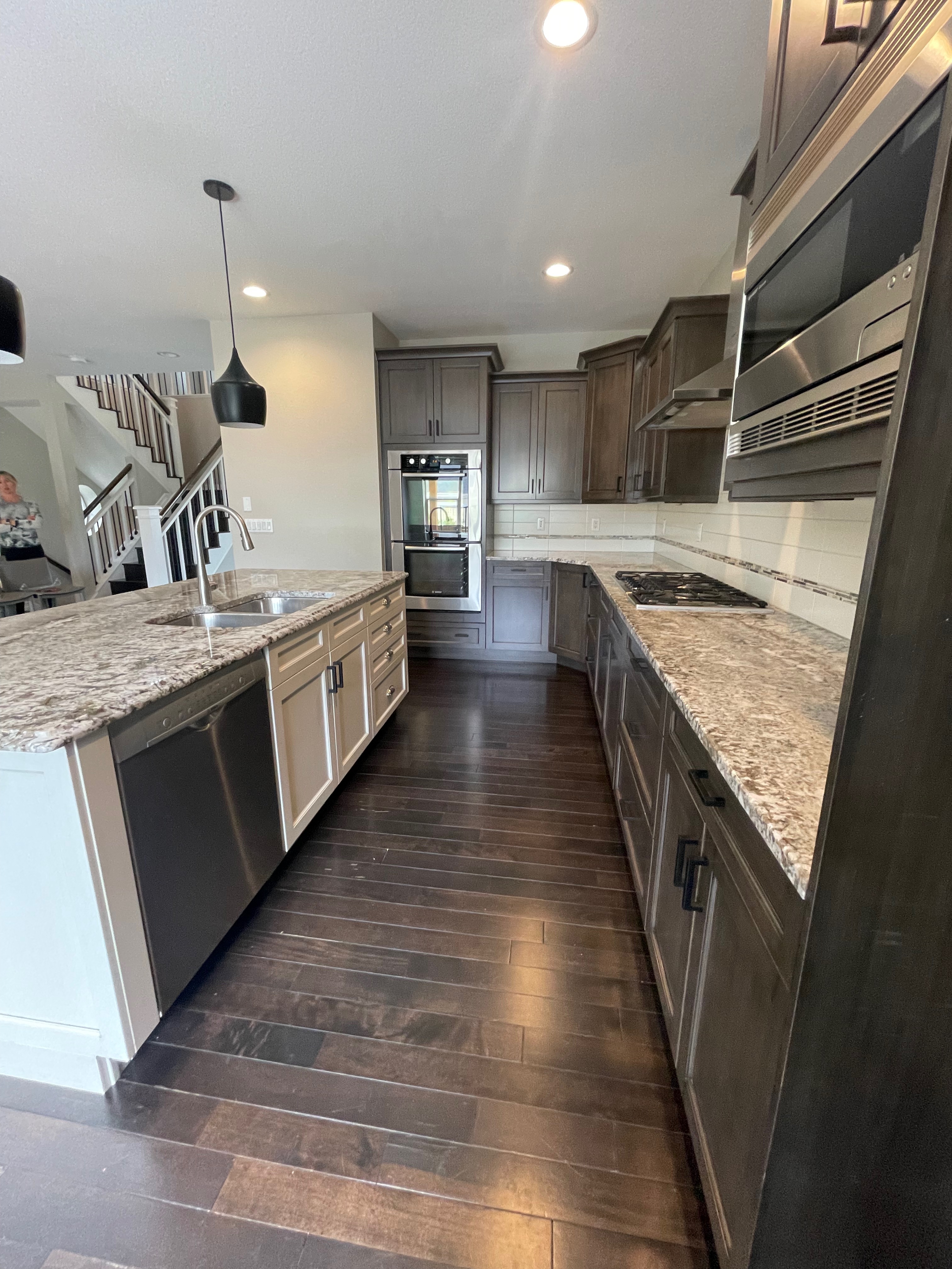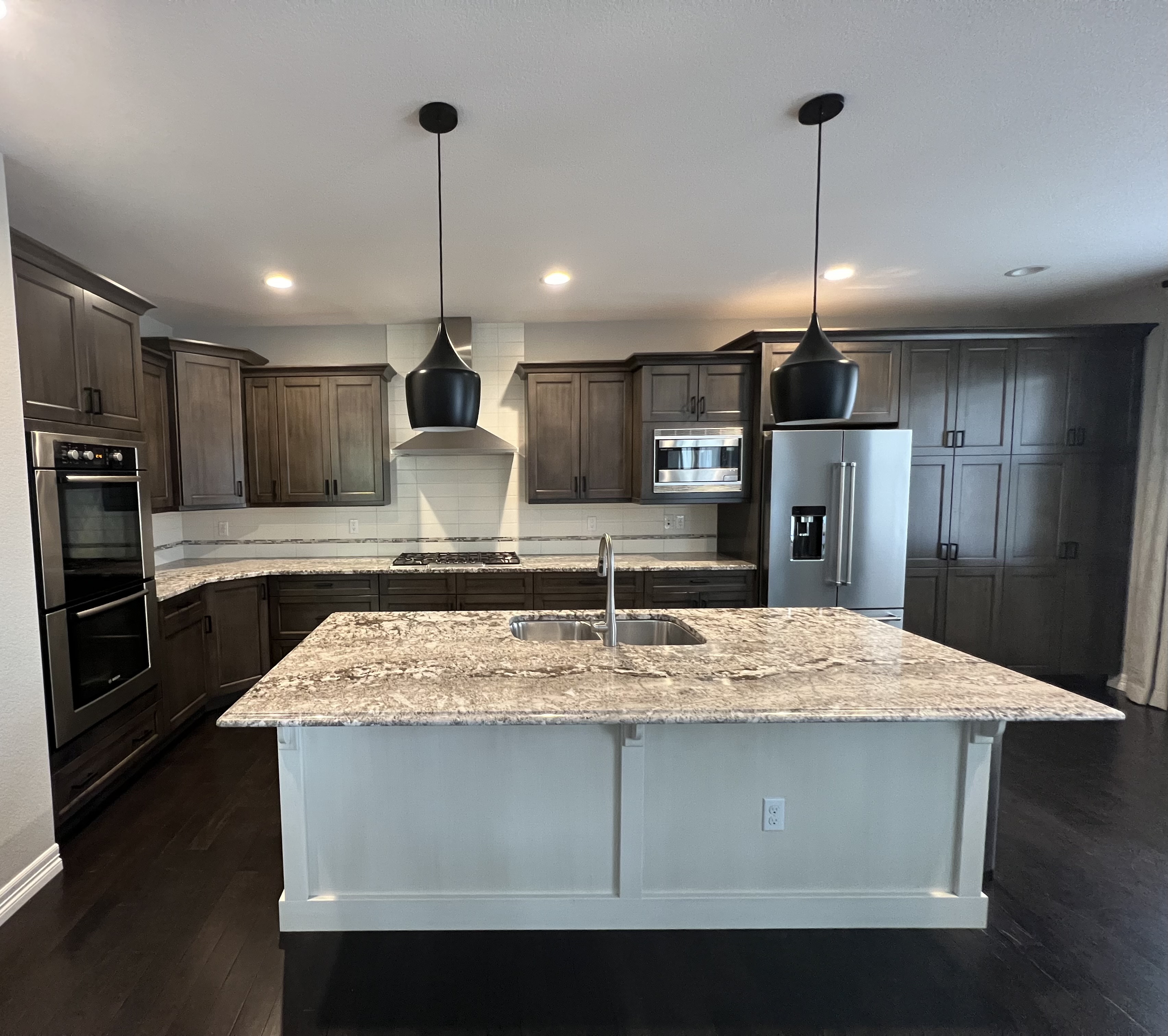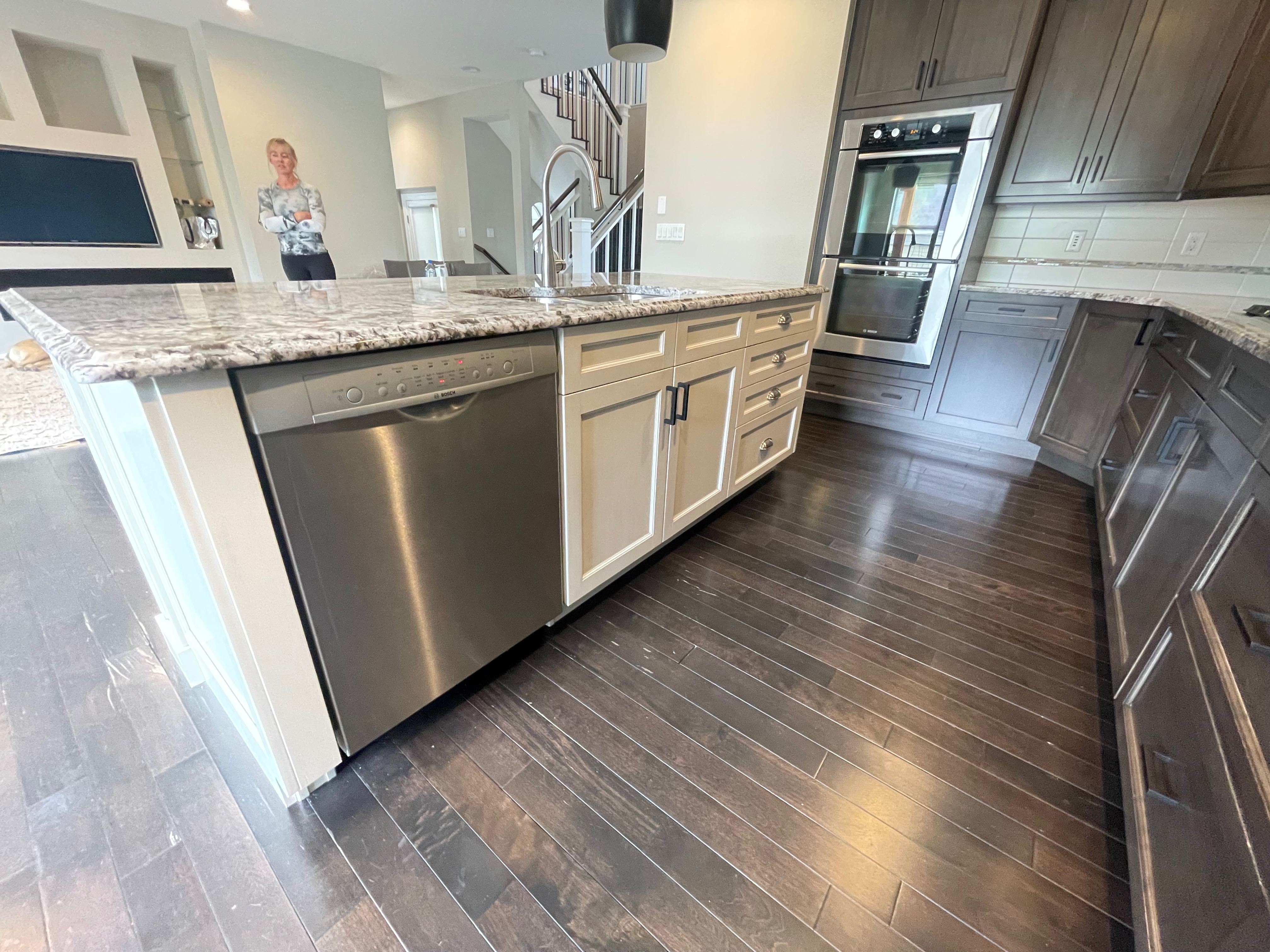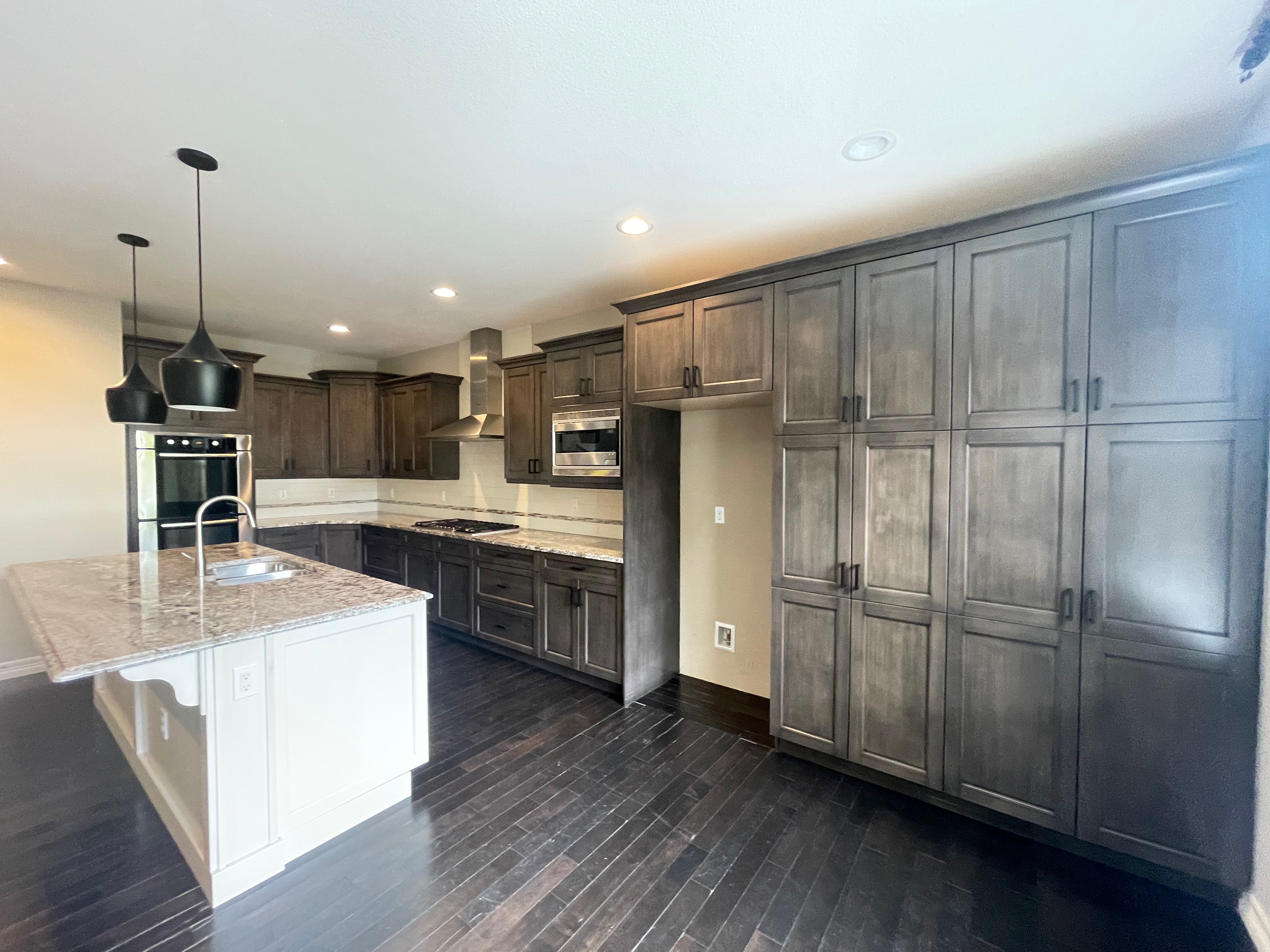 Nice! Premier “KitchenCraft” Kitchen package. The kitchen cabinets are the manufacturer’s most popular line of cabinetry. The perimeter cabinets are a gray, brown stain with soft close and dove-tail drawers. The cabinets are in a contrasting creamy white. The kitchen package includes nice Bosch stainless steel appliances with slab granite counter tops. In excellent condition. The kitchen has been professional removed and is ready for pickup. Price for the package below.