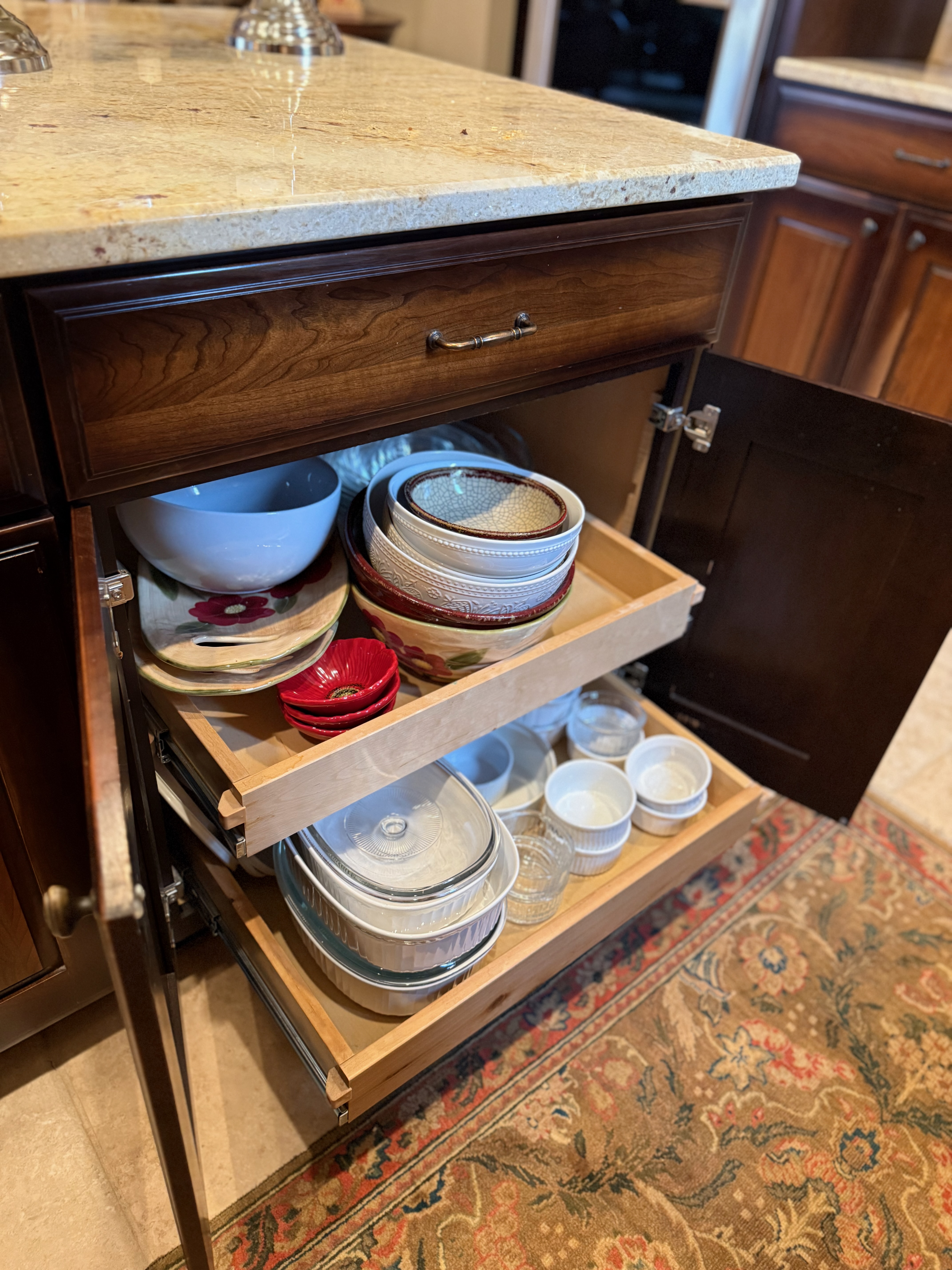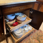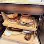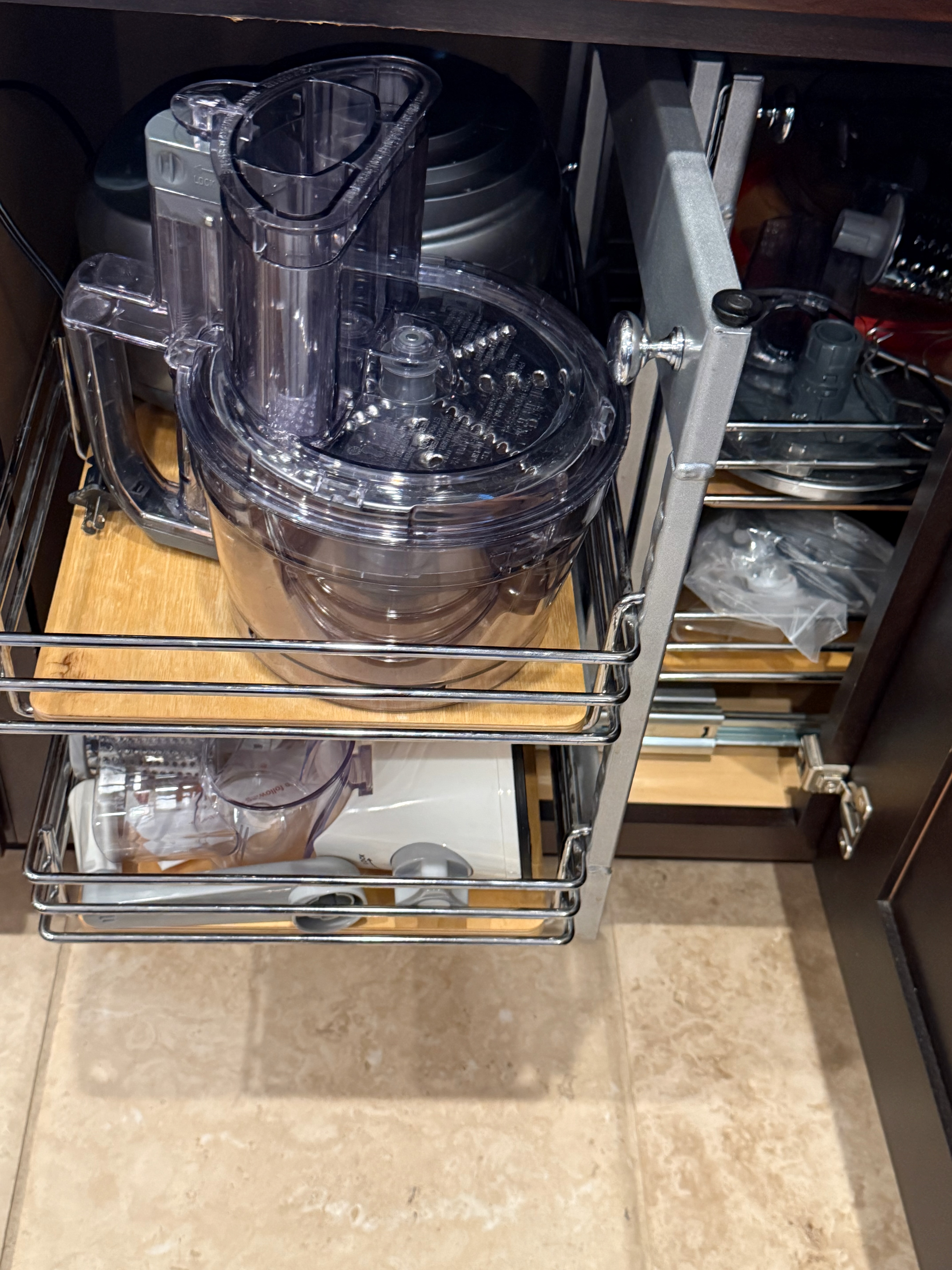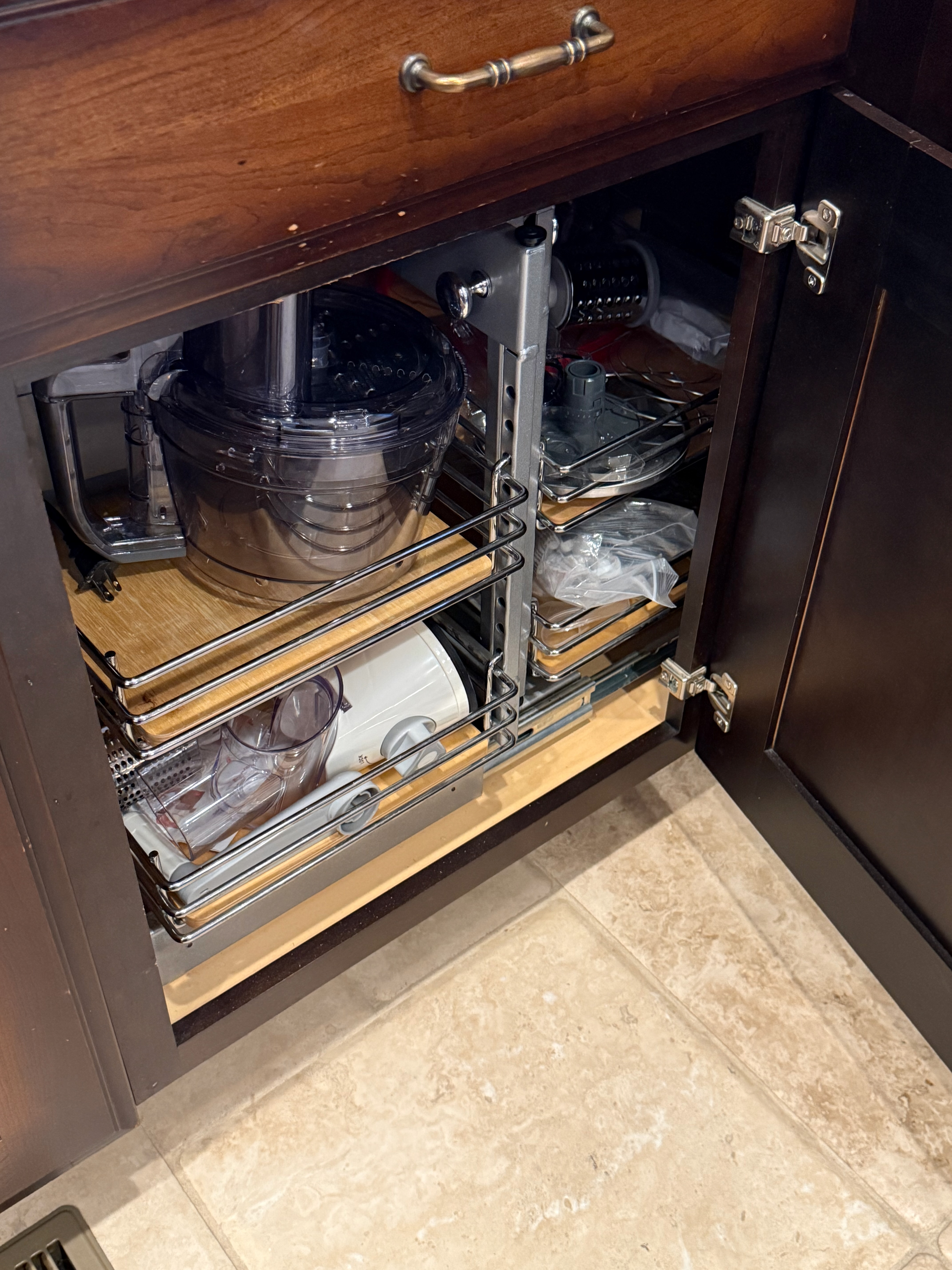 1-One drawer, One door blind corner right base cabinet, Dim.: 48”w x 36”h x 24”d *including a Rev-A-Shelf two tier pull-out organizer for a blind corner Listing price new $1,772
