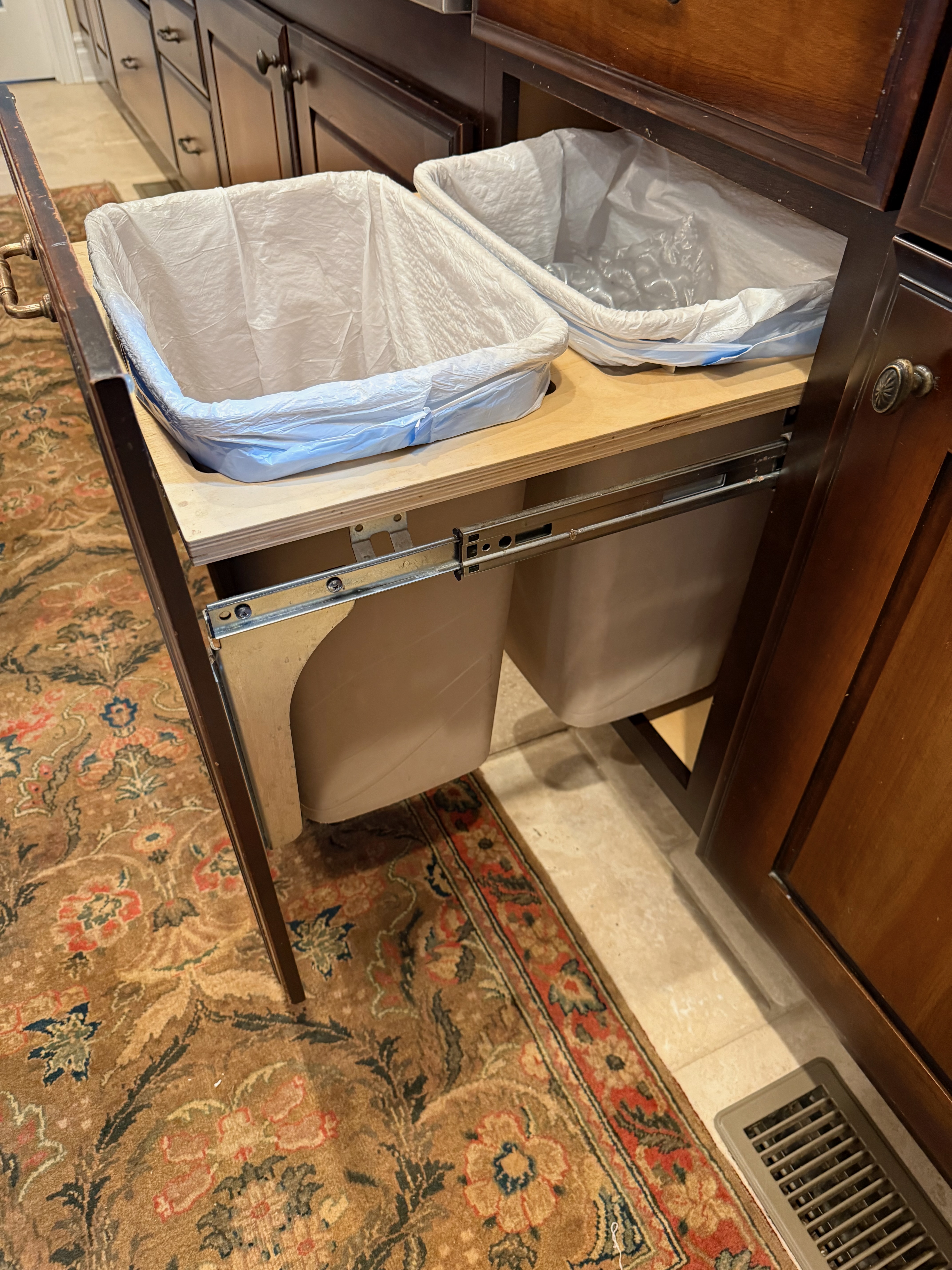 1-One drawer, One door base cabinets w/ two trash/recycle bins Dim.; 21” w x 36”h x 24” d