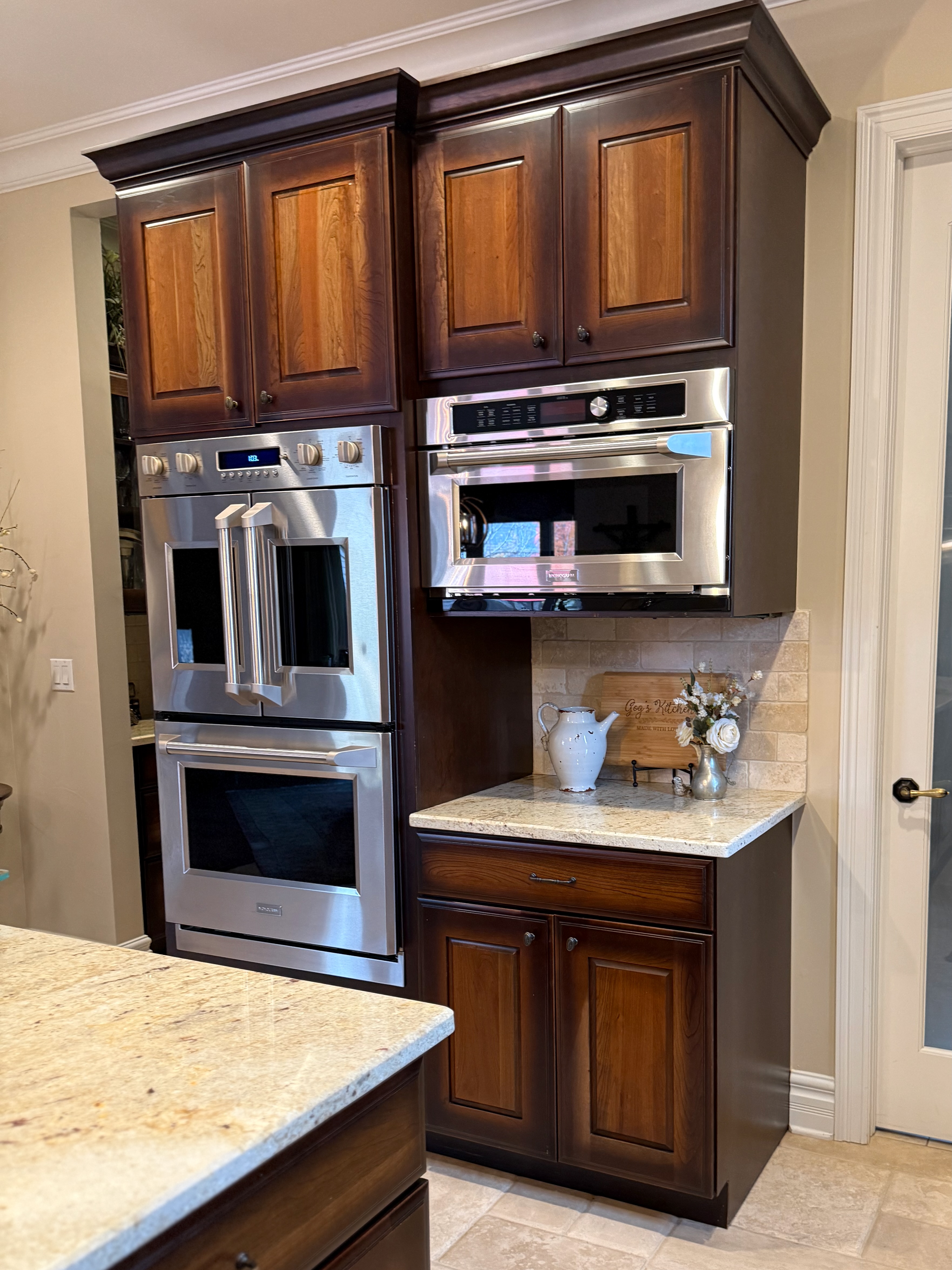 1-Two door, one drawer double tall, double oven cabinet Dim.: 33”w x 96”h w/out the crown/99”h w/ the crown x 24”d, opening for the oven 30”w x 54”h