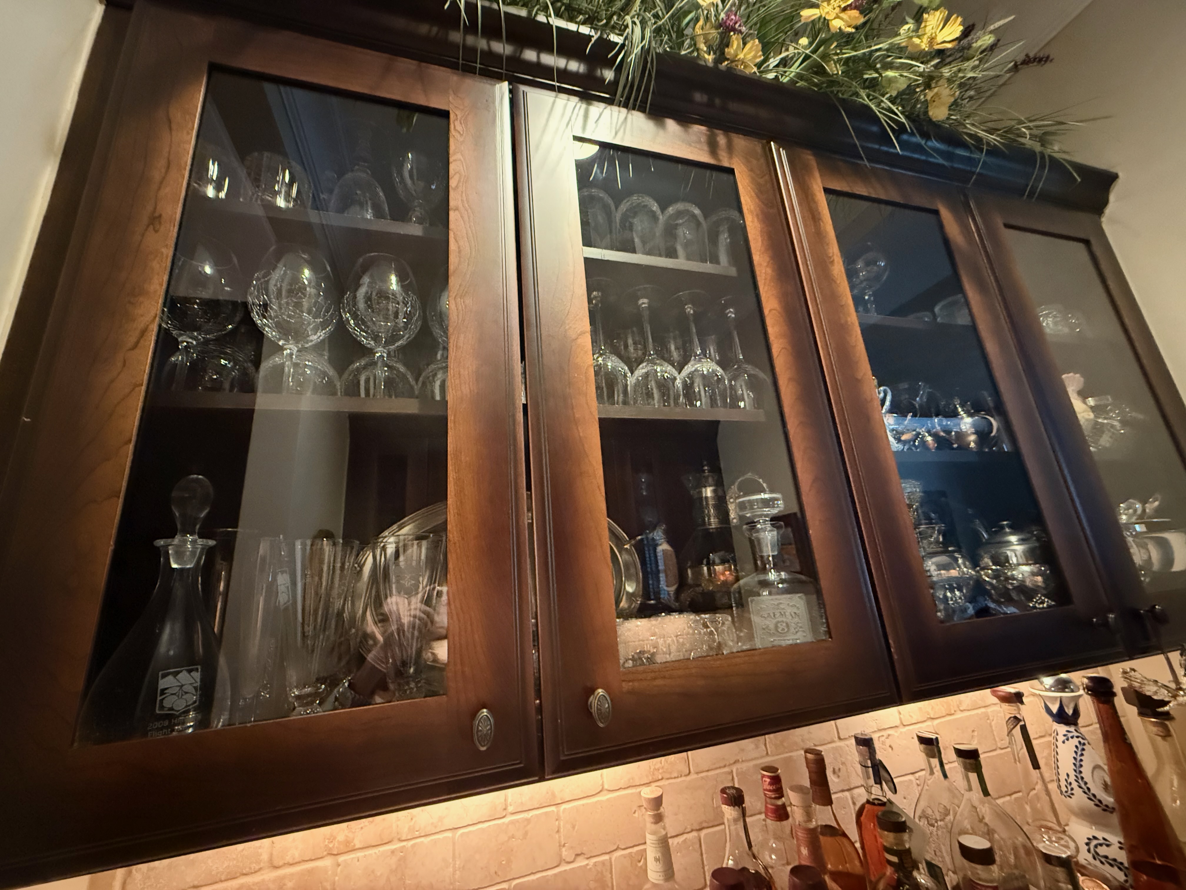 2-Two door glass front wall cabinets w/ under cabinets lights Dim.: 36”w x 30”h cab. only/39”h with crown x 12”d