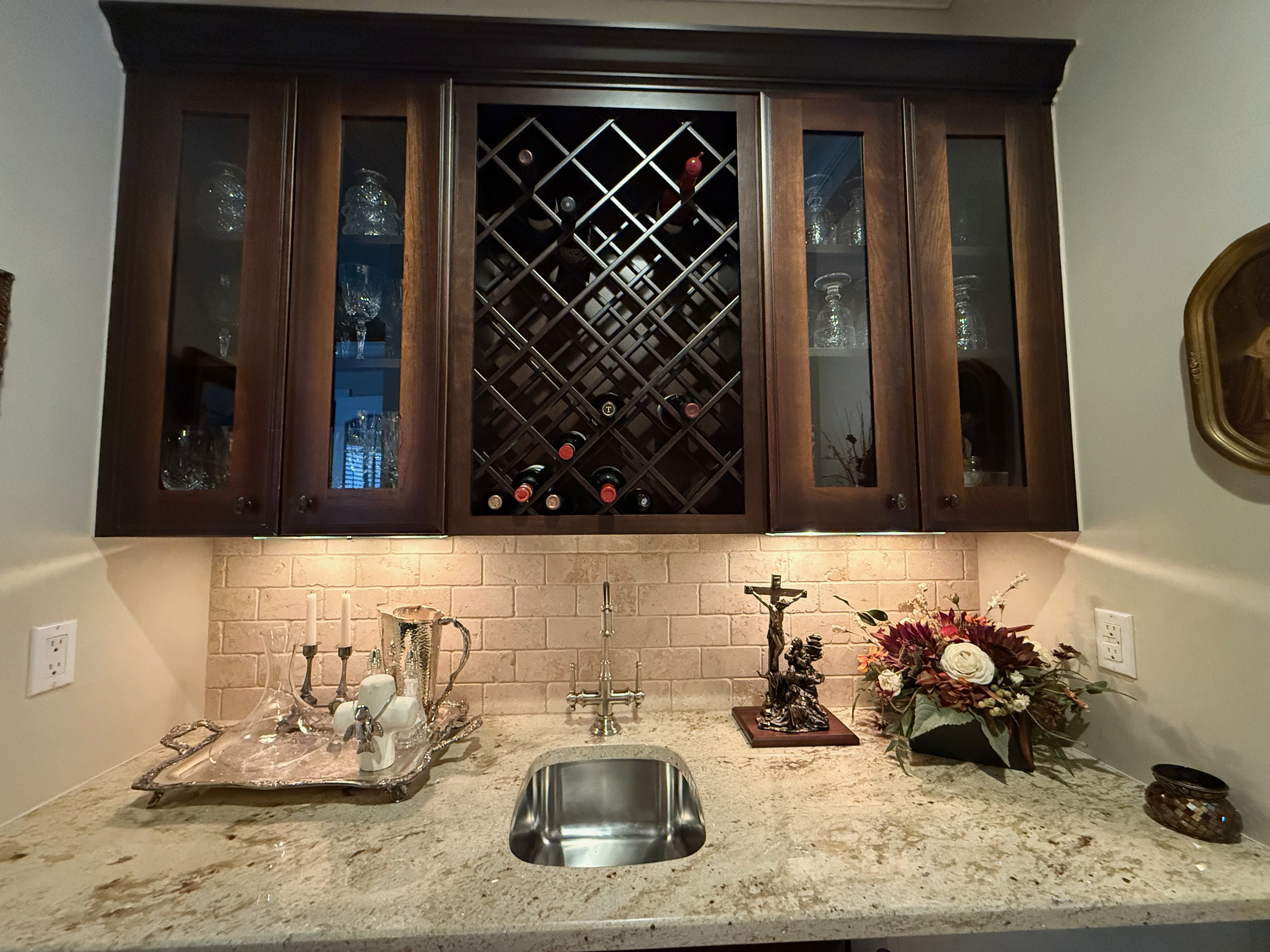 1-Wine bottle holder wall cabinet Dim.: 24”w 30”h cab. only/39”h with crown x 12”d