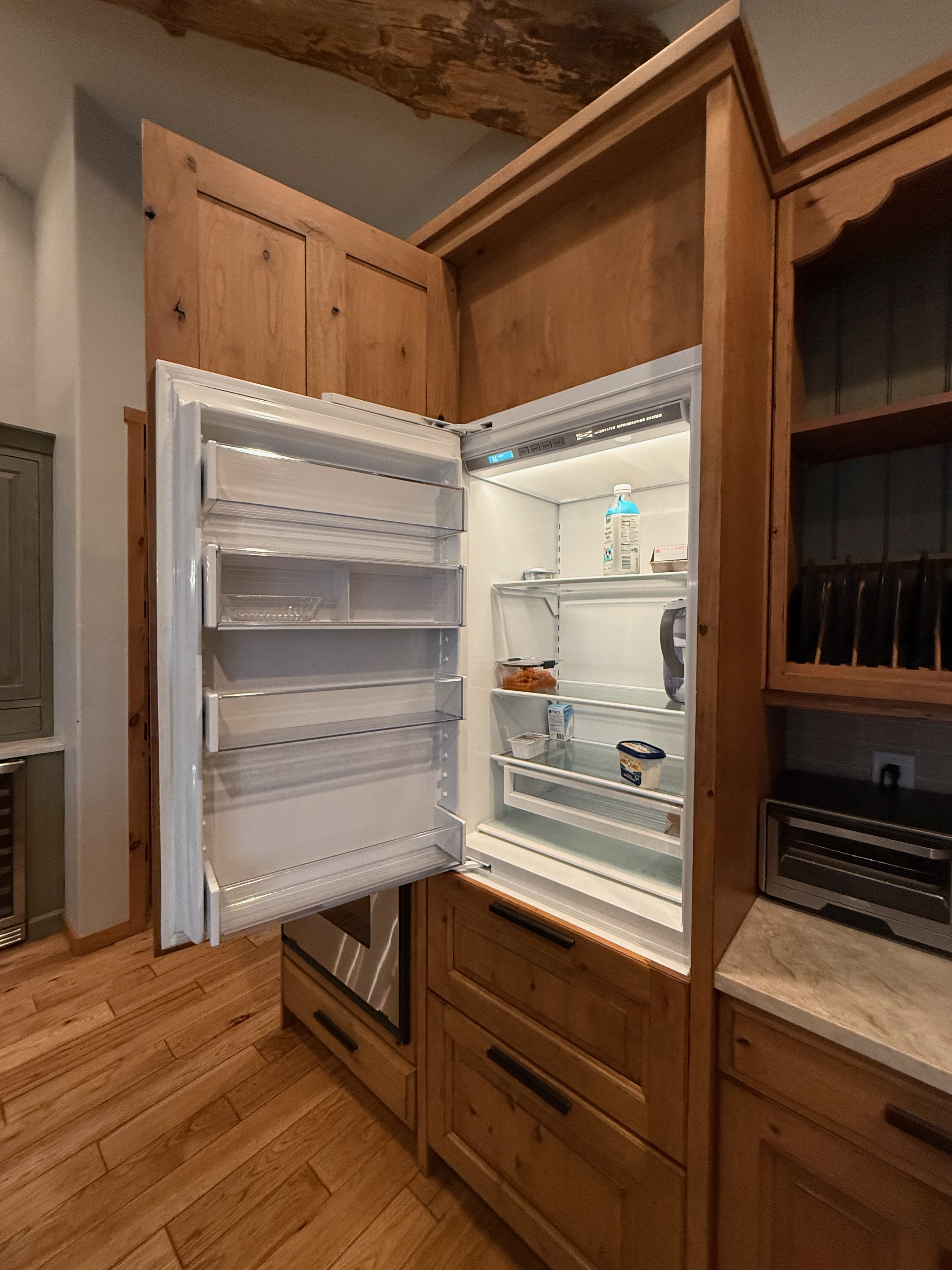 27” Sub-Zero panel ready built in Refrigerator, Freezer, Alder wood cabinet panels included Dim.: 27”w x 80”h x 24”d, Model #700TCI, Serial #M1541312, 9/99 Listing price new $7,799