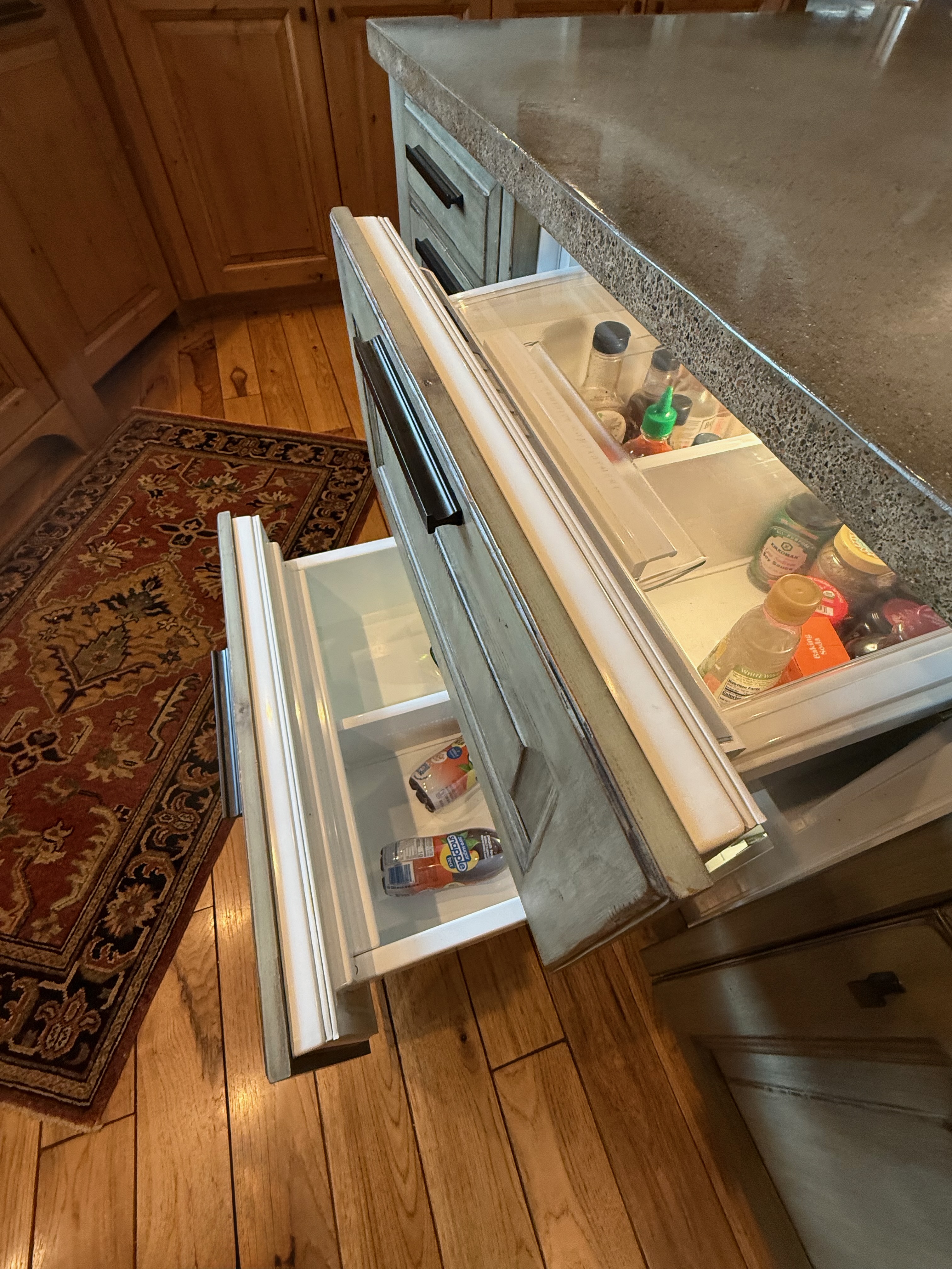 27” Sub-Zero Refrigerator drawers in the island, Panel ready. Cabinet panels on this appliance are not included. Model #700BR Serial #M1537269 9/99, New $4,299