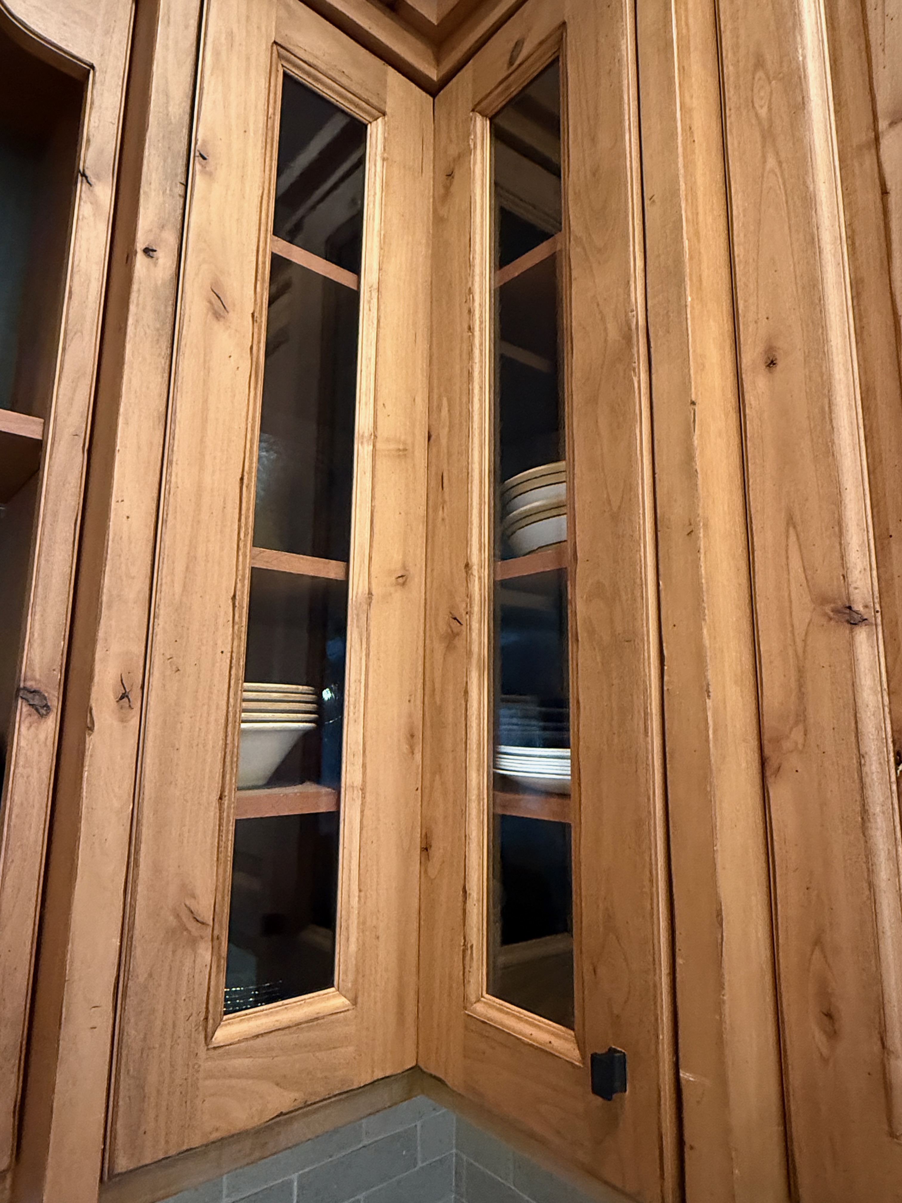 1-Two door glass front corner cabinet Dim.: 24” w x 42”h just cabinet/45 ¾”h w/crown/47”h w/ bottom trim x 12”d