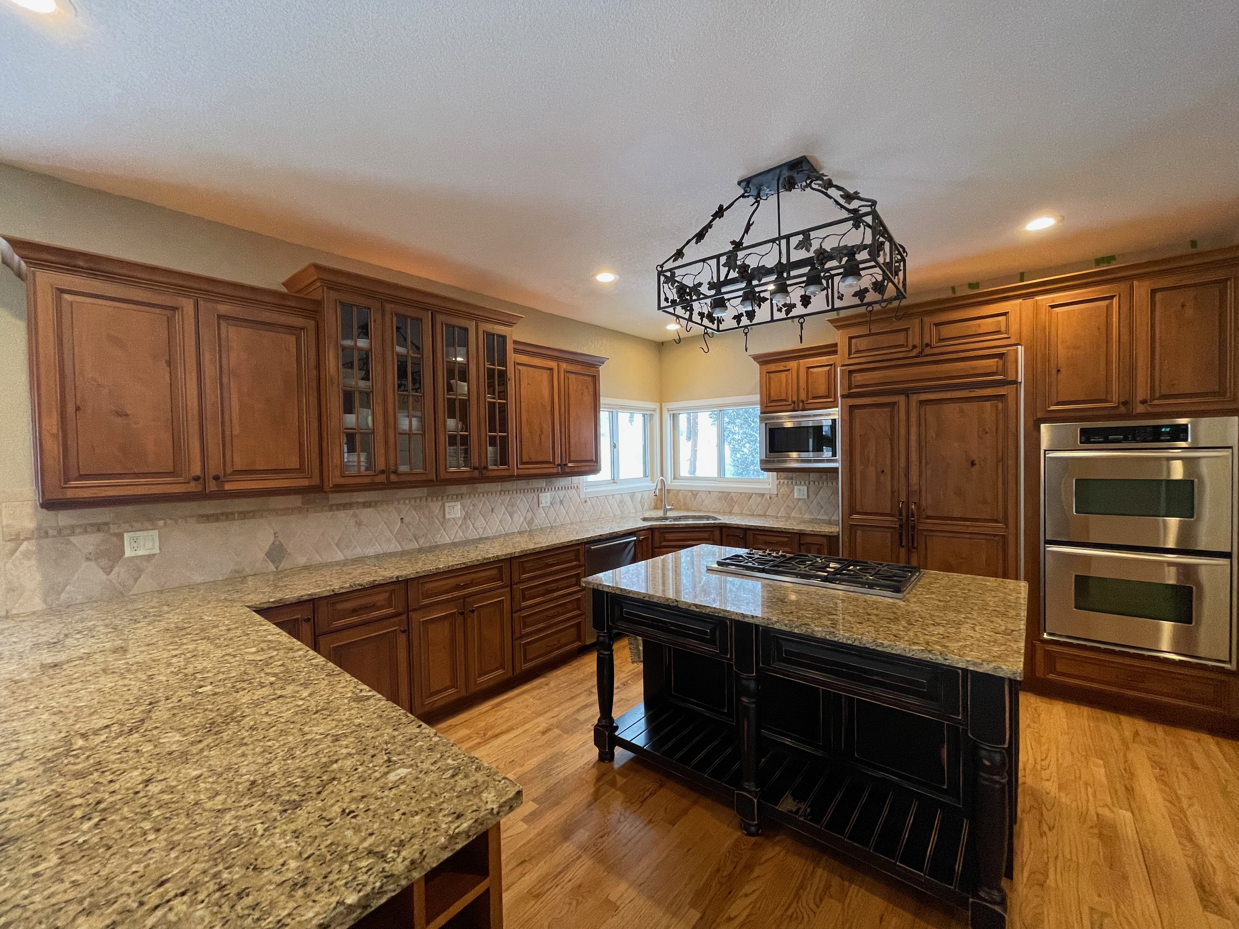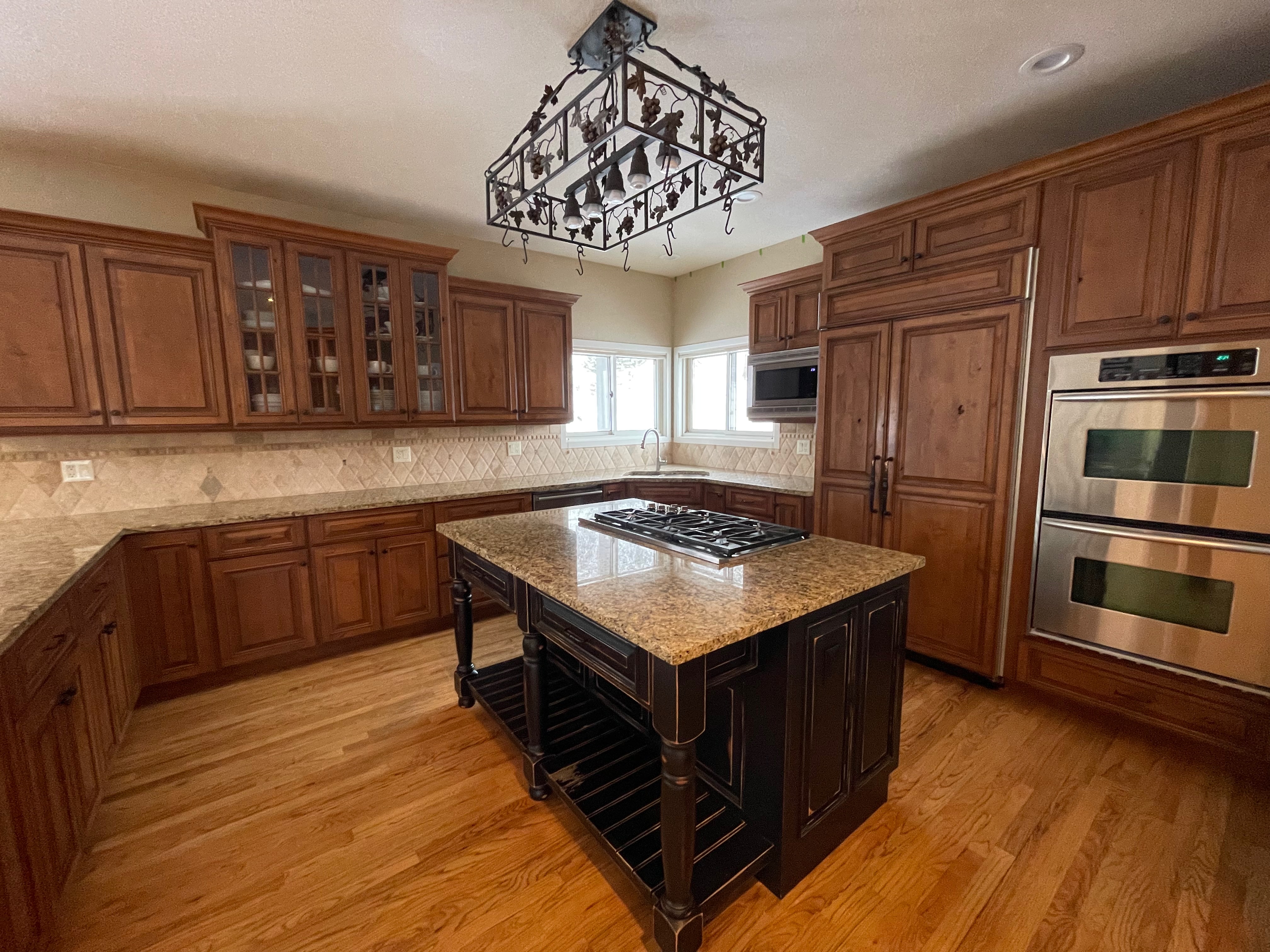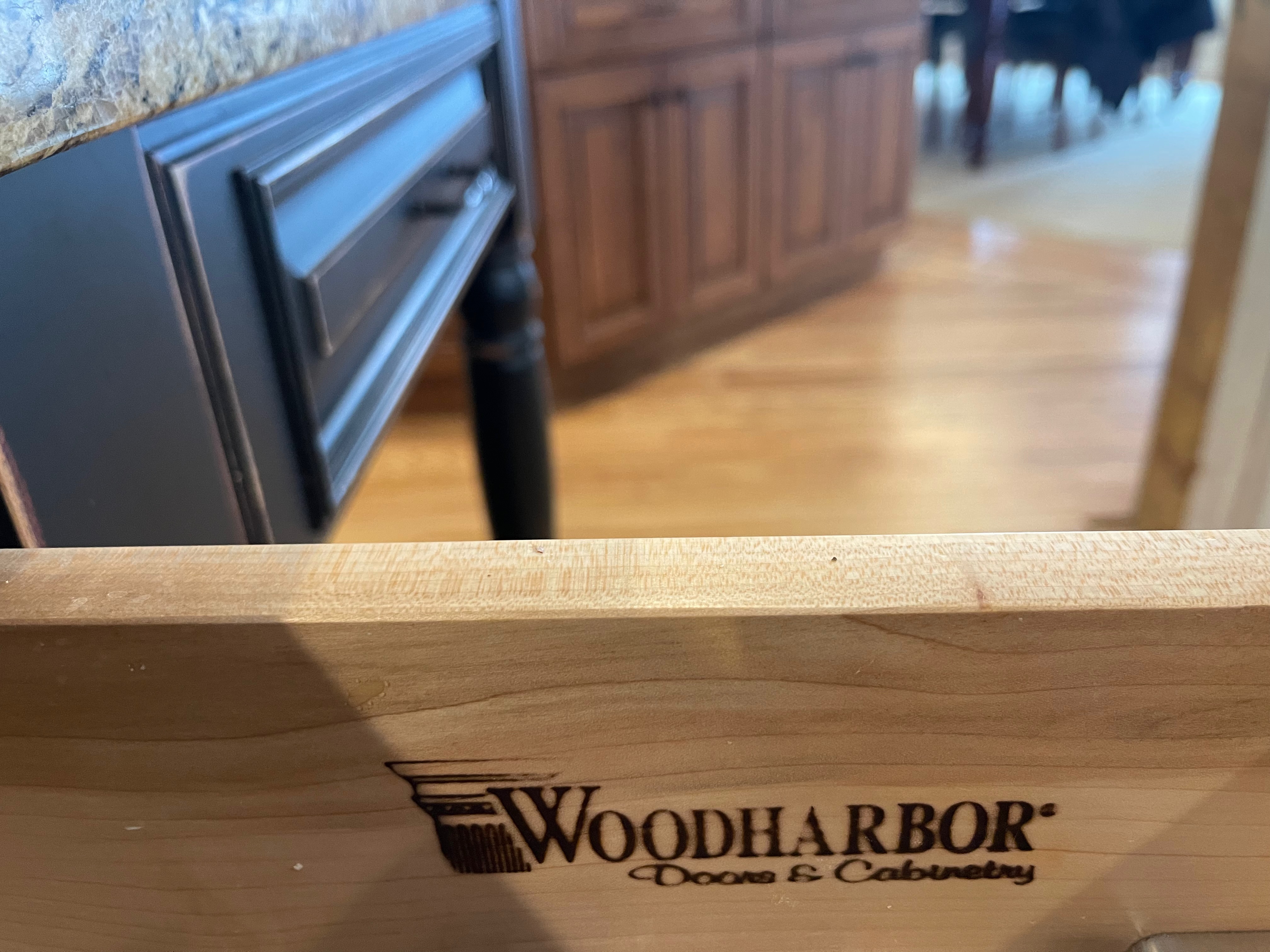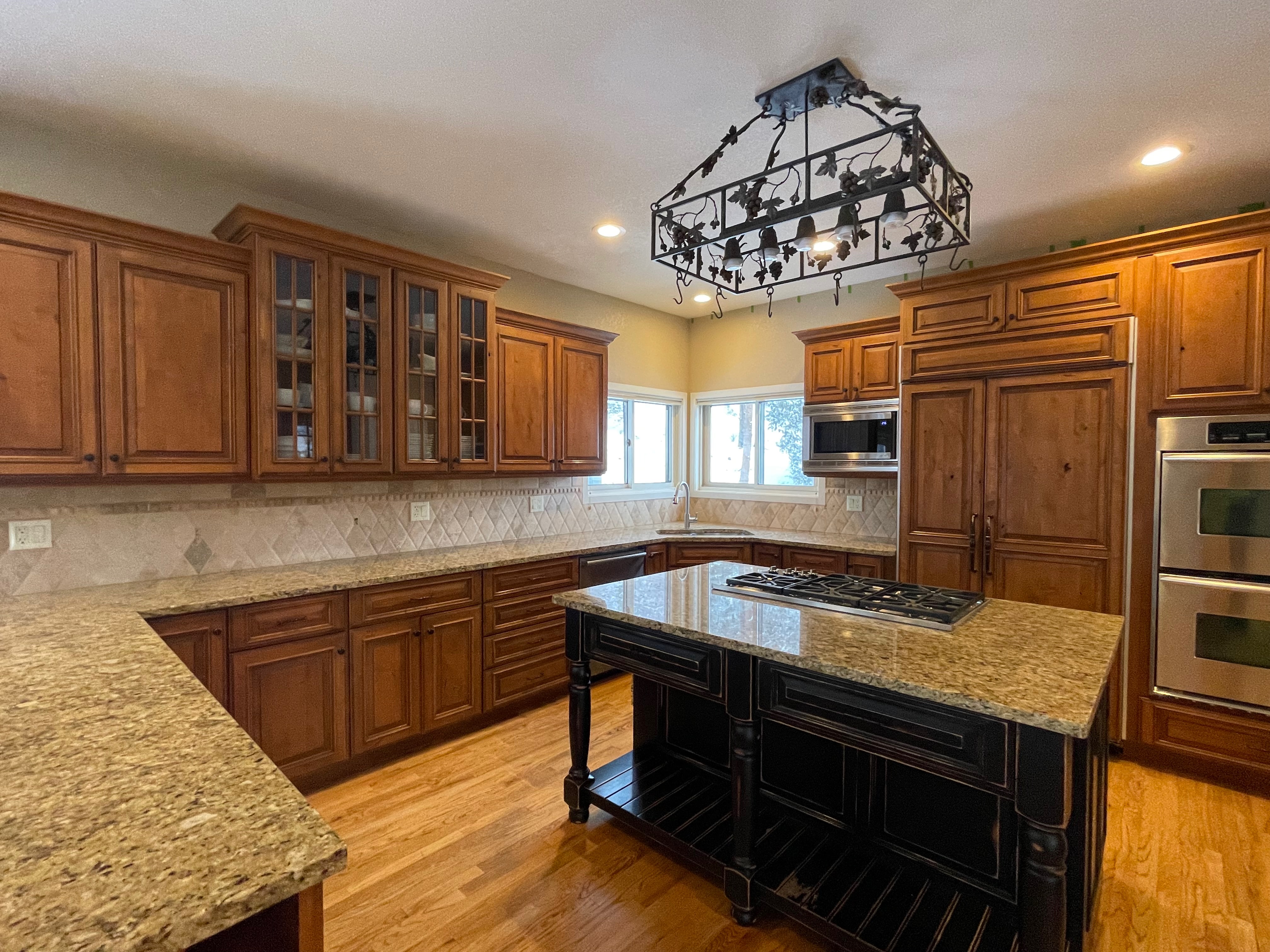 Nice rustic knotty Alder kitchen cabinets made by Woodharbor Custom Cabinetry. The cabinetry is the Worthington door style with a carmel/coffee stain. The 4th photo gives you a good idea of the finish stain.There is Worthington contrasting black wood island and hutch in paintable olde black boot. Woodharbor still manufactures the cabinetry if you need to buy additional pieces. The kitchen includes a Kitchen Aid refrigerator and oven, Wolf cooktop, downdraft and LG microwave. The kitchen can be removed as soon as February by a qualified buyer or licensed sub-contractors can be hired to remove the kitchen. Drawings attached. Price for the package below.