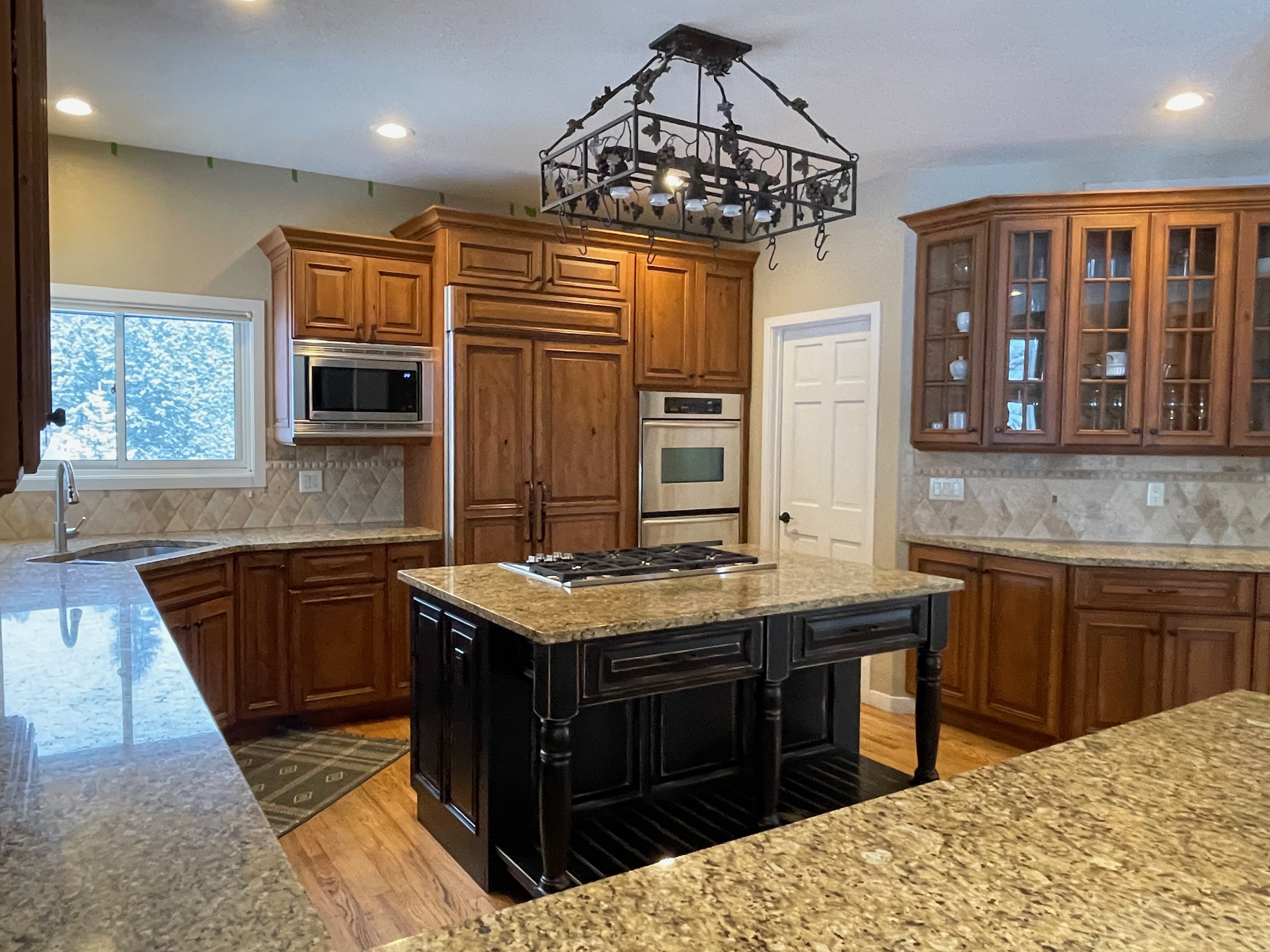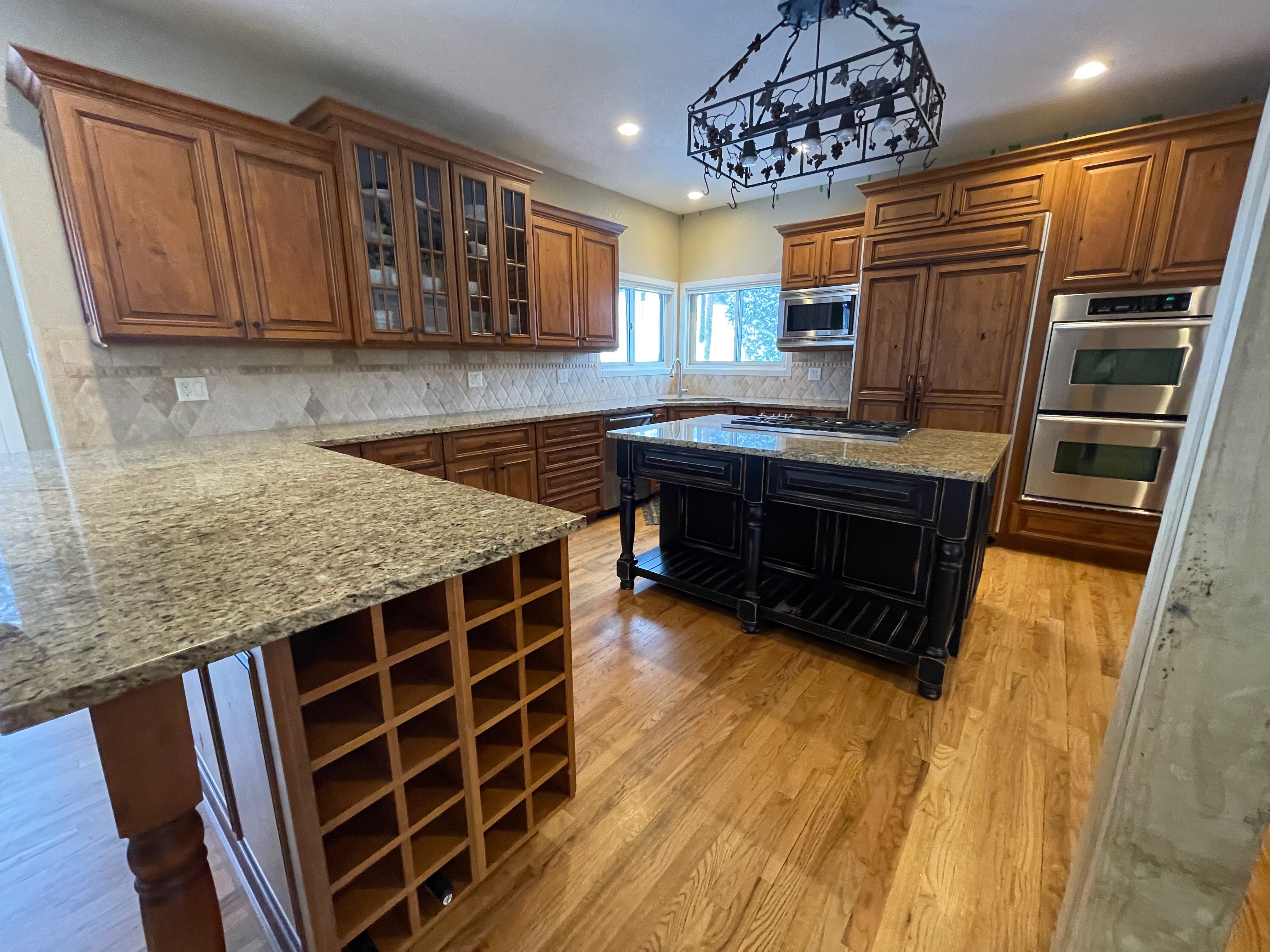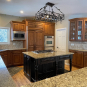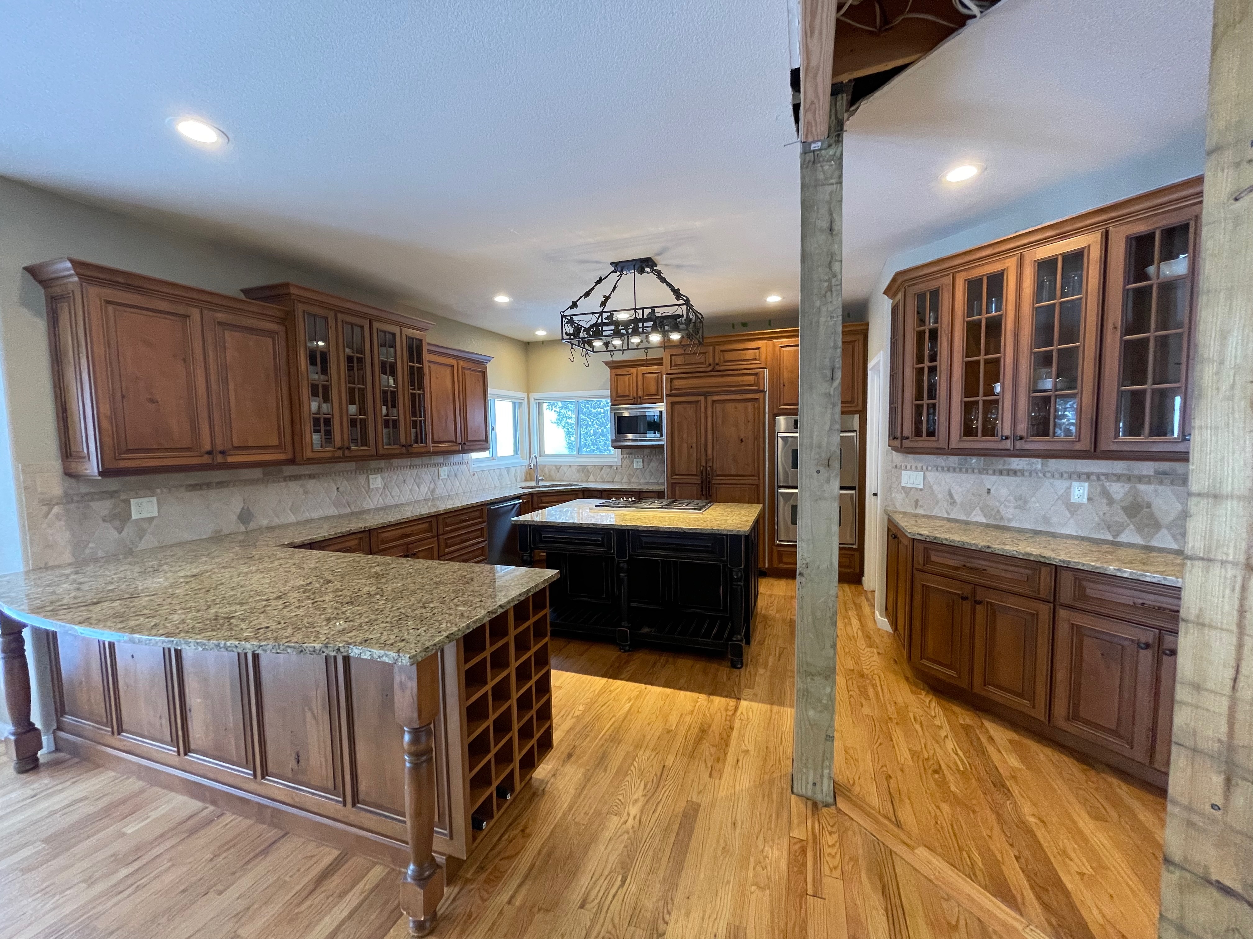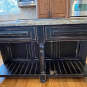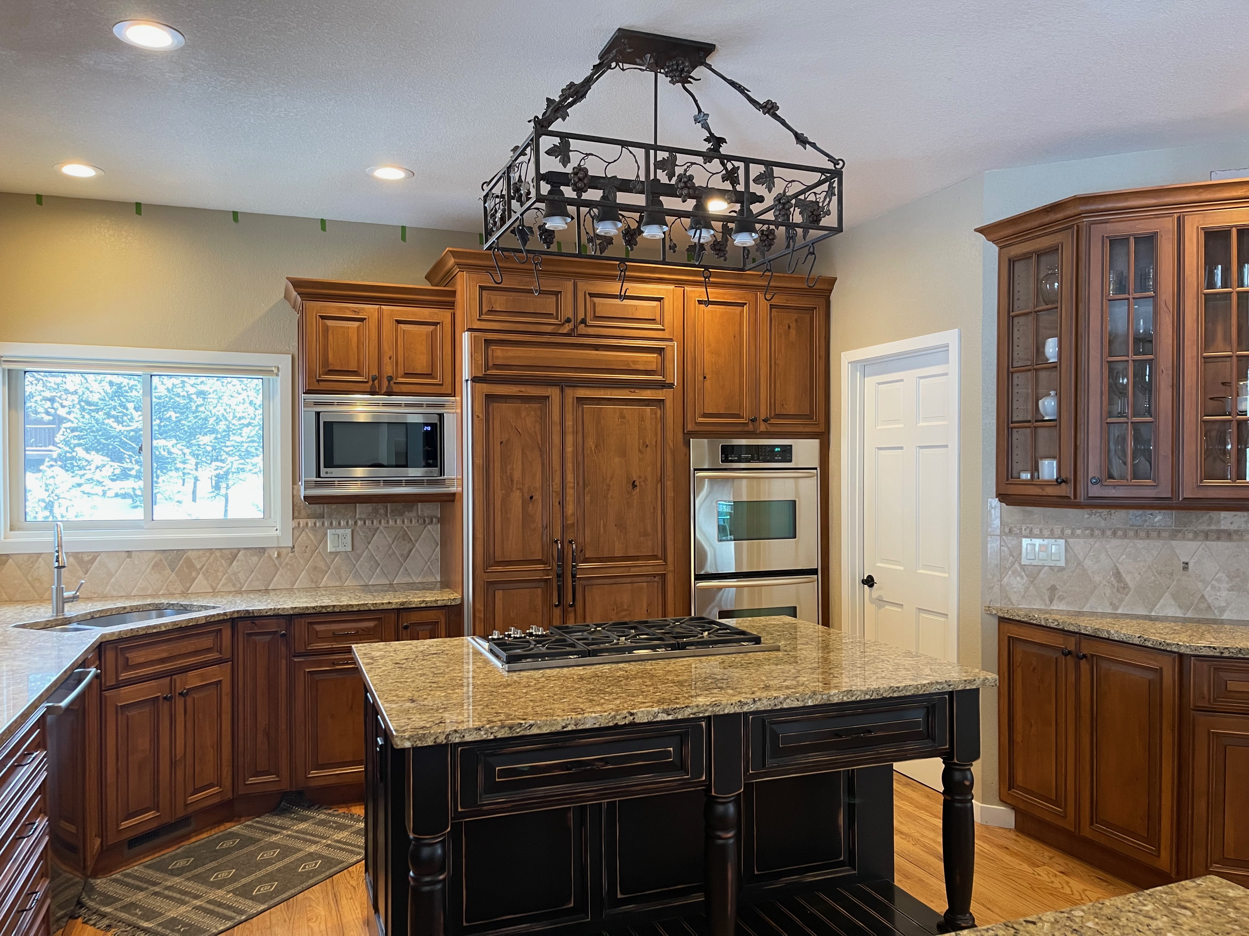 Nice rustic knotty Alder kitchen cabinets made by Woodharbor Custom Cabinetry. The cabinetry is the Worthington door style with a carmel/coffee stain. The 4th photo gives you a good idea of the finish stain.There is Worthington contrasting black wood island and hutch in paintable olde black boot. Woodharbor still manufactures the cabinetry if you need to buy additional pieces. The kitchen includes a Kitchen Aid refrigerator and oven, Wolf cooktop, downdraft and LG microwave. The kitchen can be removed as soon as February by a qualified buyer or licensed sub-contractors can be hired to remove the kitchen. Drawings attached. Price for the package below.