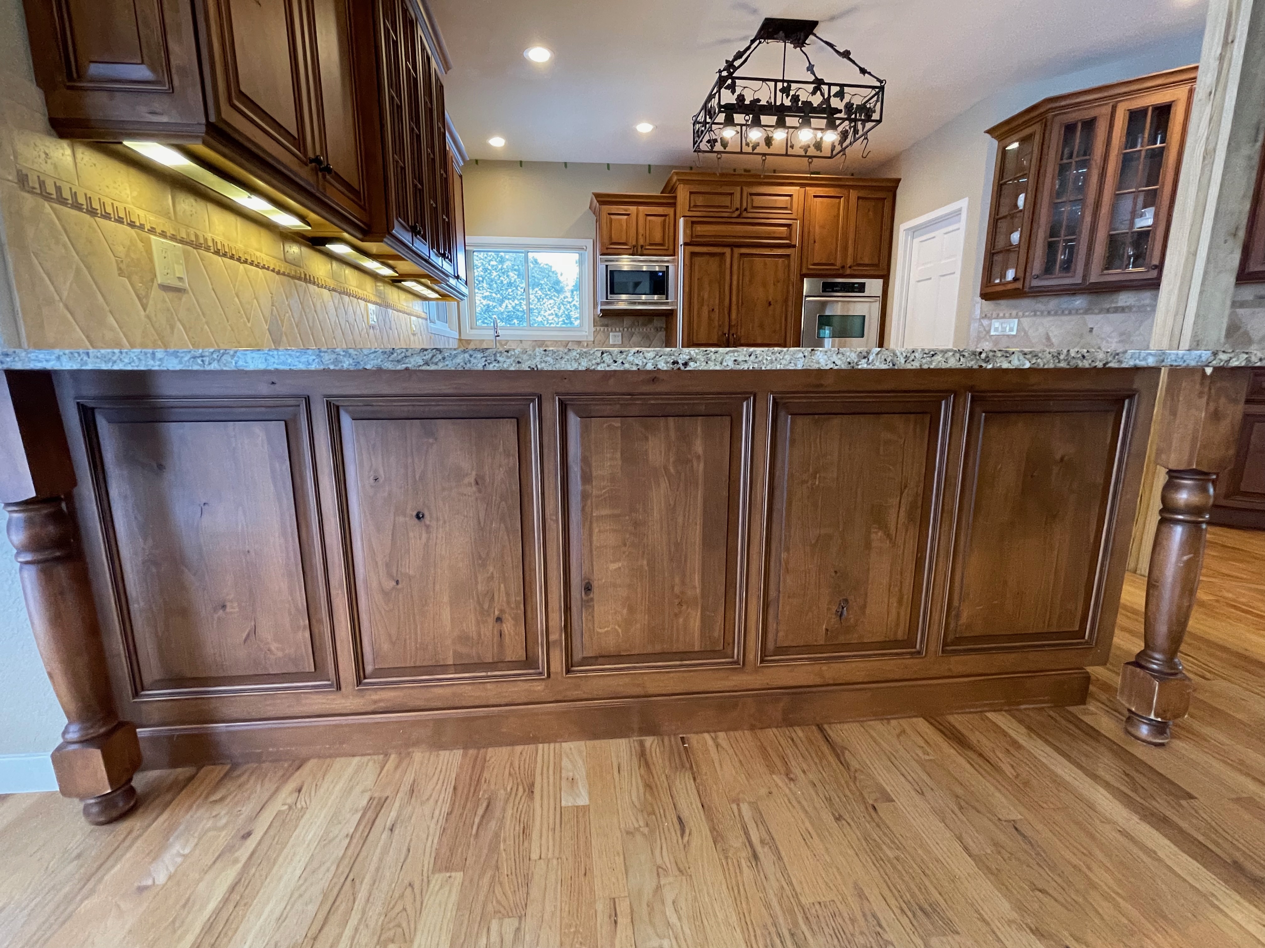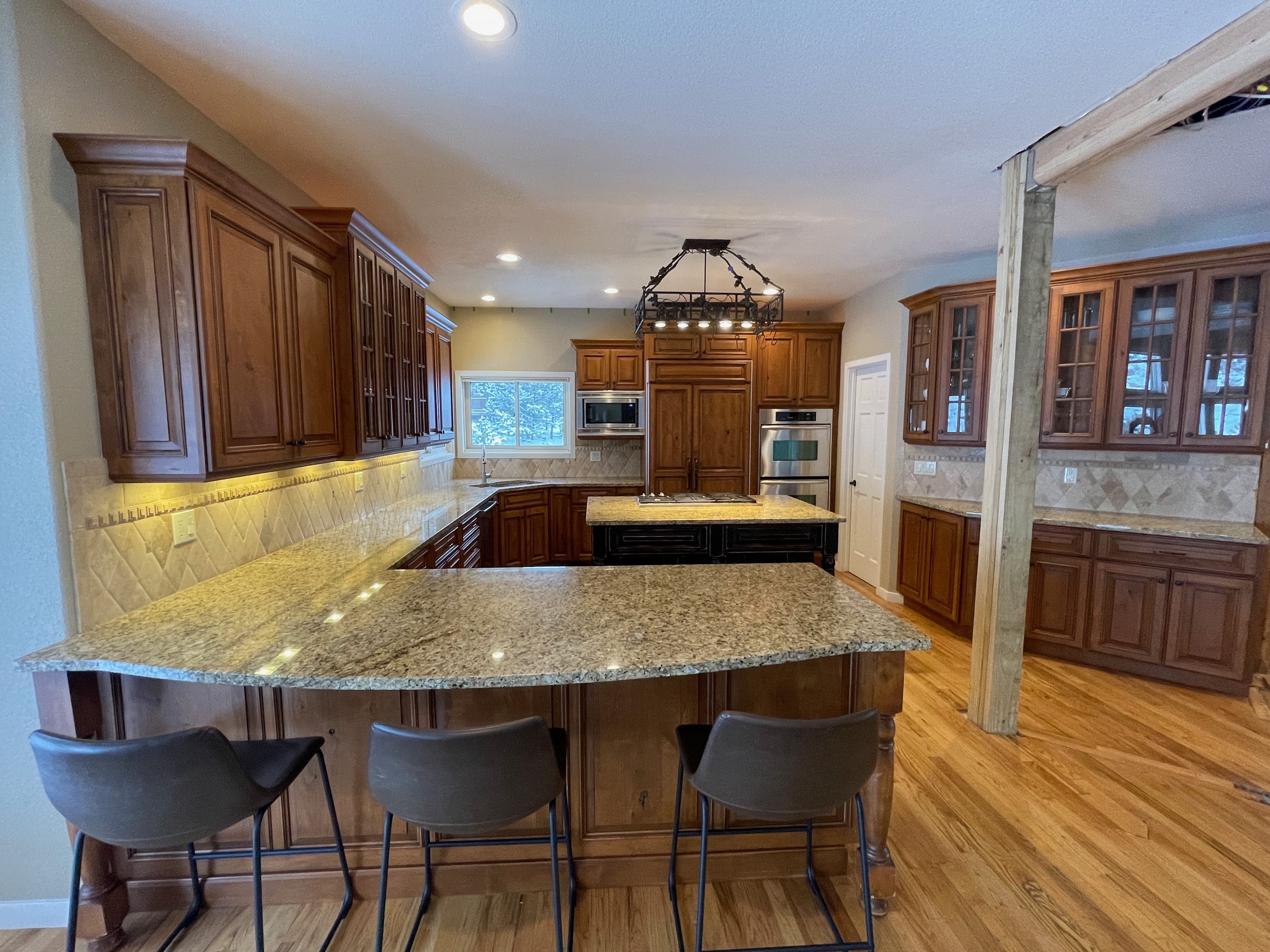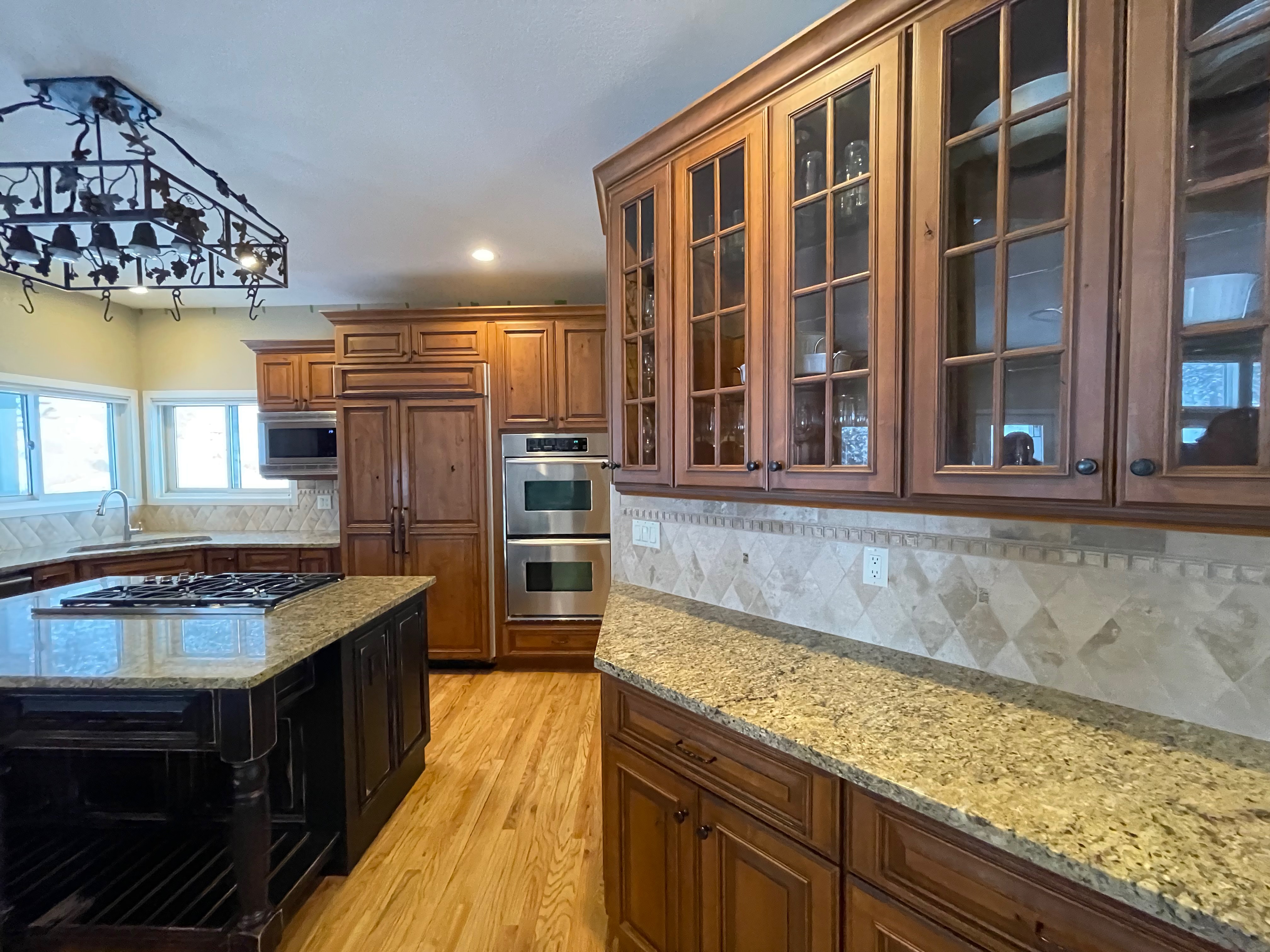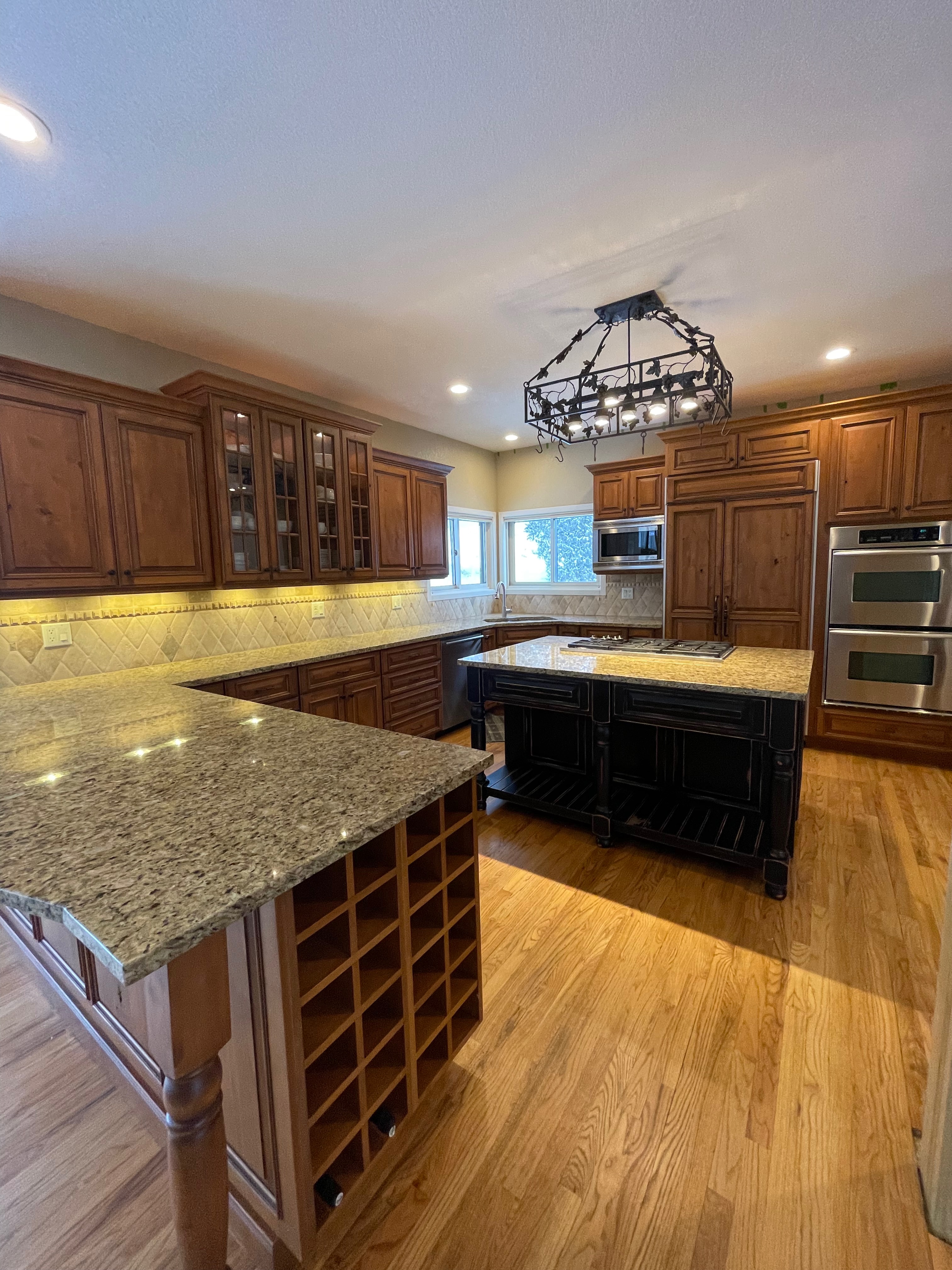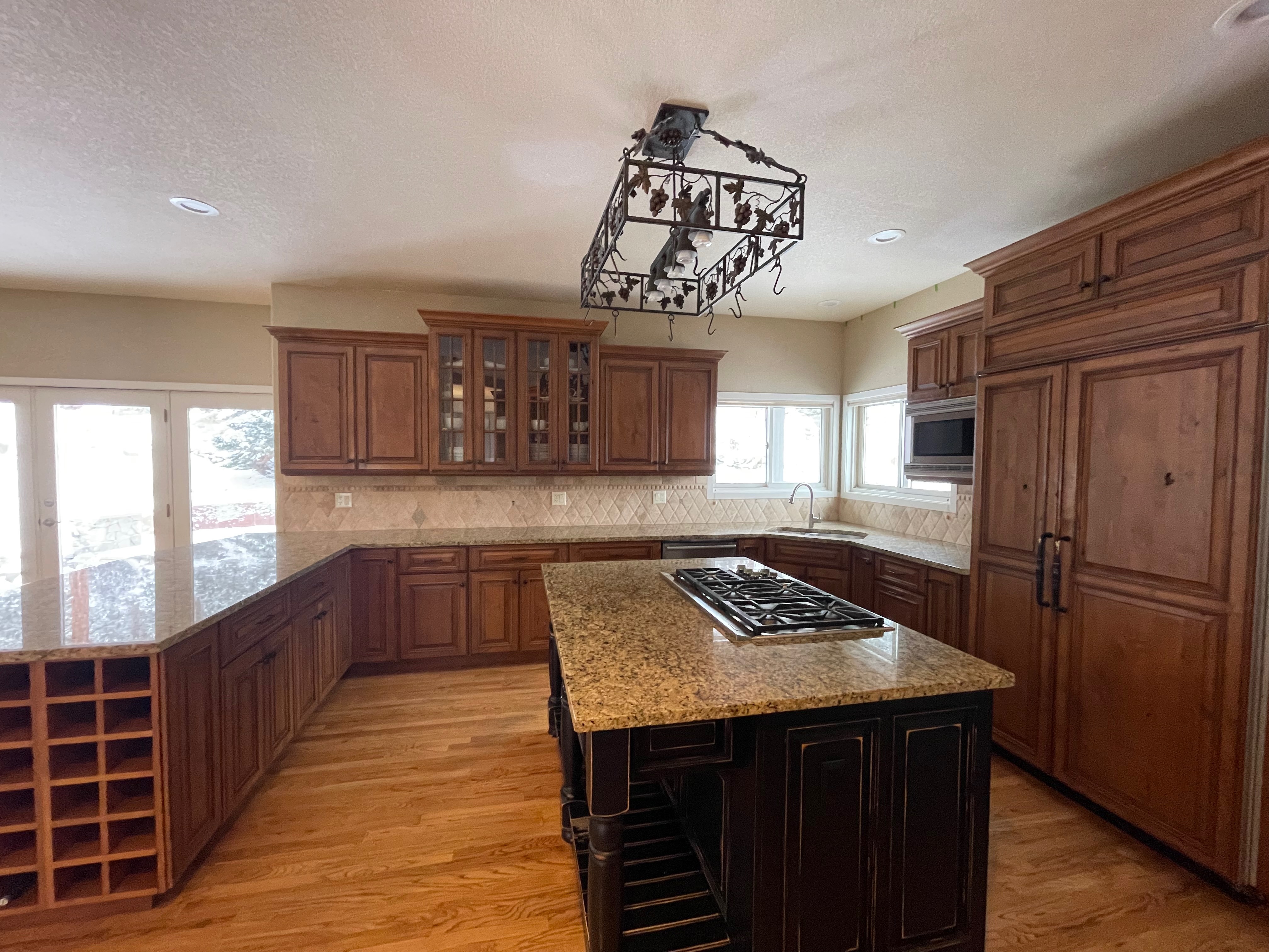 Nice rustic knotty Alder kitchen cabinets made by Woodharbor Custom Cabinetry. The cabinetry is the Worthington door style with a carmel/coffee stain. The 4th photo gives you a good idea of the finish stain.There is Worthington contrasting black wood island and hutch in paintable olde black boot. Woodharbor still manufactures the cabinetry if you need to buy additional pieces. The kitchen includes a Kitchen Aid refrigerator and oven, Wolf cooktop, downdraft and LG microwave. The kitchen can be removed as soon as February by a qualified buyer or licensed sub-contractors can be hired to remove the kitchen. Drawings attached. Price for the package below.