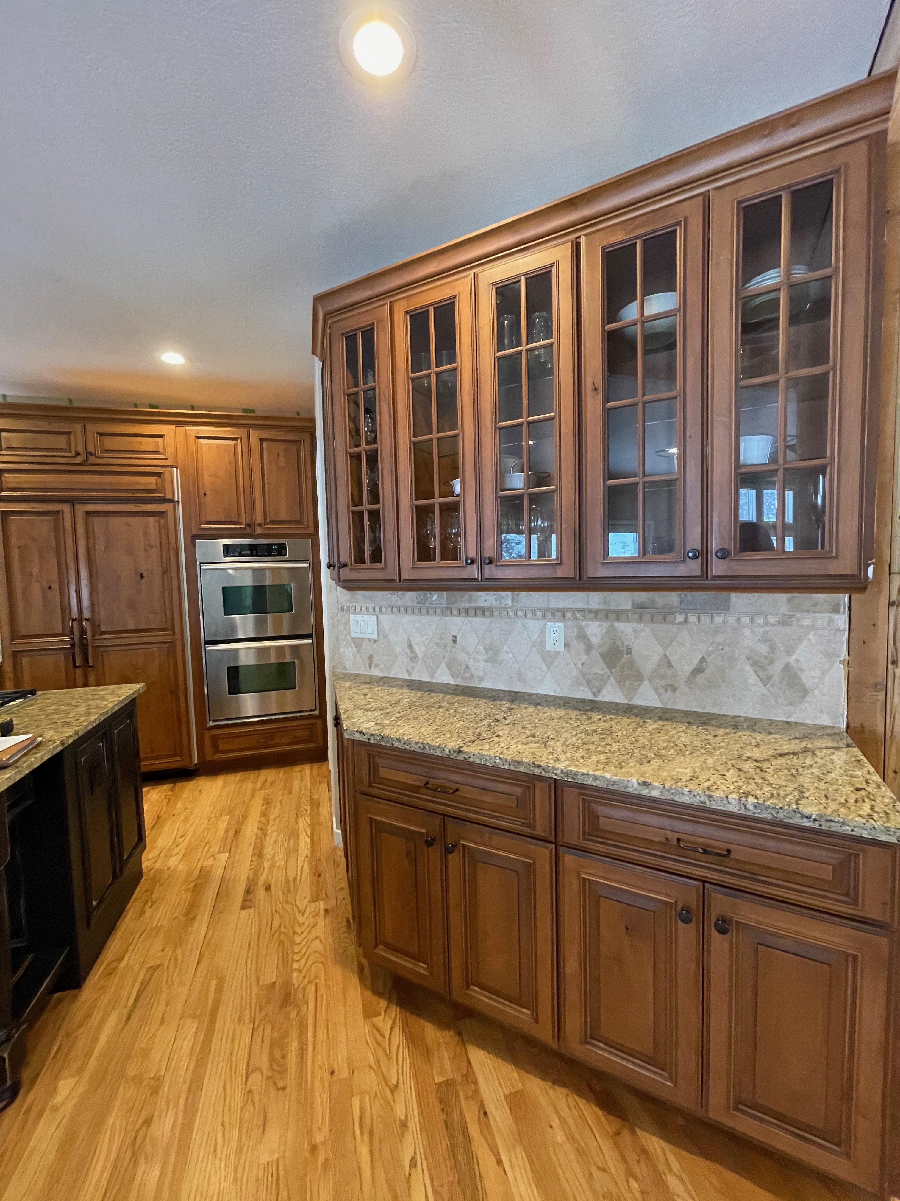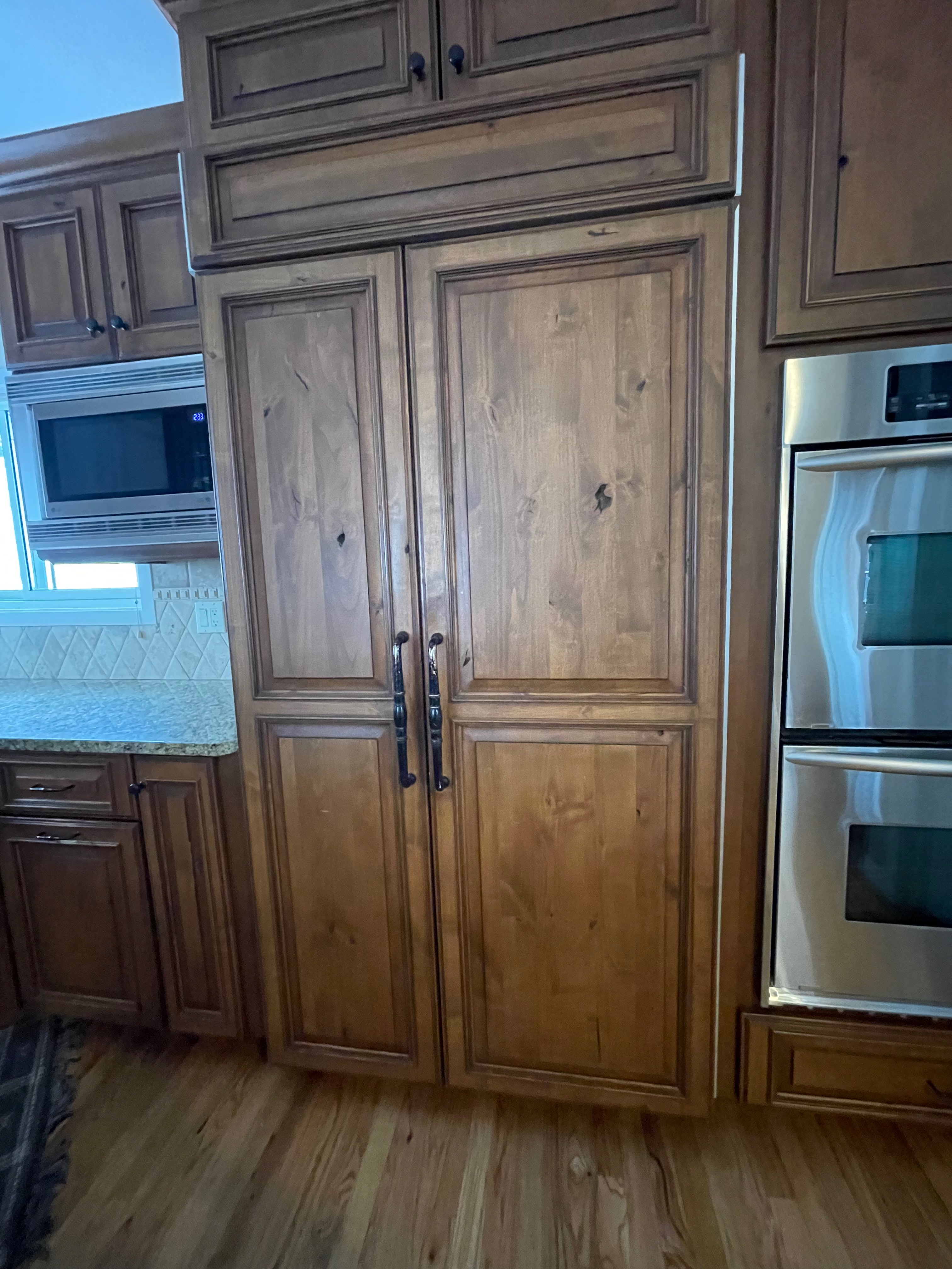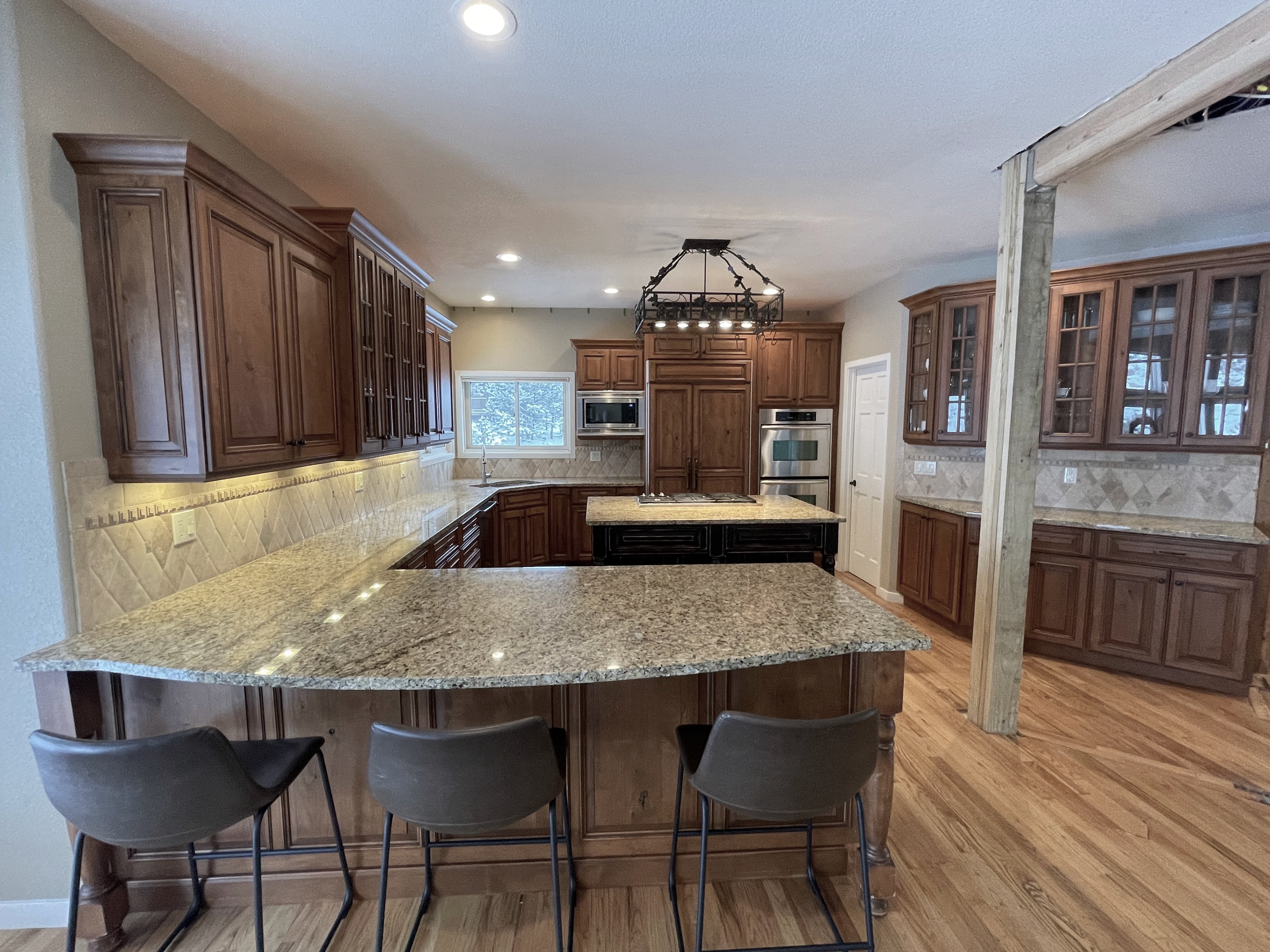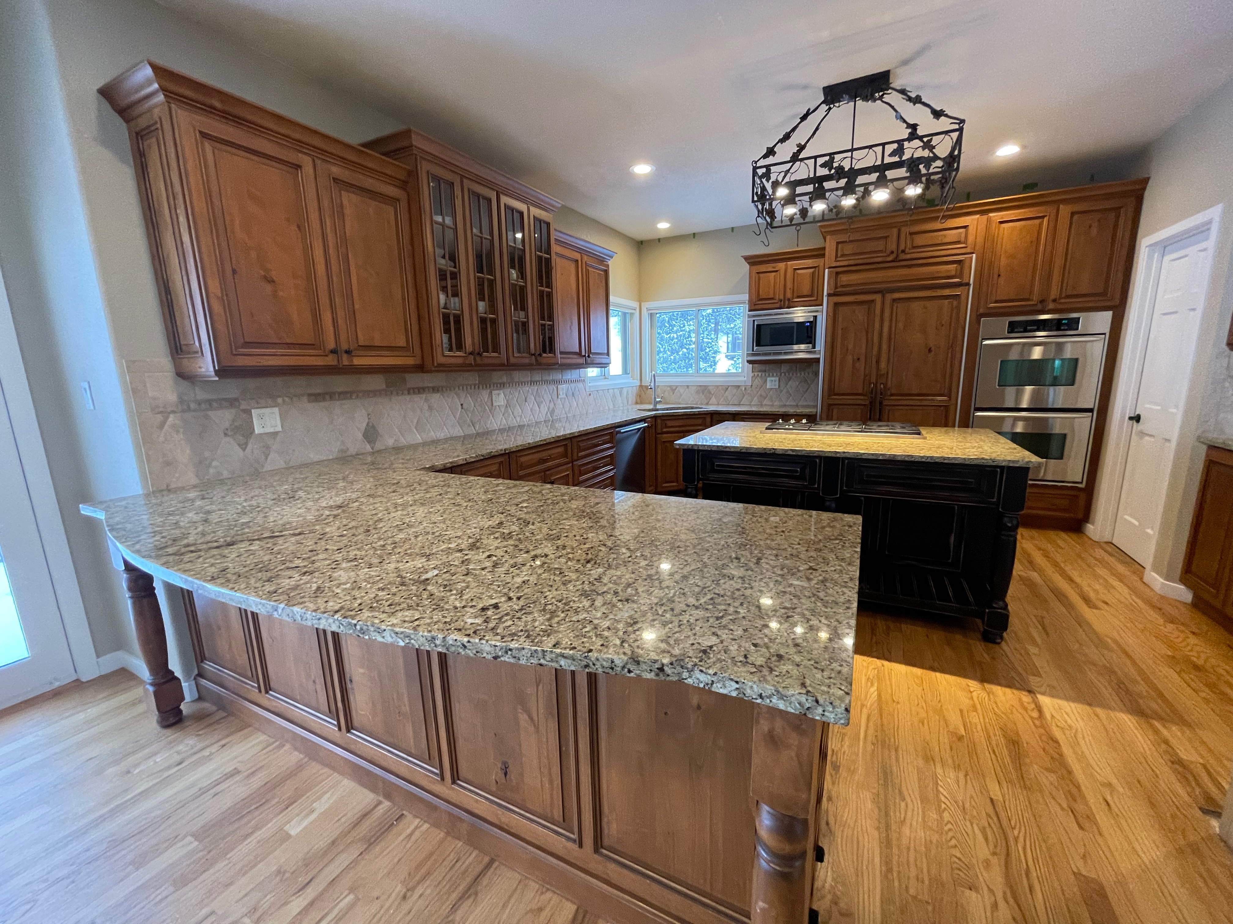 Nice rustic knotty Alder kitchen cabinets made by Woodharbor Custom Cabinetry. The cabinetry is the Worthington door style with a carmel/coffee stain. The 4th photo gives you a good idea of the finish stain.There is Worthington contrasting black wood island and hutch in paintable olde black boot. Woodharbor still manufactures the cabinetry if you need to buy additional pieces. The kitchen includes a Kitchen Aid refrigerator and oven, Wolf cooktop, downdraft and LG microwave. The kitchen can be removed as soon as February by a qualified buyer or licensed sub-contractors can be hired to remove the kitchen. Drawings attached. Price for the package below.