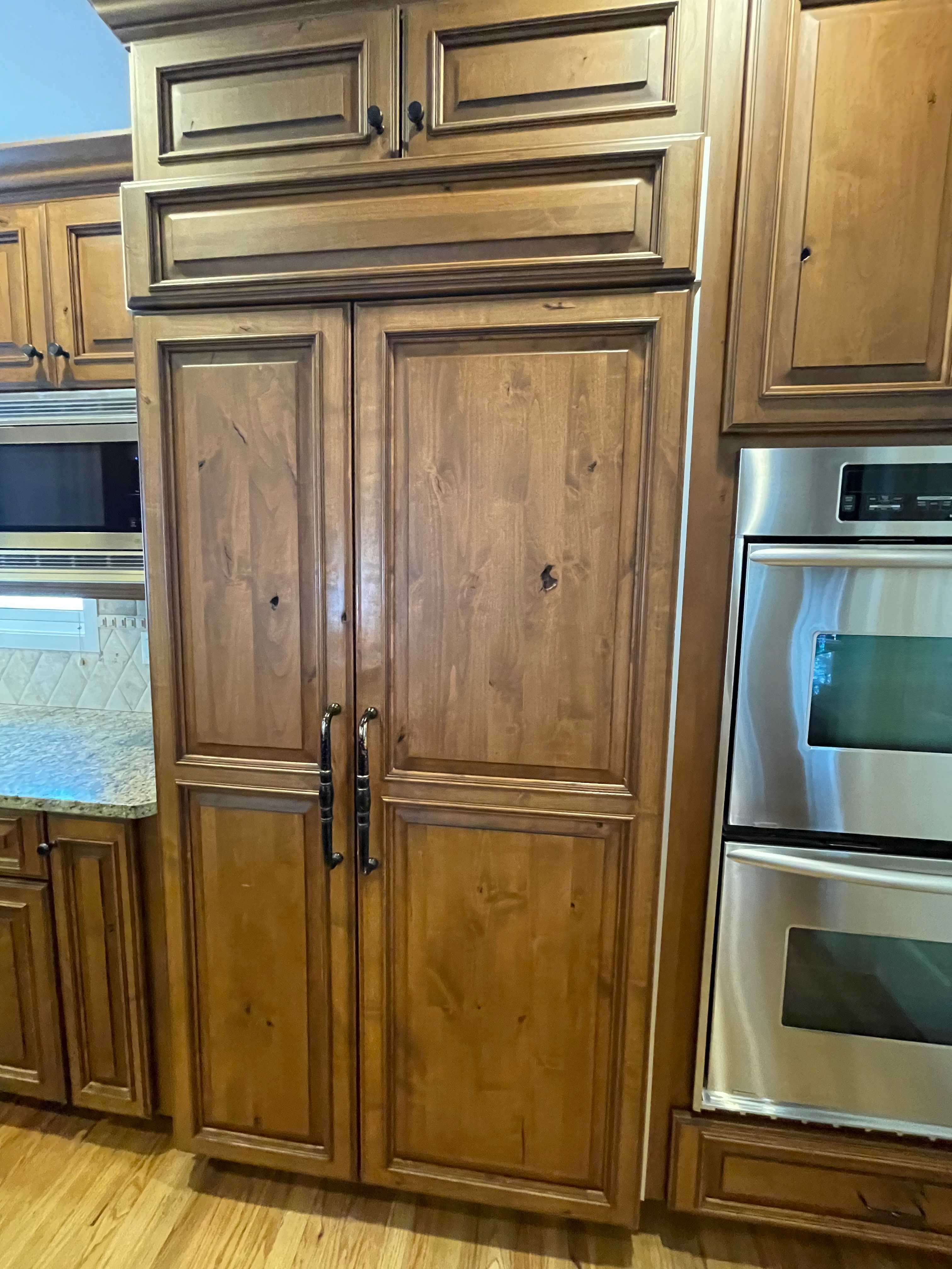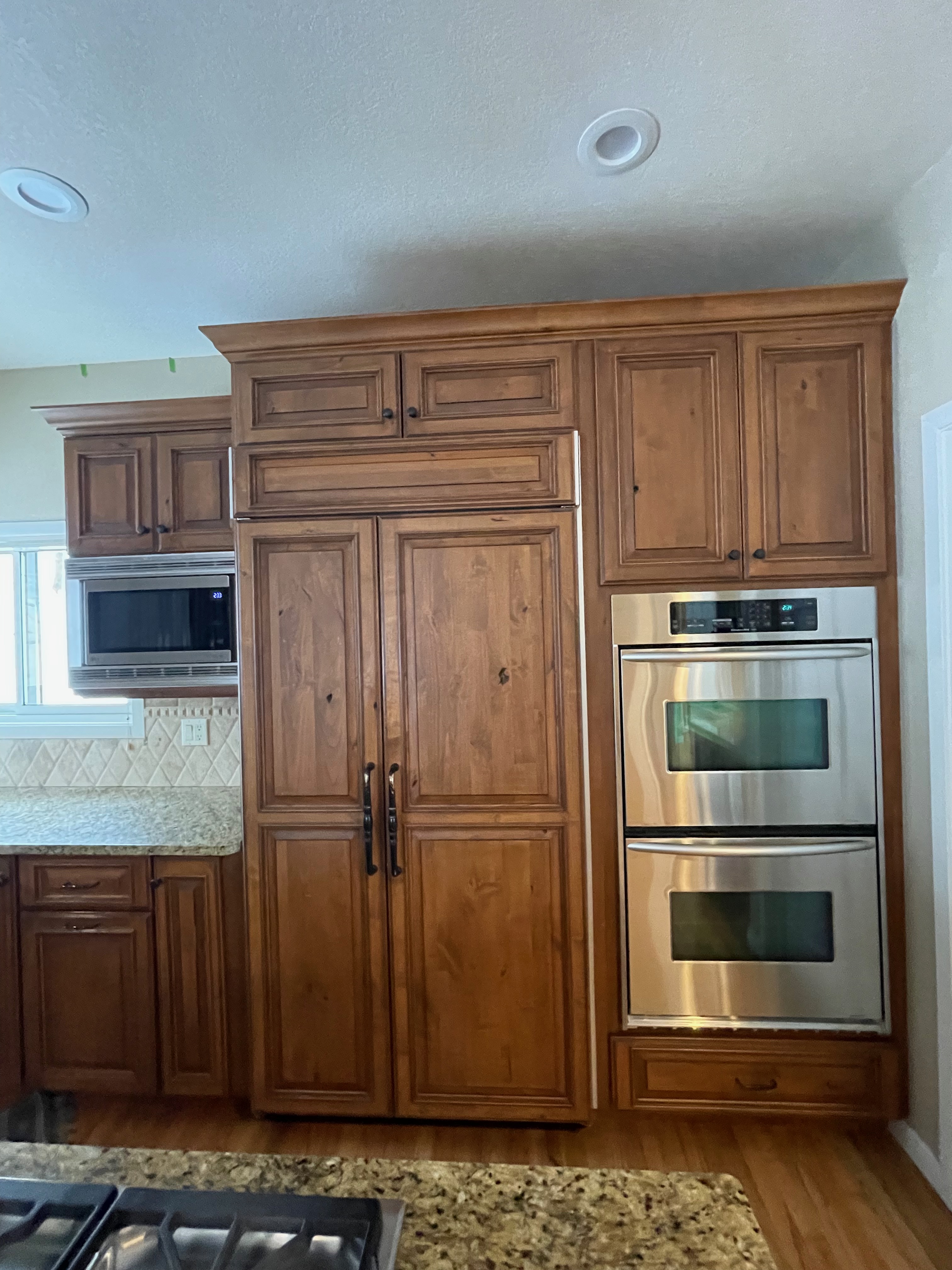 1-Two door, one drawer double tall oven wall cabinet Dim.: 33“w x 95 1/2“h no crown/ 98 ¾”h w/ crown x 24”d