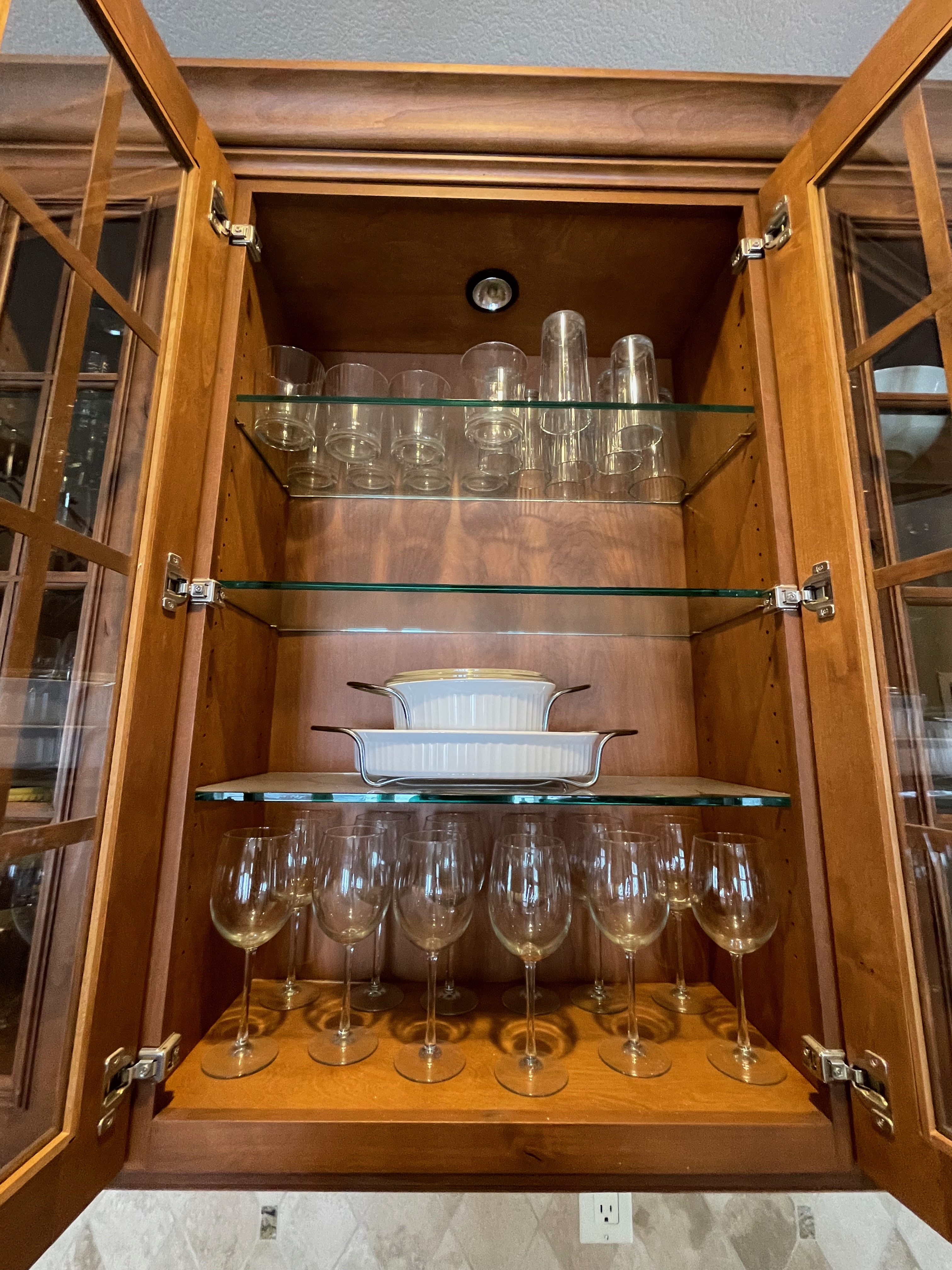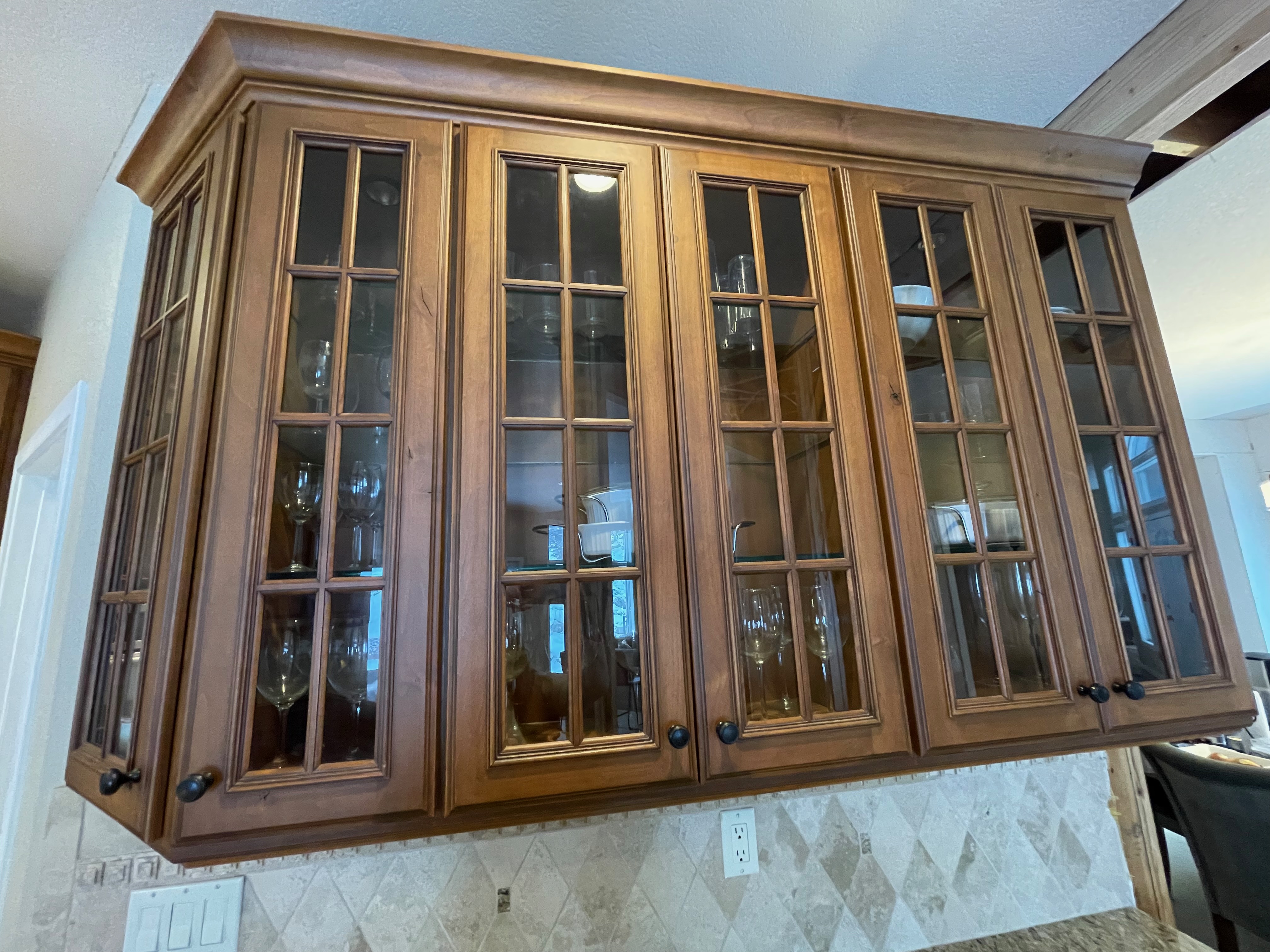 2-Two door glass front wall cabinets Dim.: 24“w x 42“h cab. only/ 44 3/4”h w/crown/46”w bottom trim x 14“d