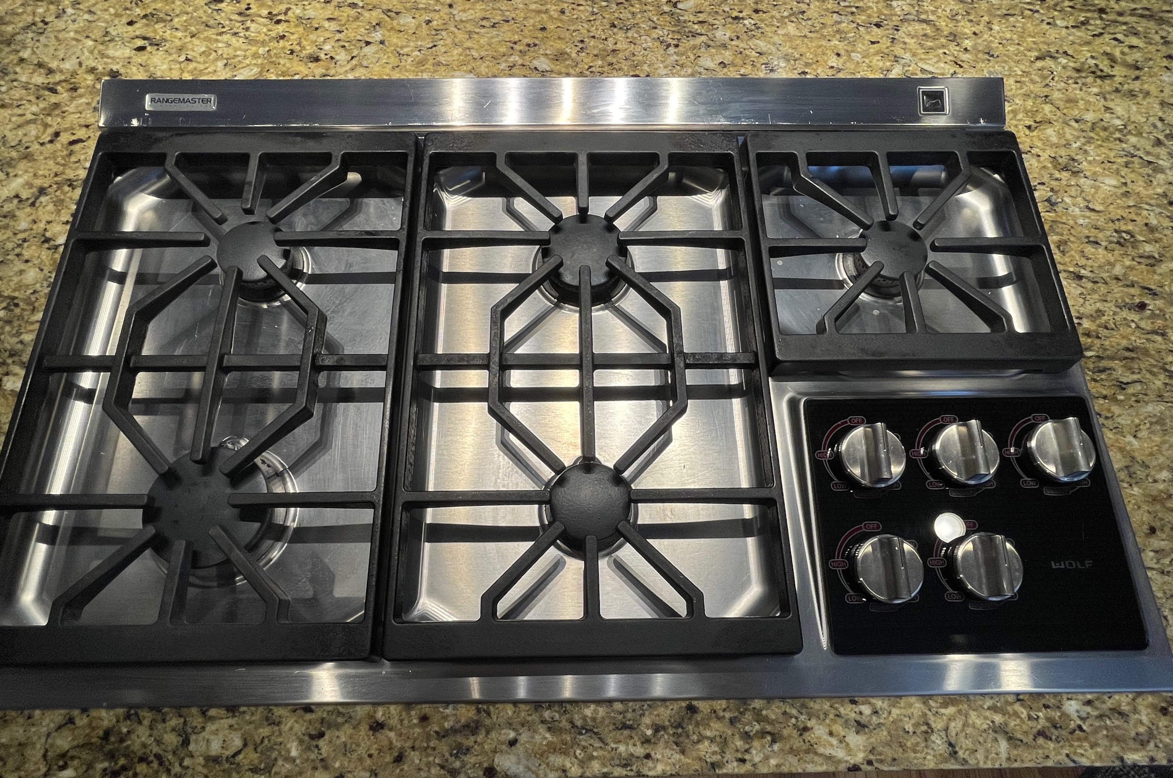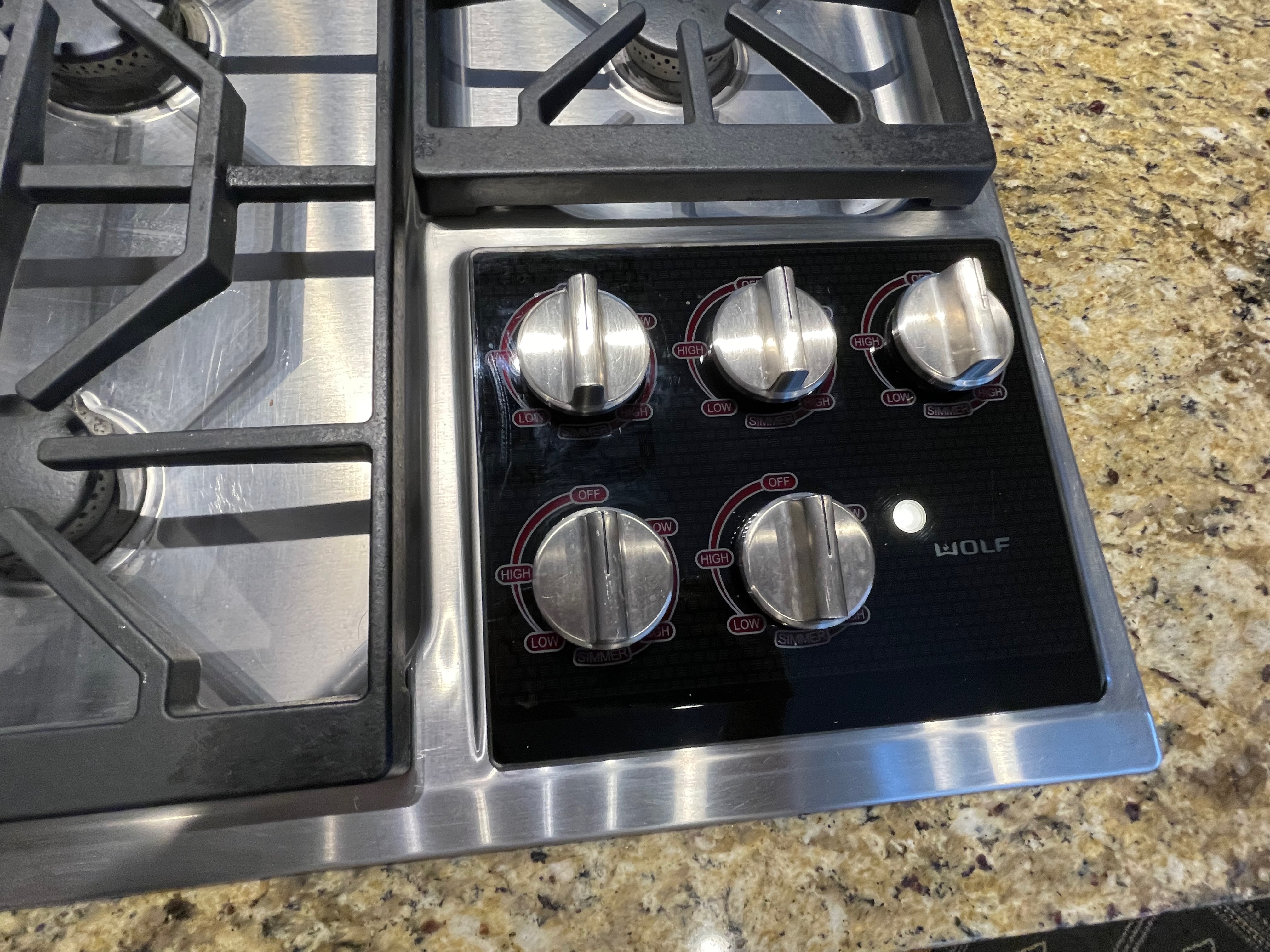 36” Wolf 5 burner gas cooktop Model#CT36G/S Serial#11204445, Listing price new $2,500