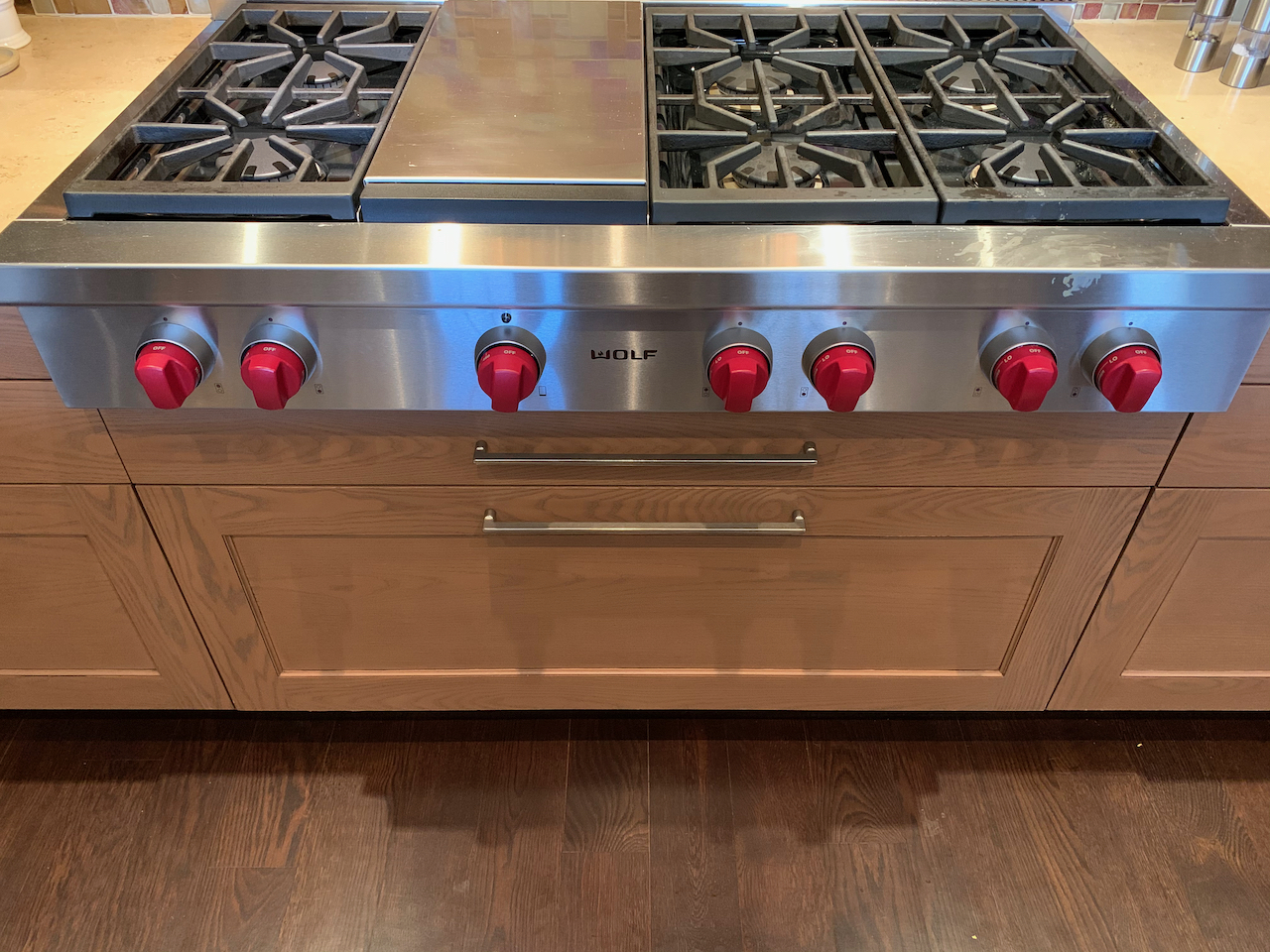 48” Wolf Stainless Steel 6 burner gas Range top with griddle Model #SRT486G, Serial #17156003, New $5,290