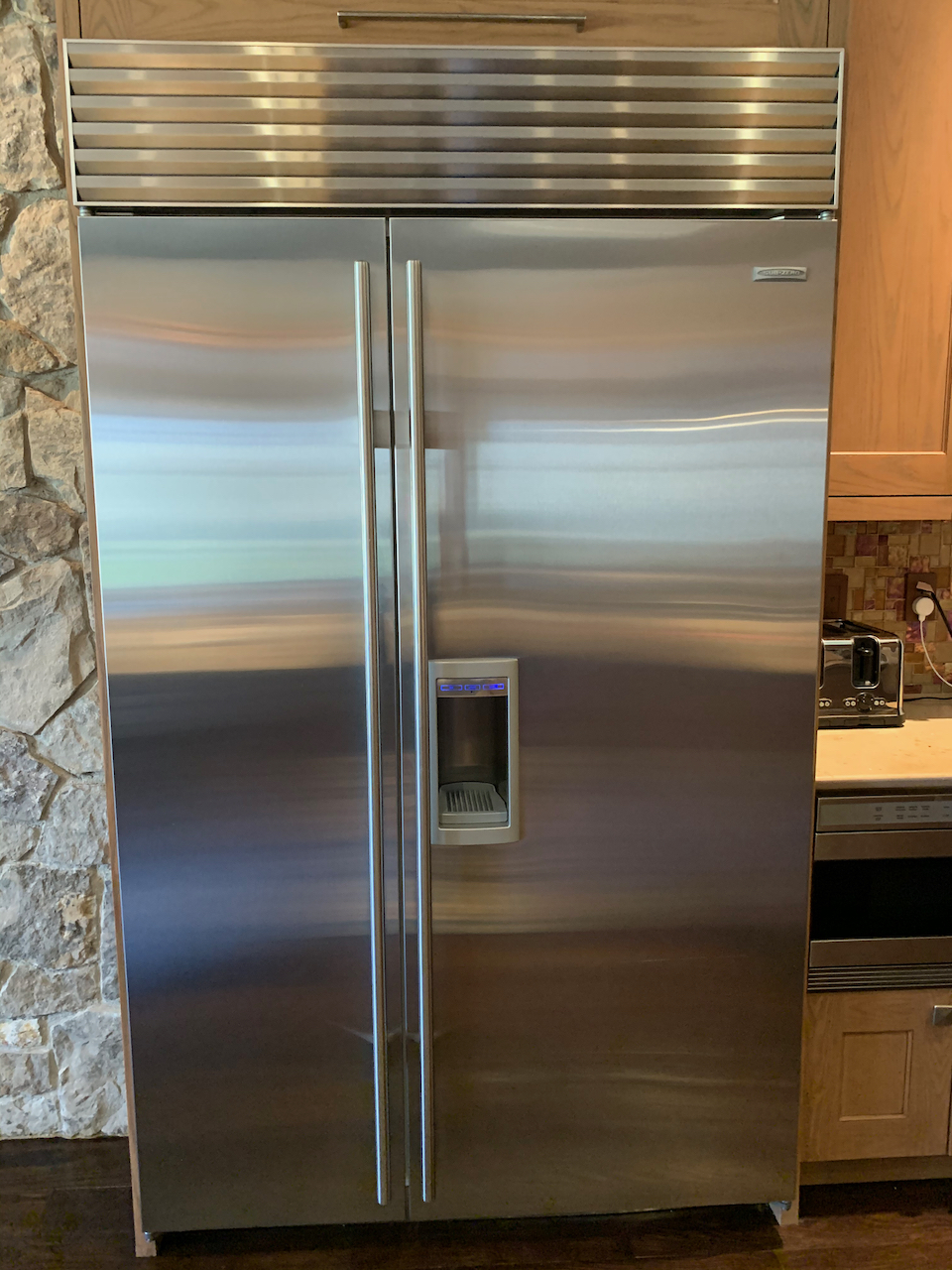 48” Sub-Zero Stainless Steel side x side Refrigerator. Model #BI-48SD/S/TH, Serial #F2942275 3/09, Dim.: 48”w x 84”h x 24”d, New $13,310