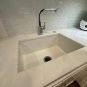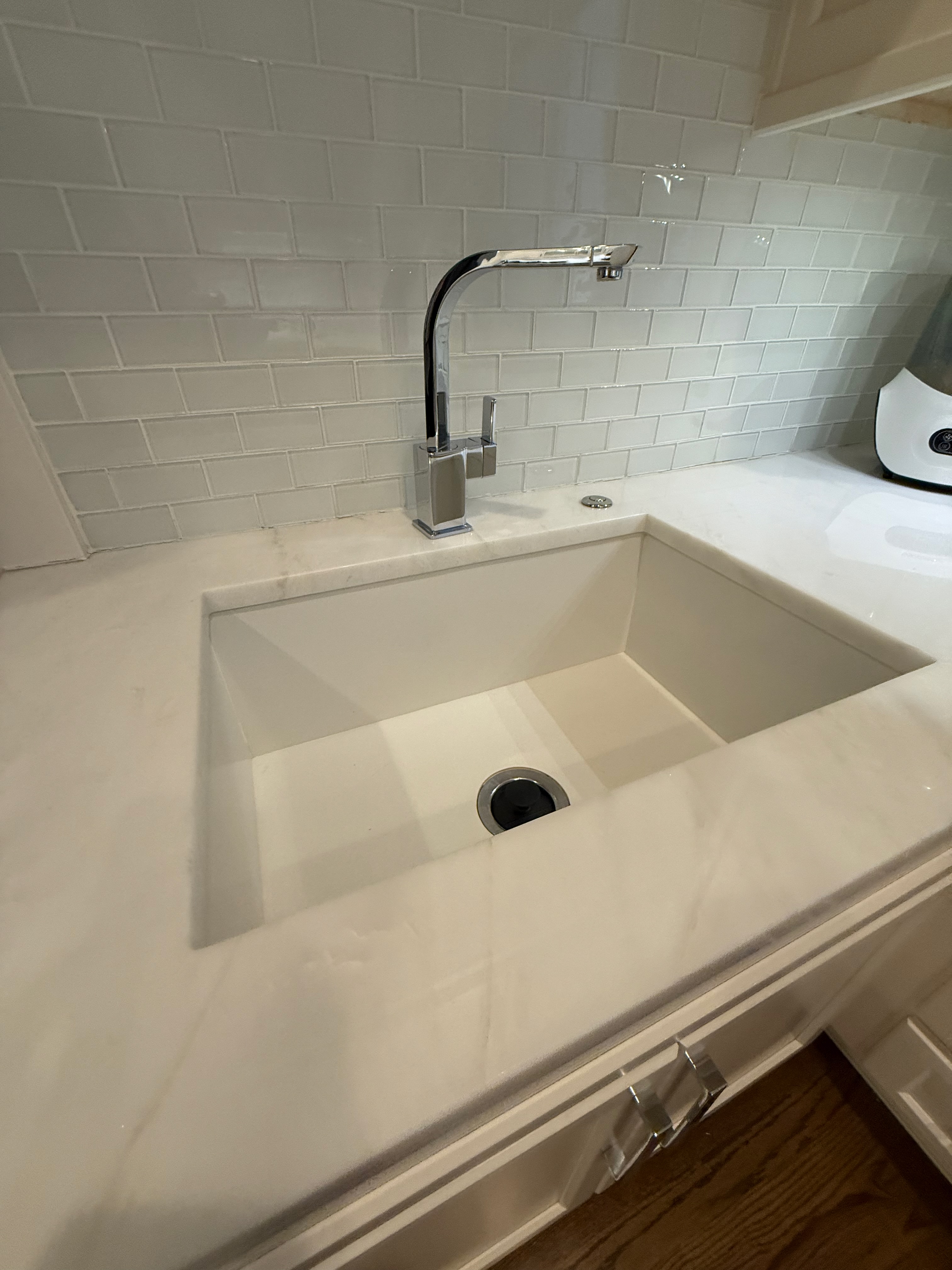 Sink marble wall Dim.: 63 ½”w x 25”d, there was a break in the marble at the sink, it can be repaired