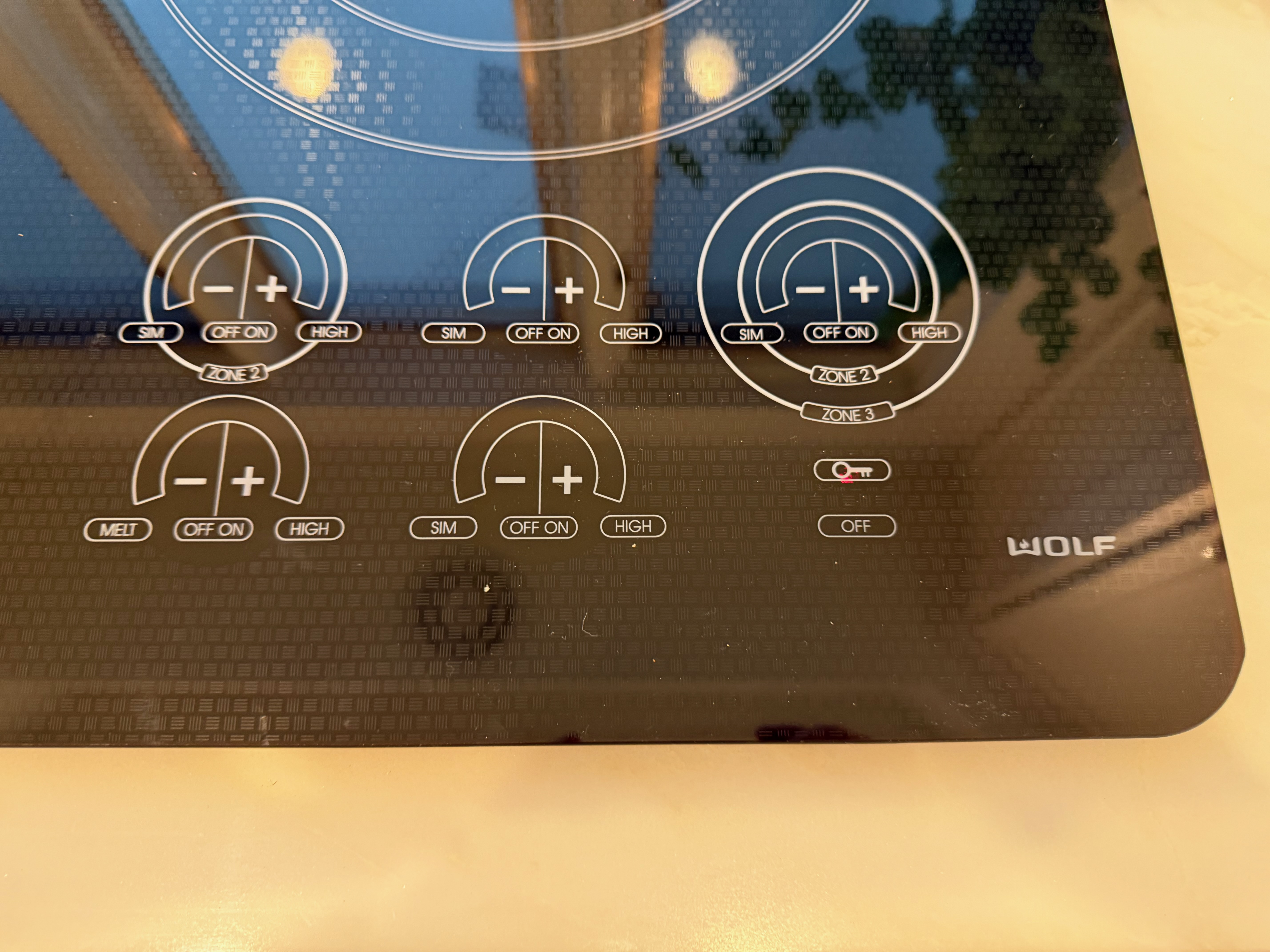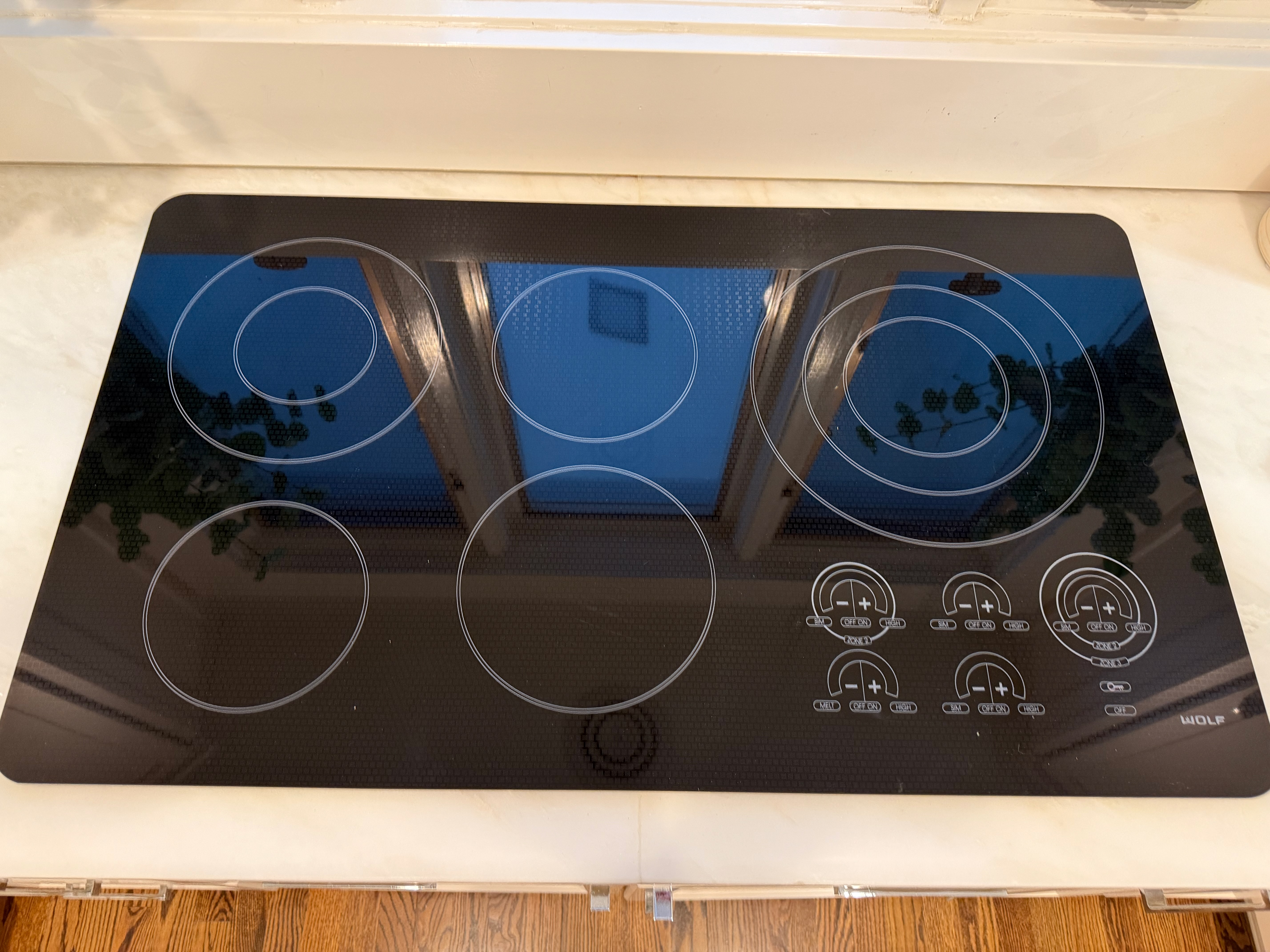 36” Wolf electric cooktop w/ 5 burners 36 Inch Smoothtop Electric Cooktop with 5 Heating Elements, 9 Zones, True Simmer, Temperature Limiter and Illuminated Touch Controls: Unframed Model #CT36EU, Serial #11230843, $2,170/$650-$800