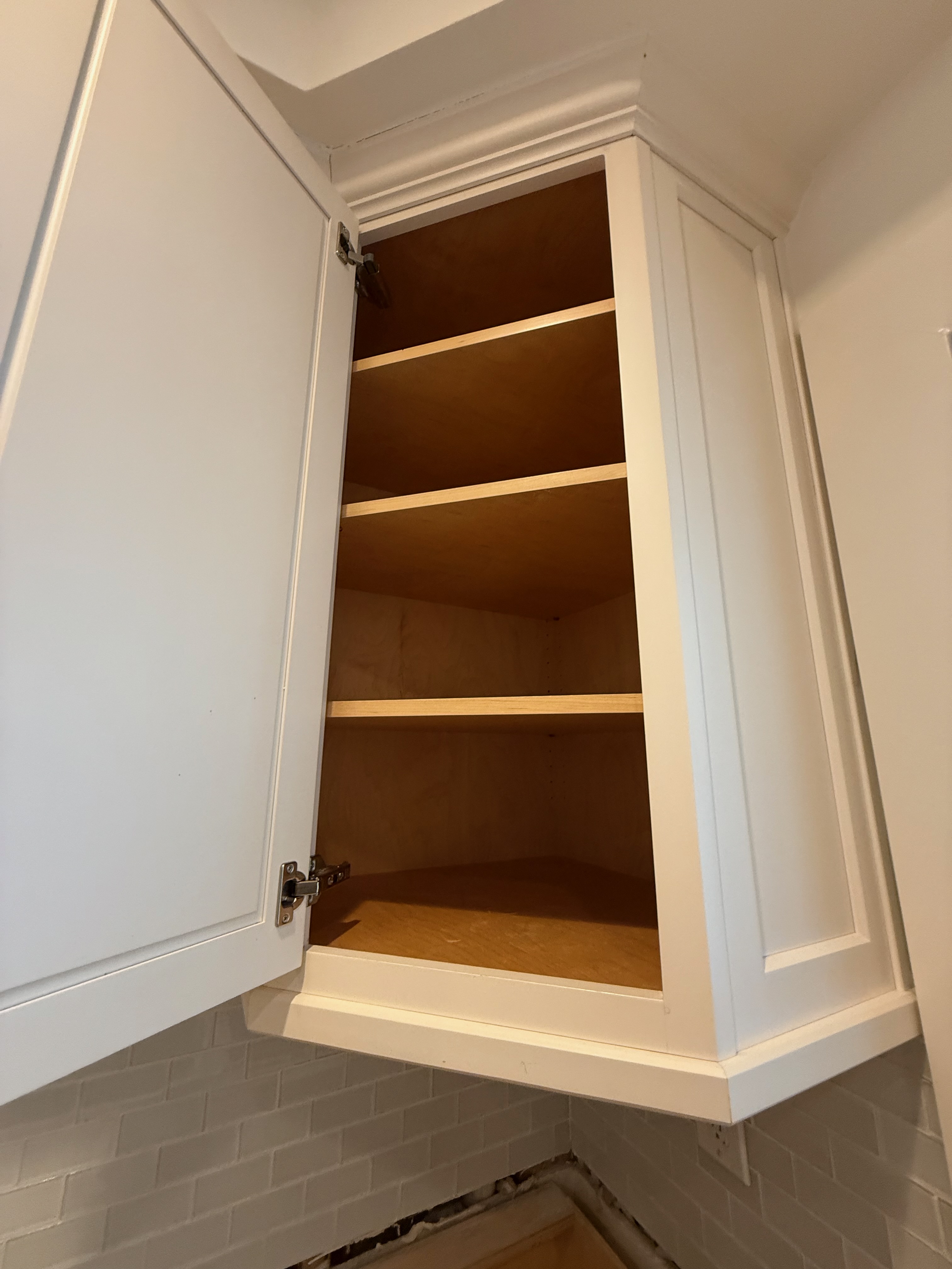 2-One door corner wall cabinet Dim.: 24” w x 39 ¼”h cabinet only /40 ¾” w/ bottom trim/44”h w/ the crown x