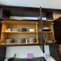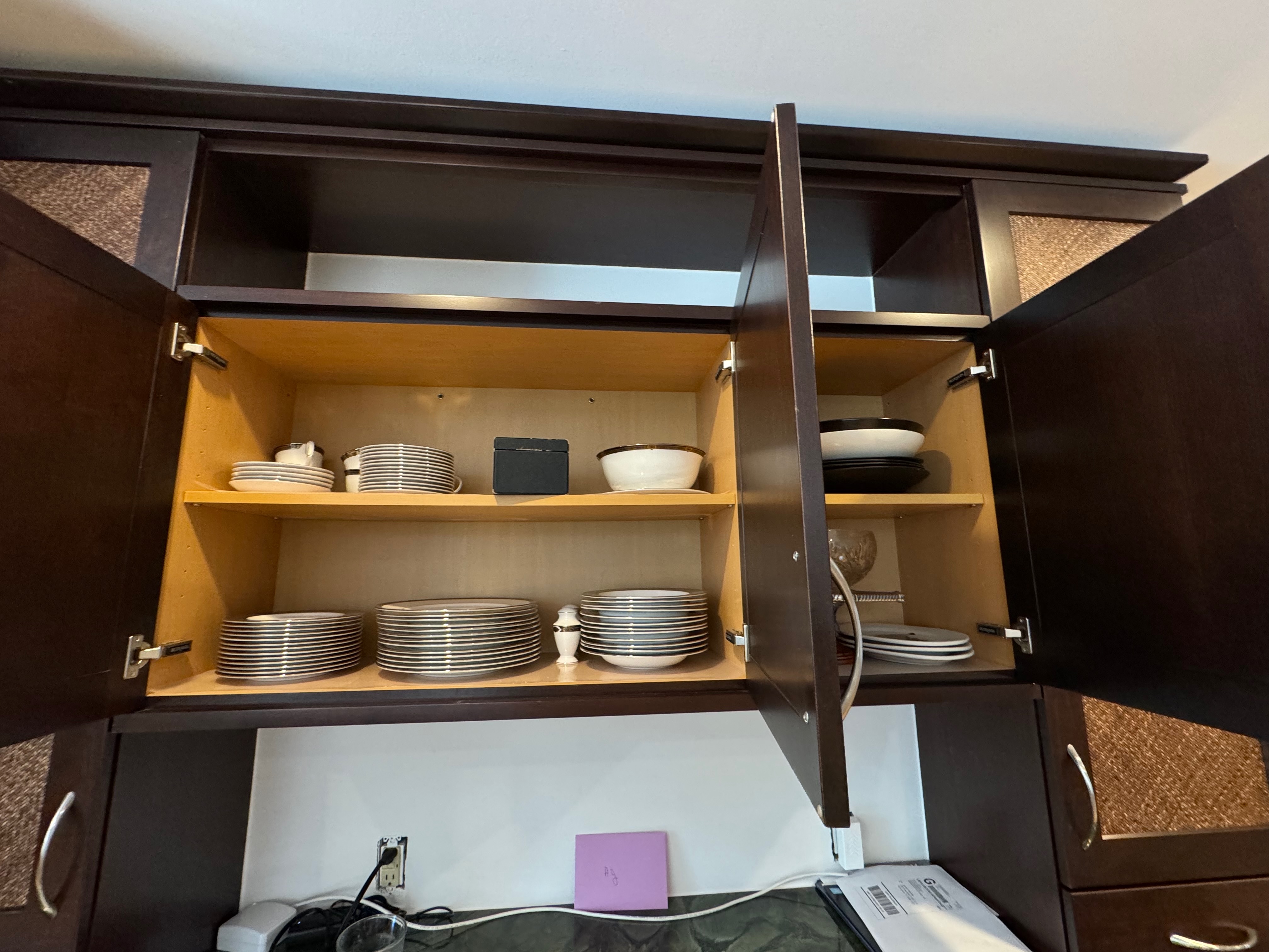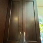 2-One door, One drawer counter wall cabinets in the darker finish with cane inserts in the doors Dim.: 18” w x 54”h cabinet only/57”h with crown x 14”d