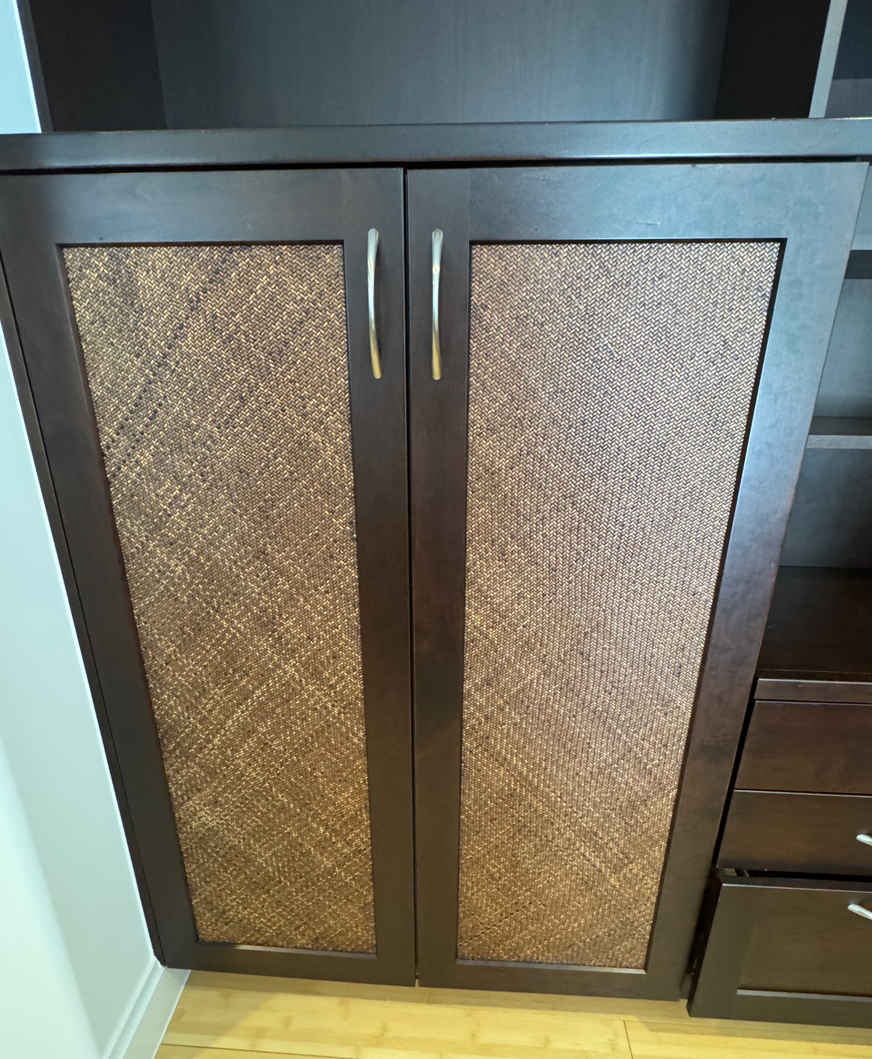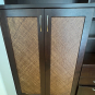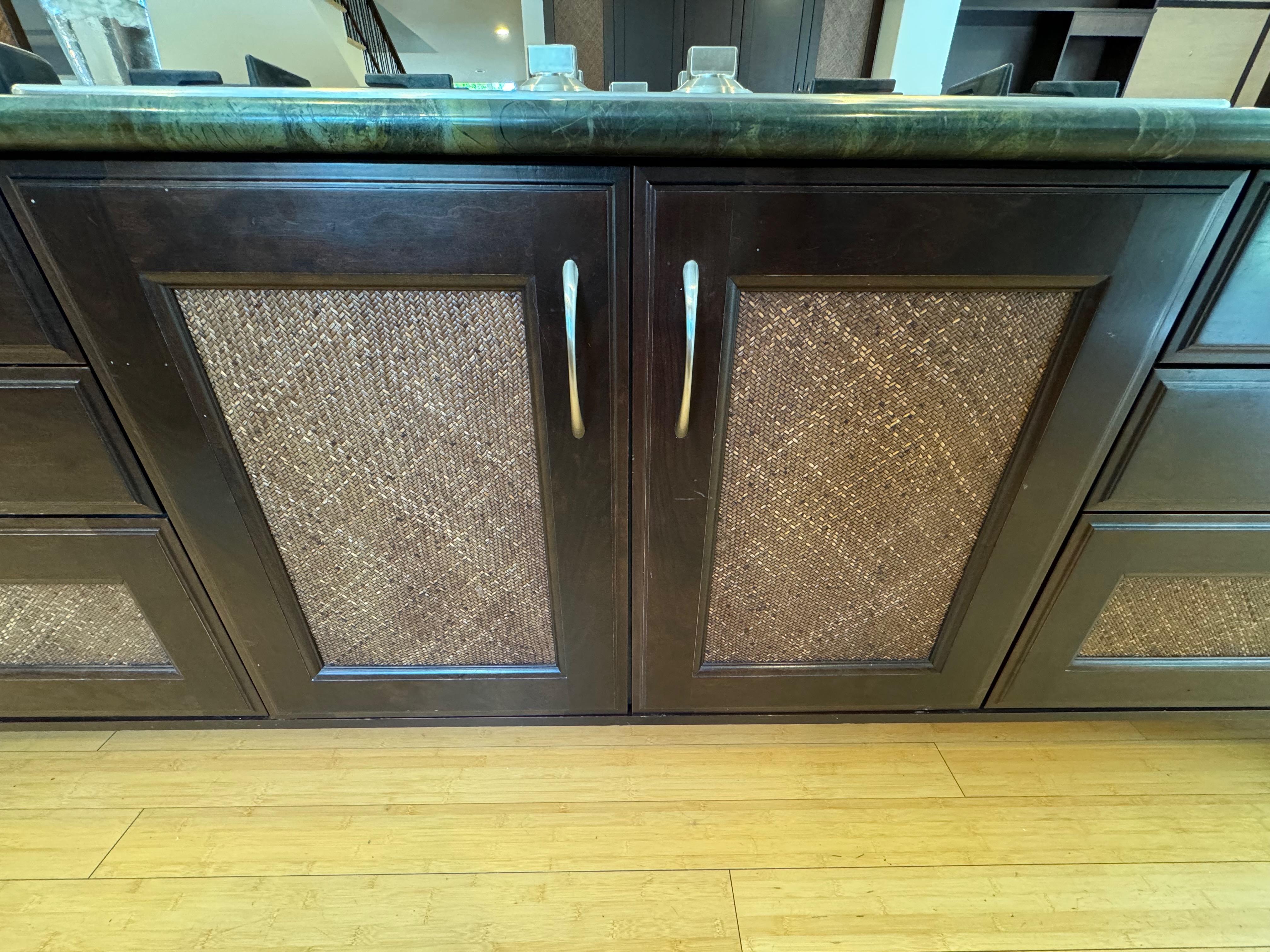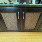 1-Two door base cabinet that holds the cooktop and downdraft in the darker finish with cane inserts in the doors Dim.: 36”w x 36”h x 24”d