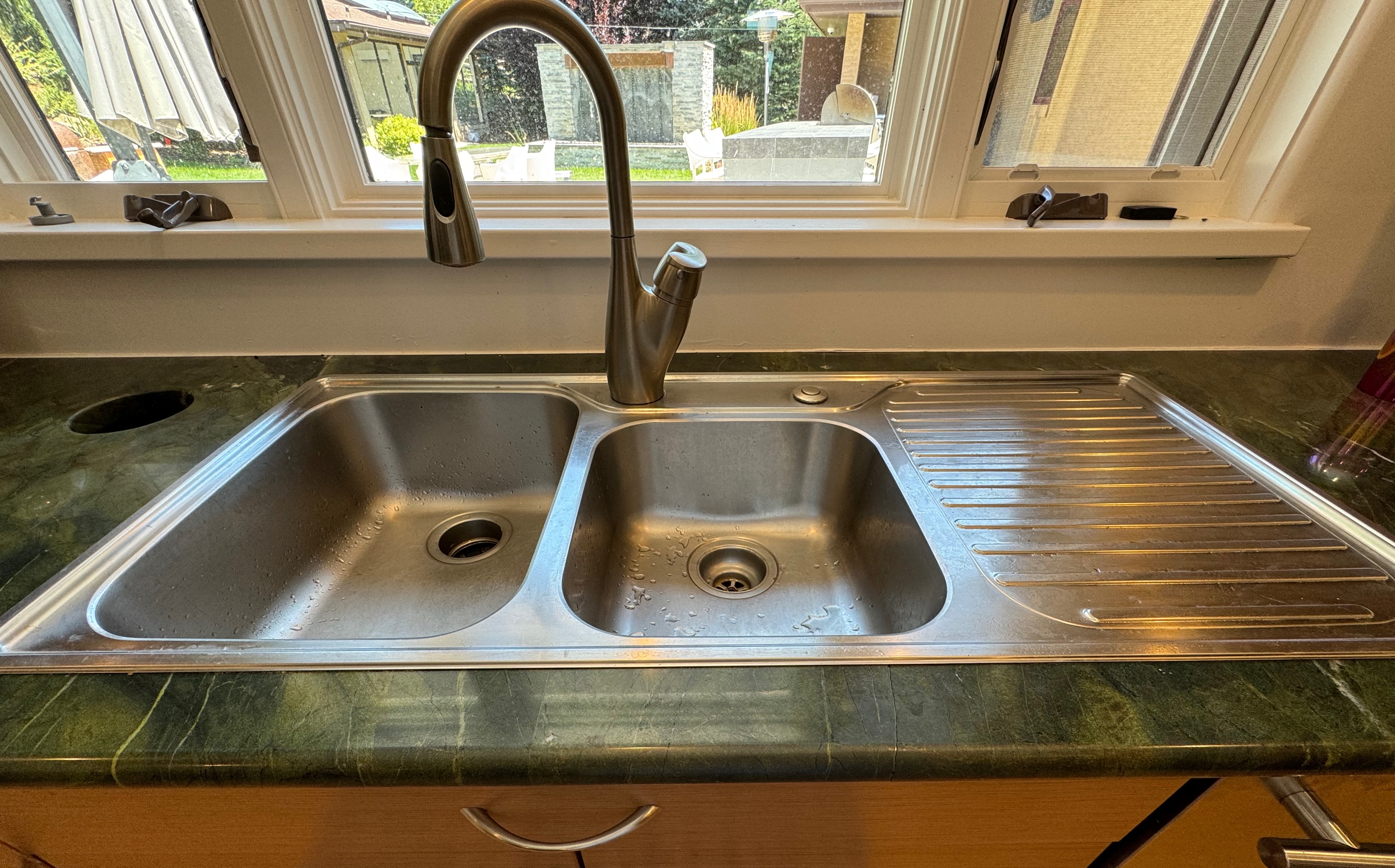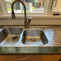 1-Two door sink base in the lighter finish Dim. 36” w x 36”h x 24” d, Two basin stainless steel work station sink with a drainboard 46” w x 20” d with faucet set and disposal