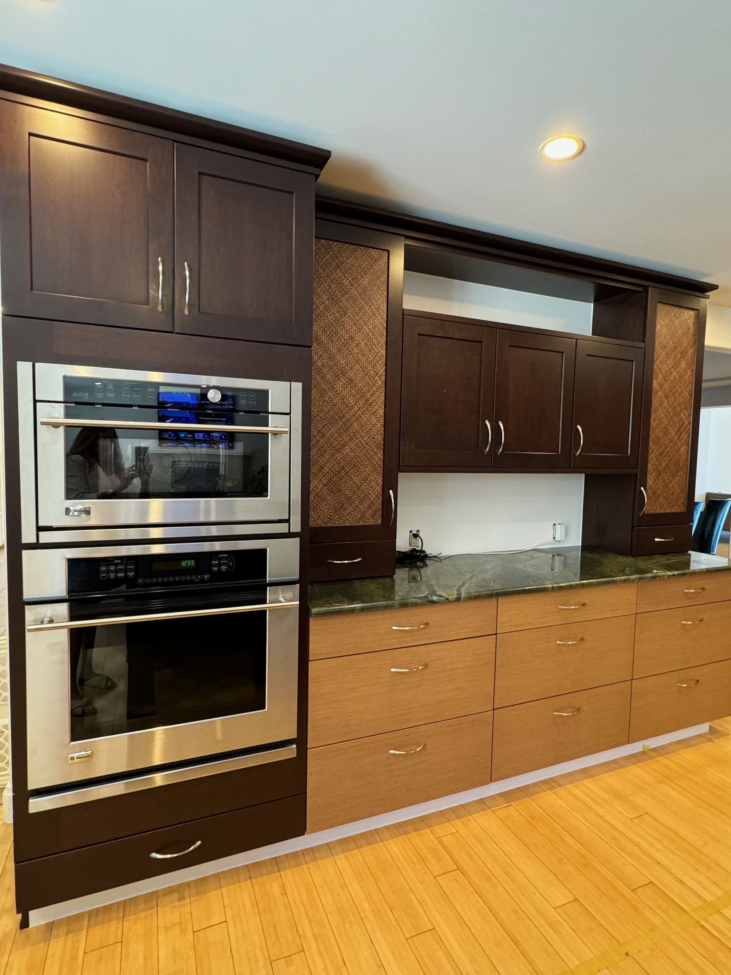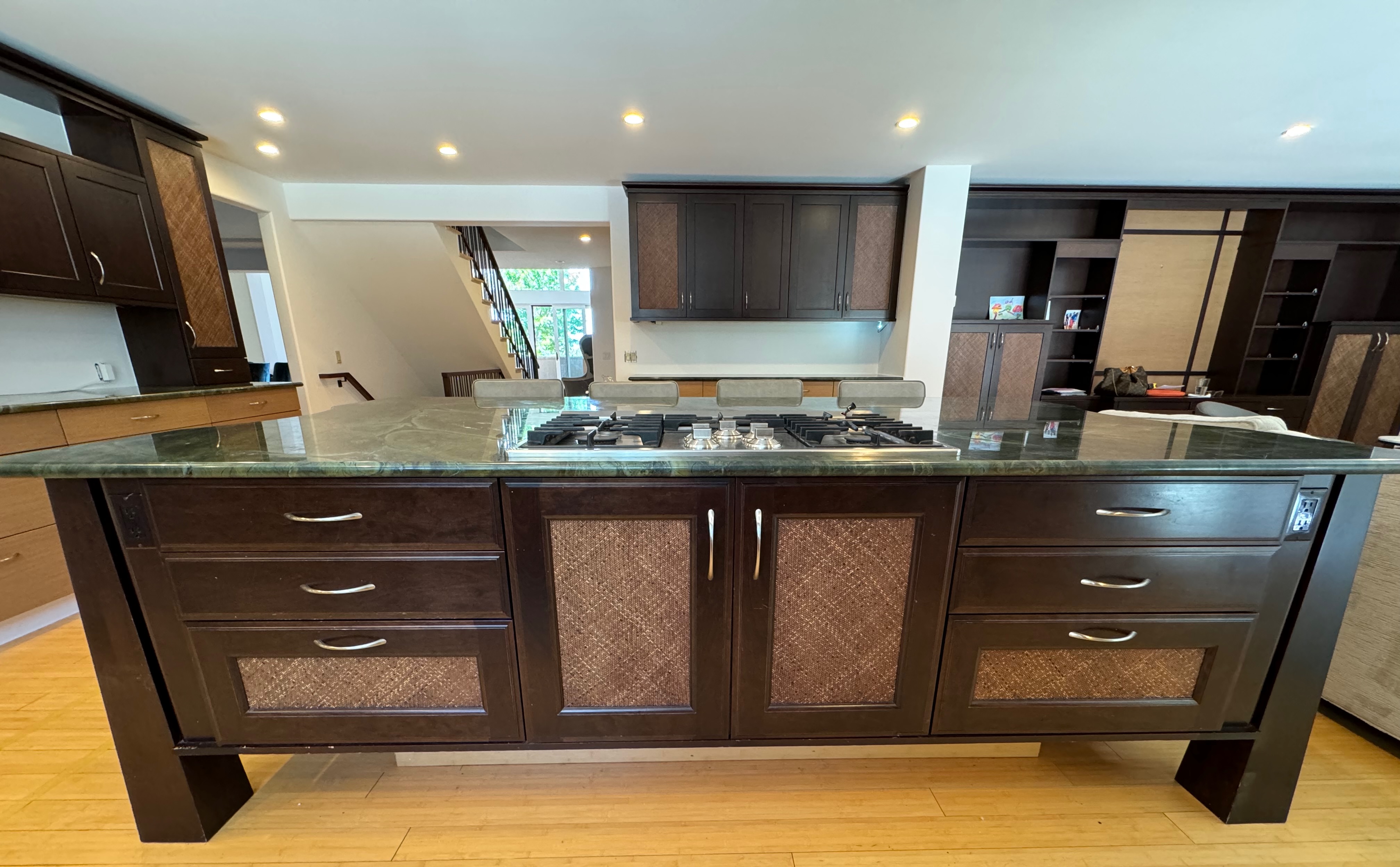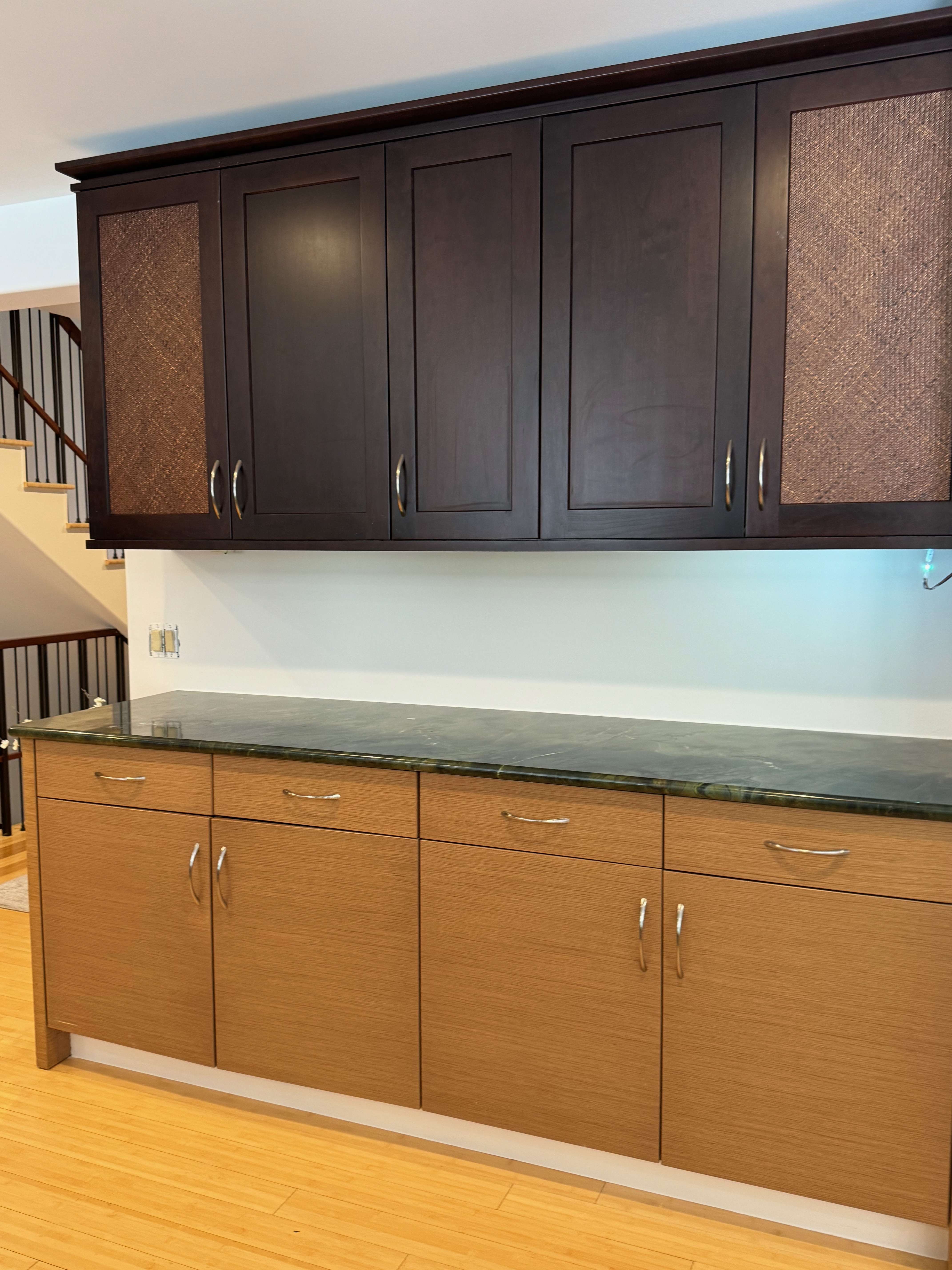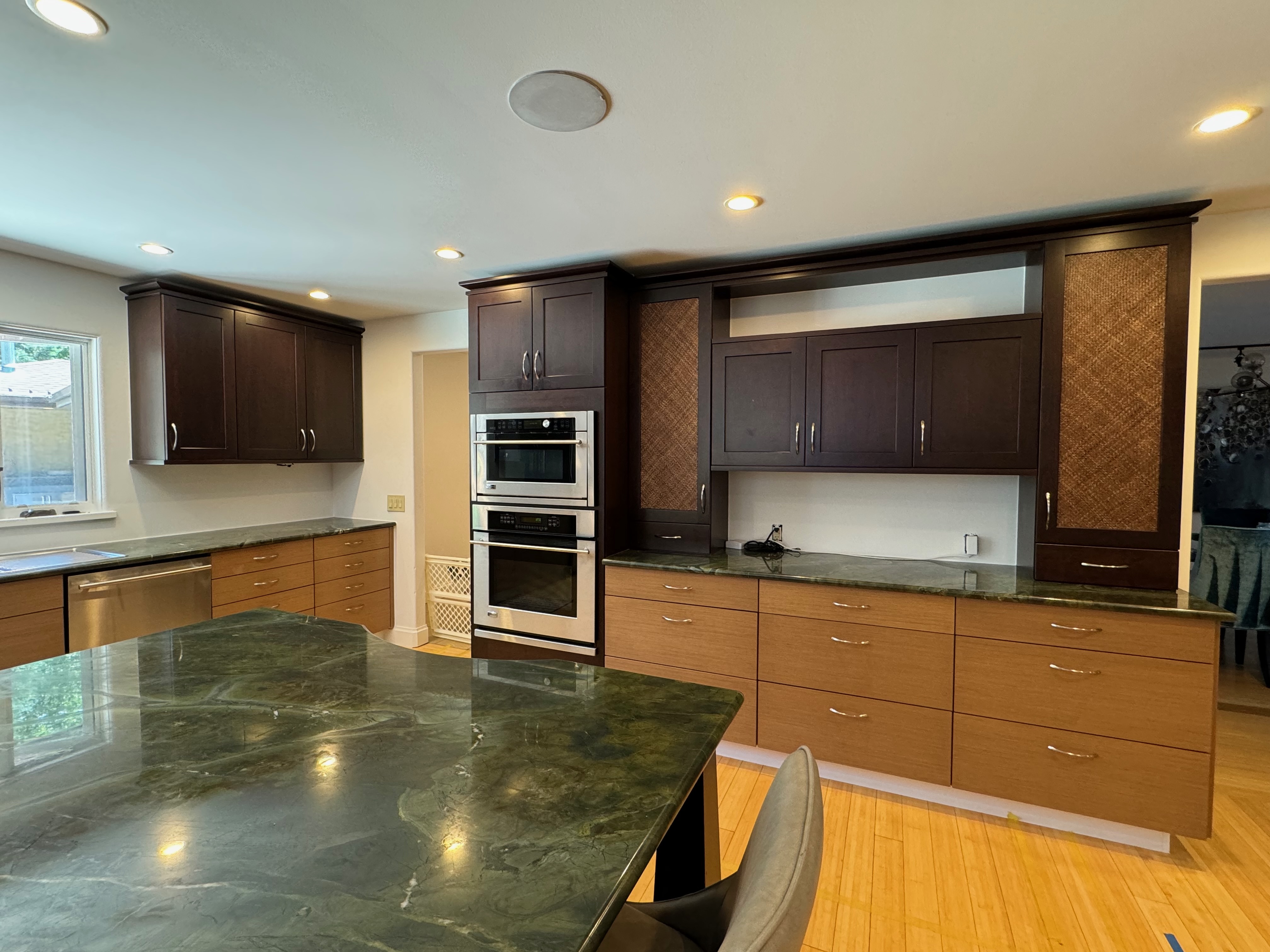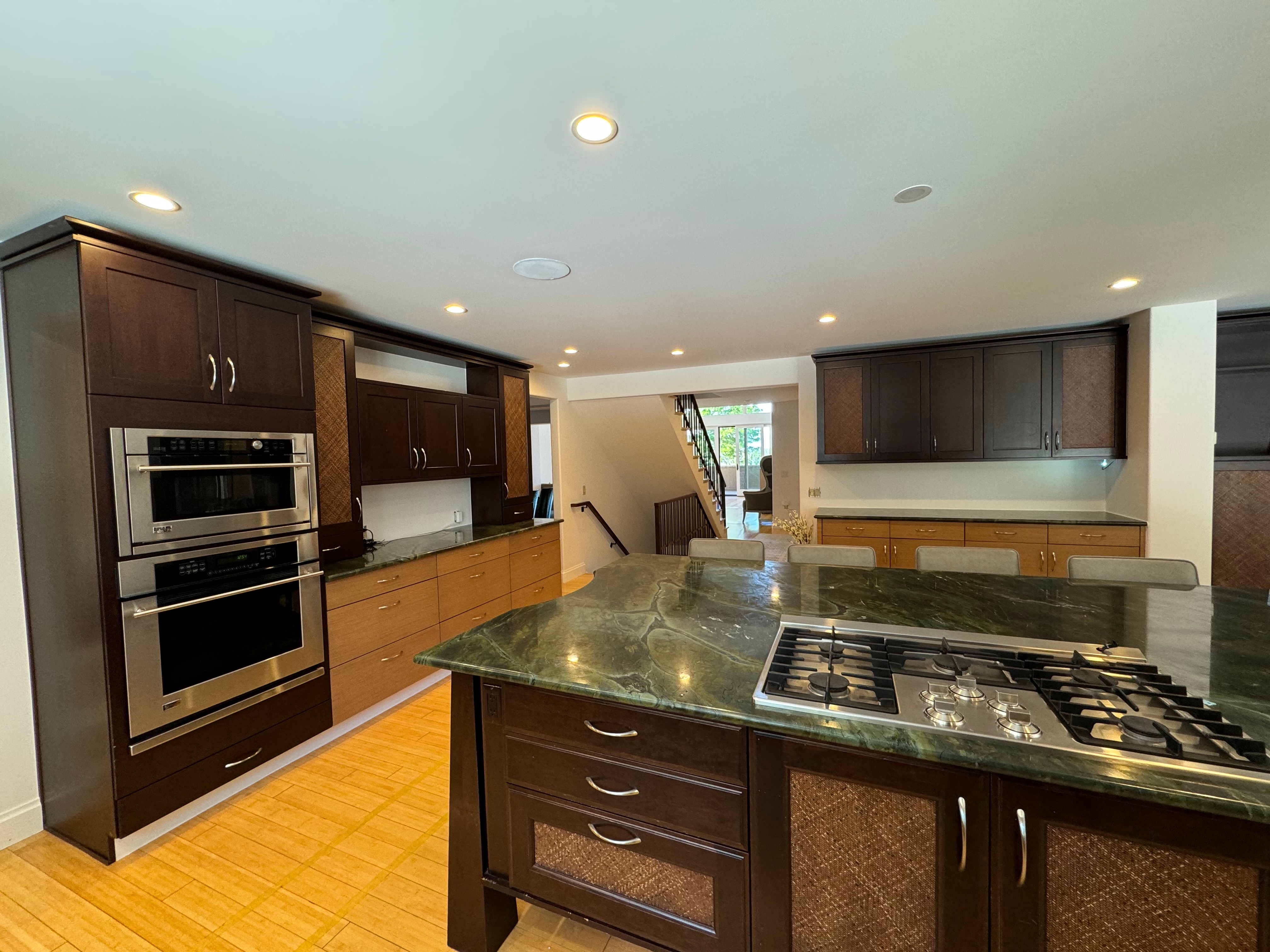 Nicely appointed Asian inspired Kitchen design with high-end "Wood-Mode" fine custom Kitchen cabinetry in a horizontal rift cut wheat finish with contrasting "Brookhaven" darker stained wood cabinetry. Some of the darker cabinetry has attractive cane inserts. The cabinetry has dove-tail and soft close drawers coming out of a multi-million-dollar home. The kitchen package comes with nice Monogram Stainless Steel appliances. The kitchen has stunning Rainforest marble slab countertops. The kitchen has been carefully uninstalled by licensed contractors. Ready to pick up! Movers available to hire. Price for the set below.