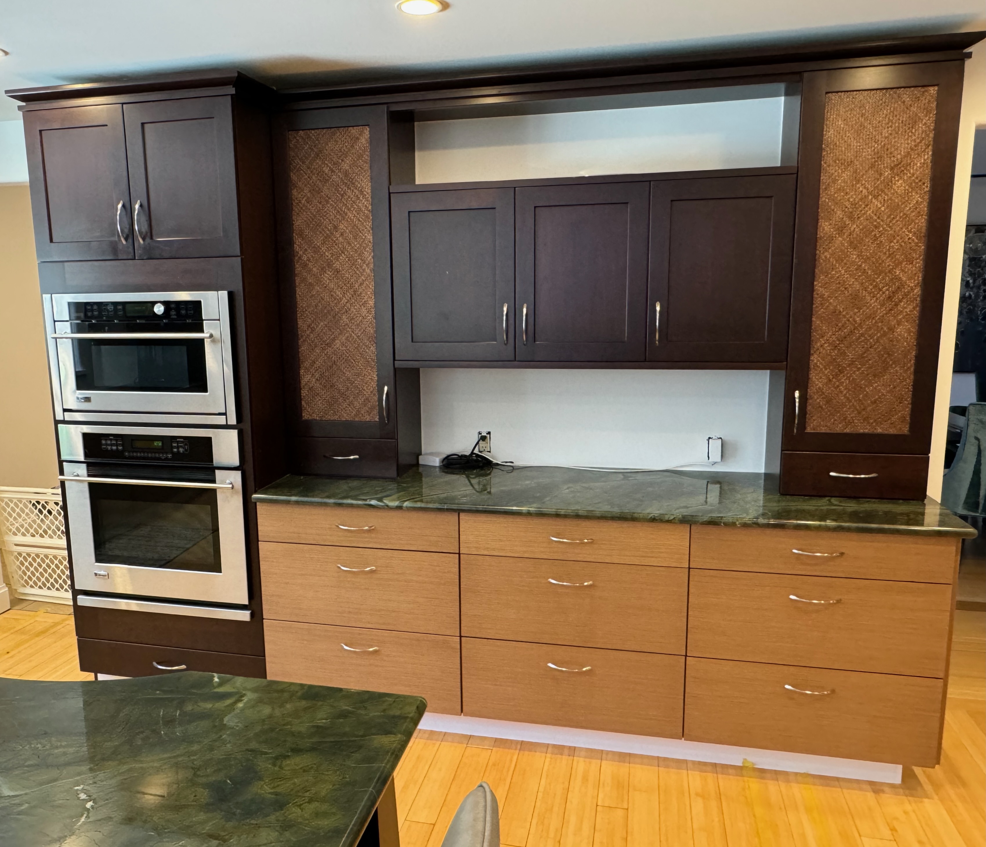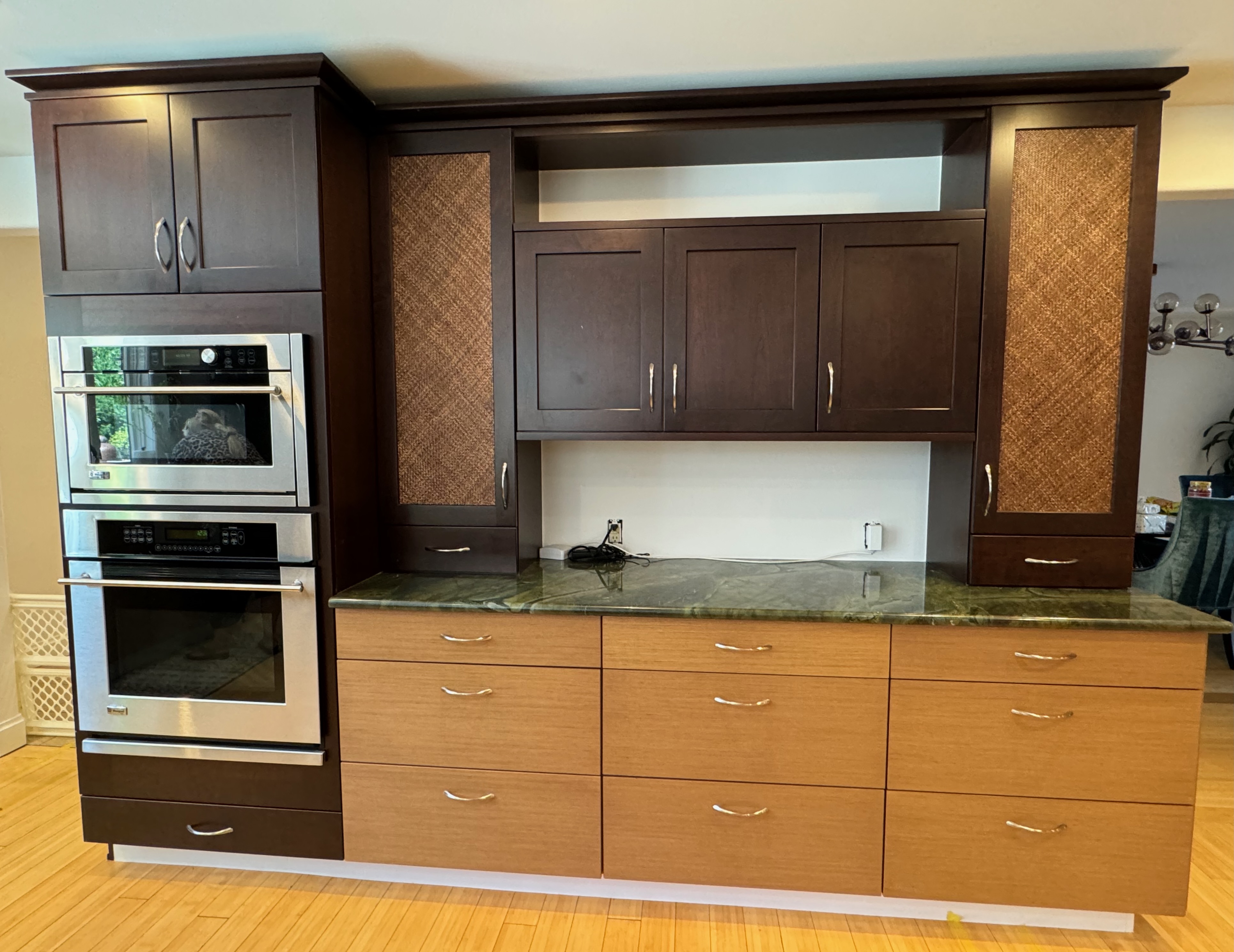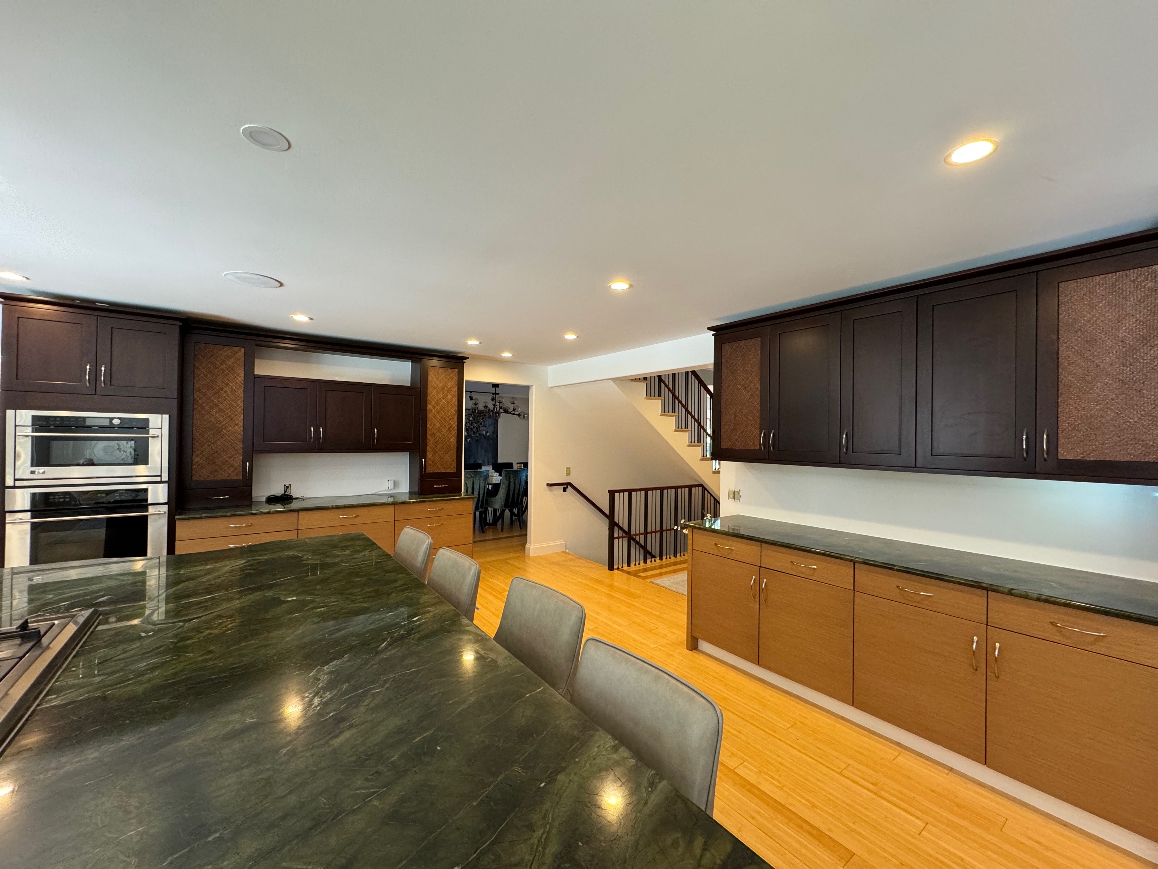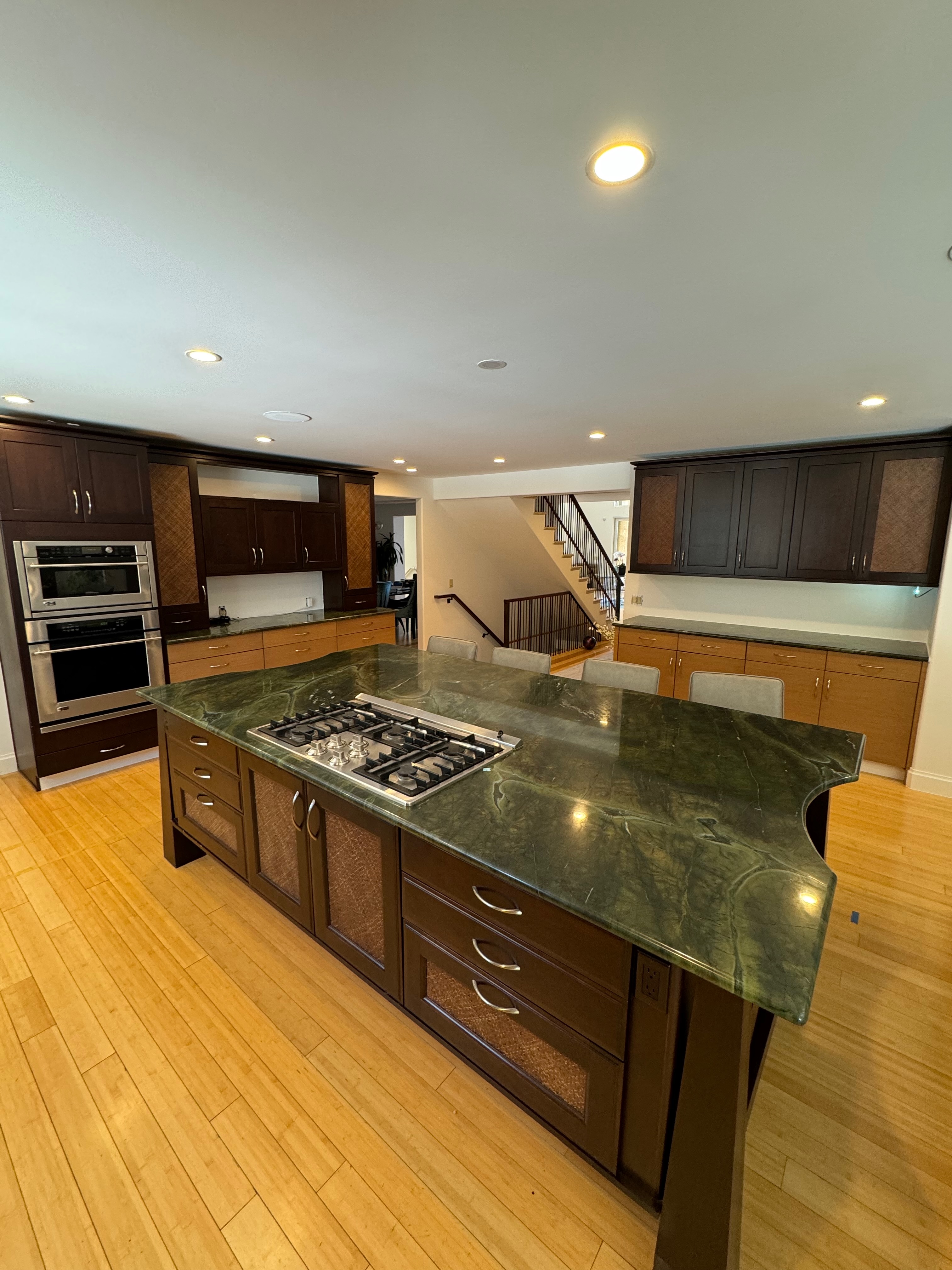 Nicely appointed Asian inspired Kitchen design with high-end "Wood-Mode" fine custom Kitchen cabinetry in a horizontal rift cut wheat finish with contrasting "Brookhaven" darker stained wood cabinetry. Some of the darker cabinetry has attractive cane inserts. The cabinetry has dove-tail and soft close drawers coming out of a multi-million-dollar home. The kitchen package comes with nice Monogram Stainless Steel appliances. The kitchen has stunning Rainforest marble slab countertops. The kitchen has been carefully uninstalled by licensed contractors. Ready to pick up! Movers available to hire. Price for the set below.