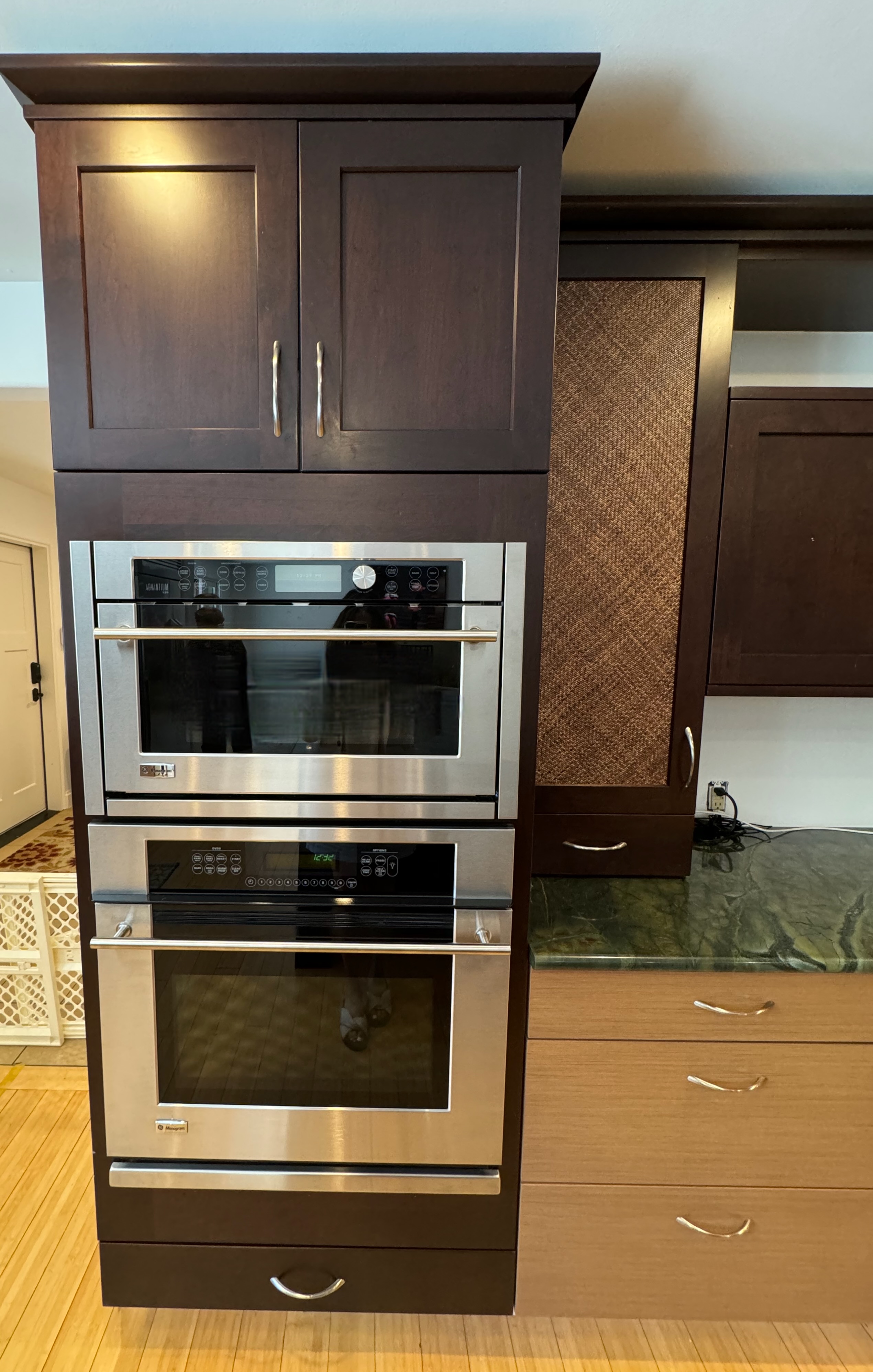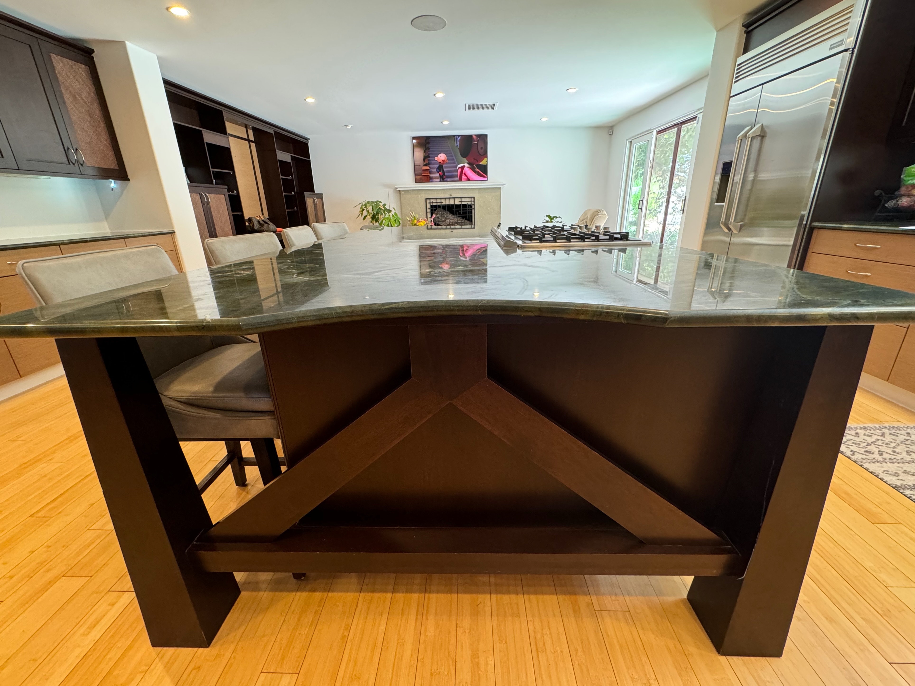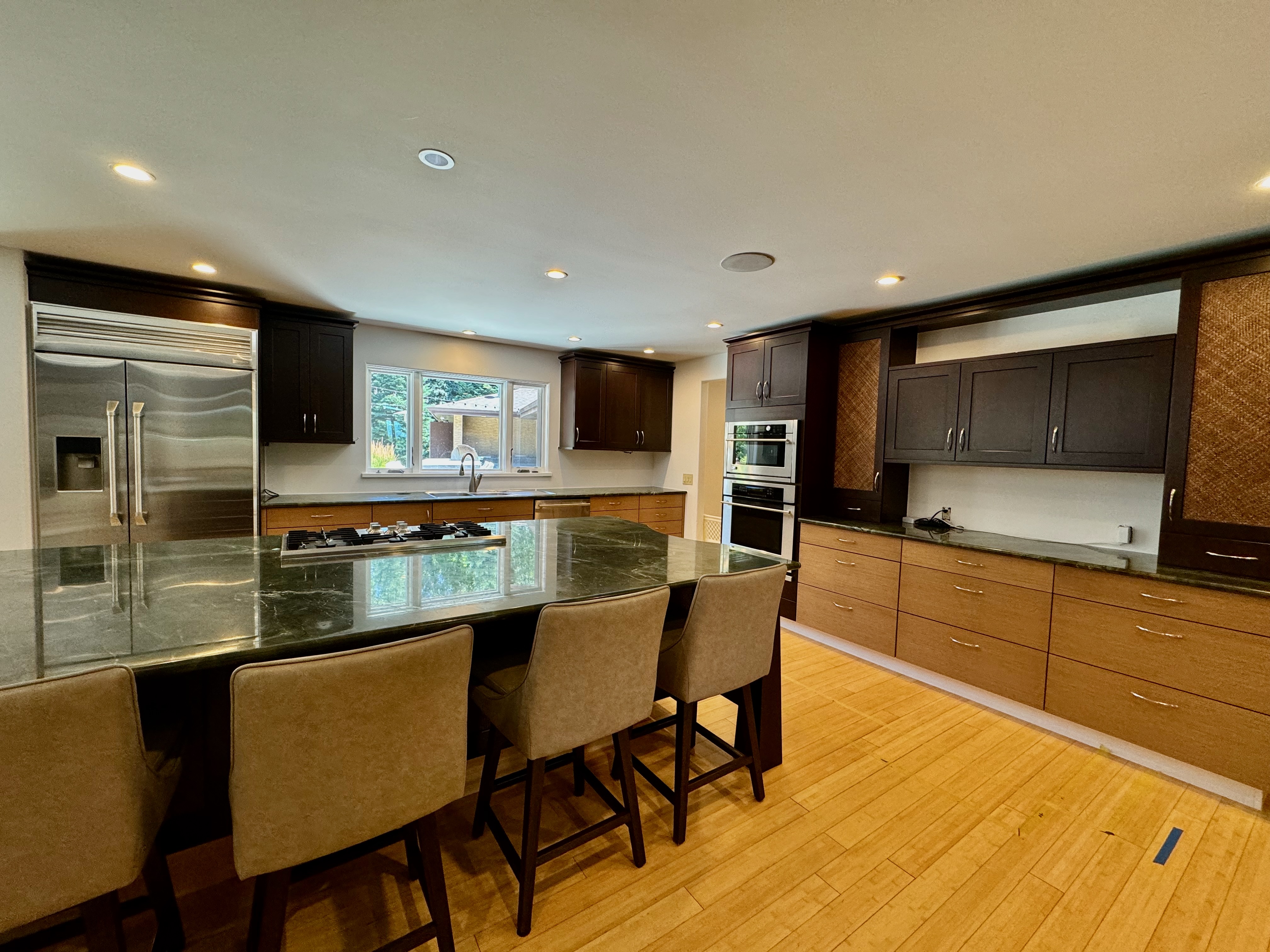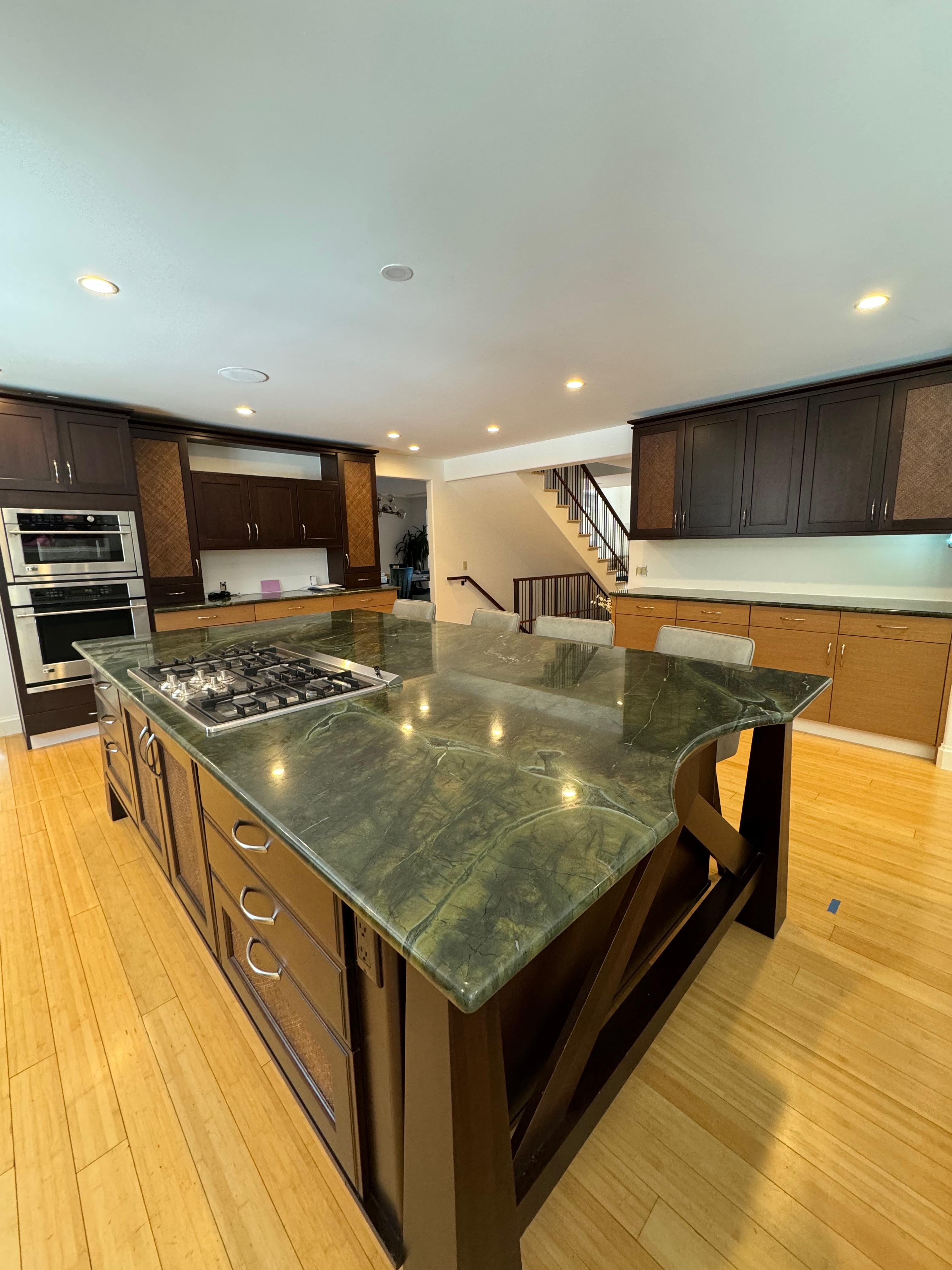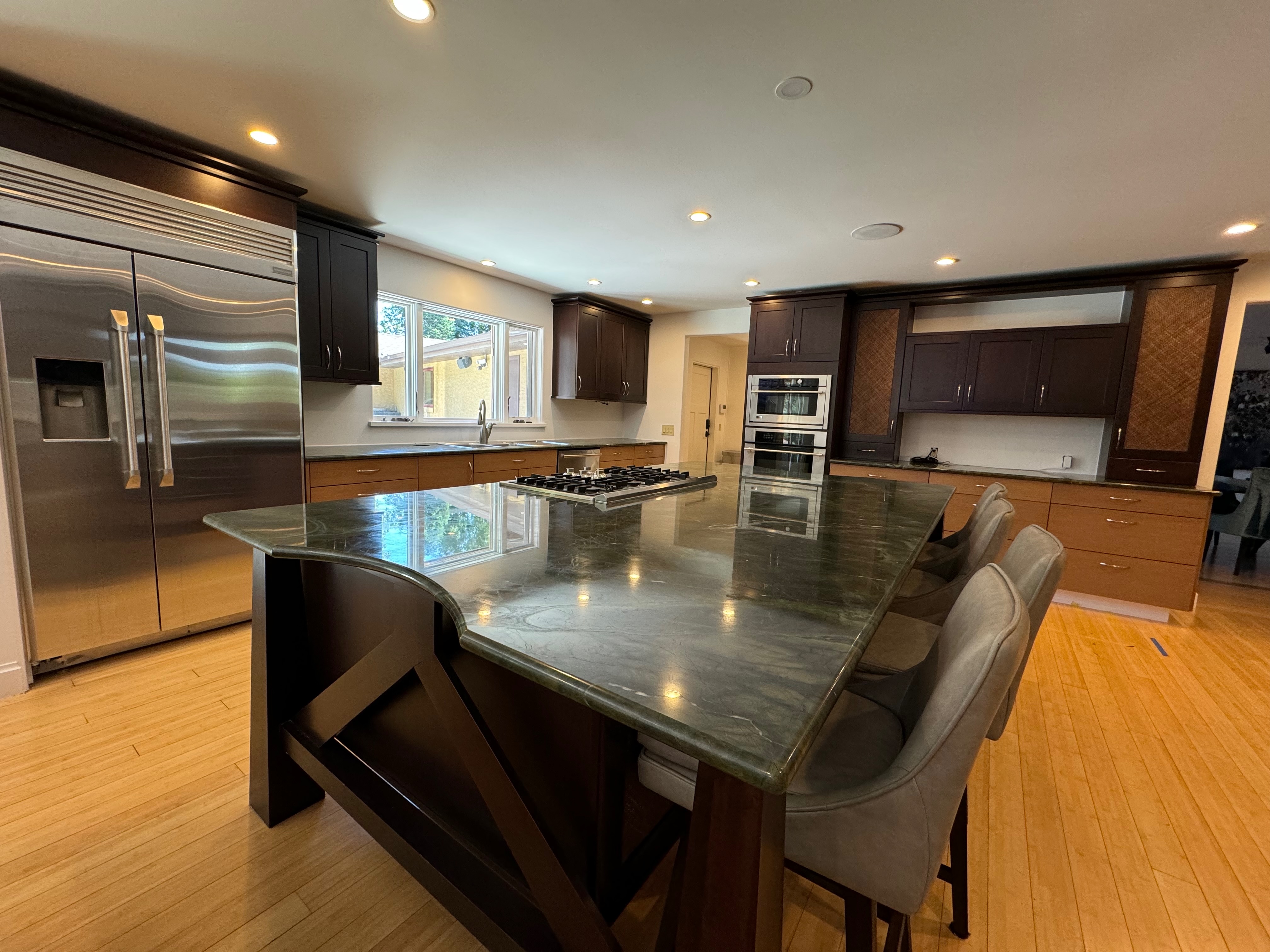 Nicely appointed Asian inspired Kitchen design with high-end "Wood-Mode" fine custom Kitchen cabinetry in a horizontal rift cut wheat finish with contrasting "Brookhaven" darker stained wood cabinetry. Some of the darker cabinetry has attractive cane inserts. The cabinetry has dove-tail and soft close drawers coming out of a multi-million-dollar home. The kitchen package comes with nice Monogram Stainless Steel appliances. The kitchen has stunning Rainforest marble slab countertops. The kitchen has been carefully uninstalled by licensed contractors. Ready to pick up! Movers available to hire. Price for the set below.