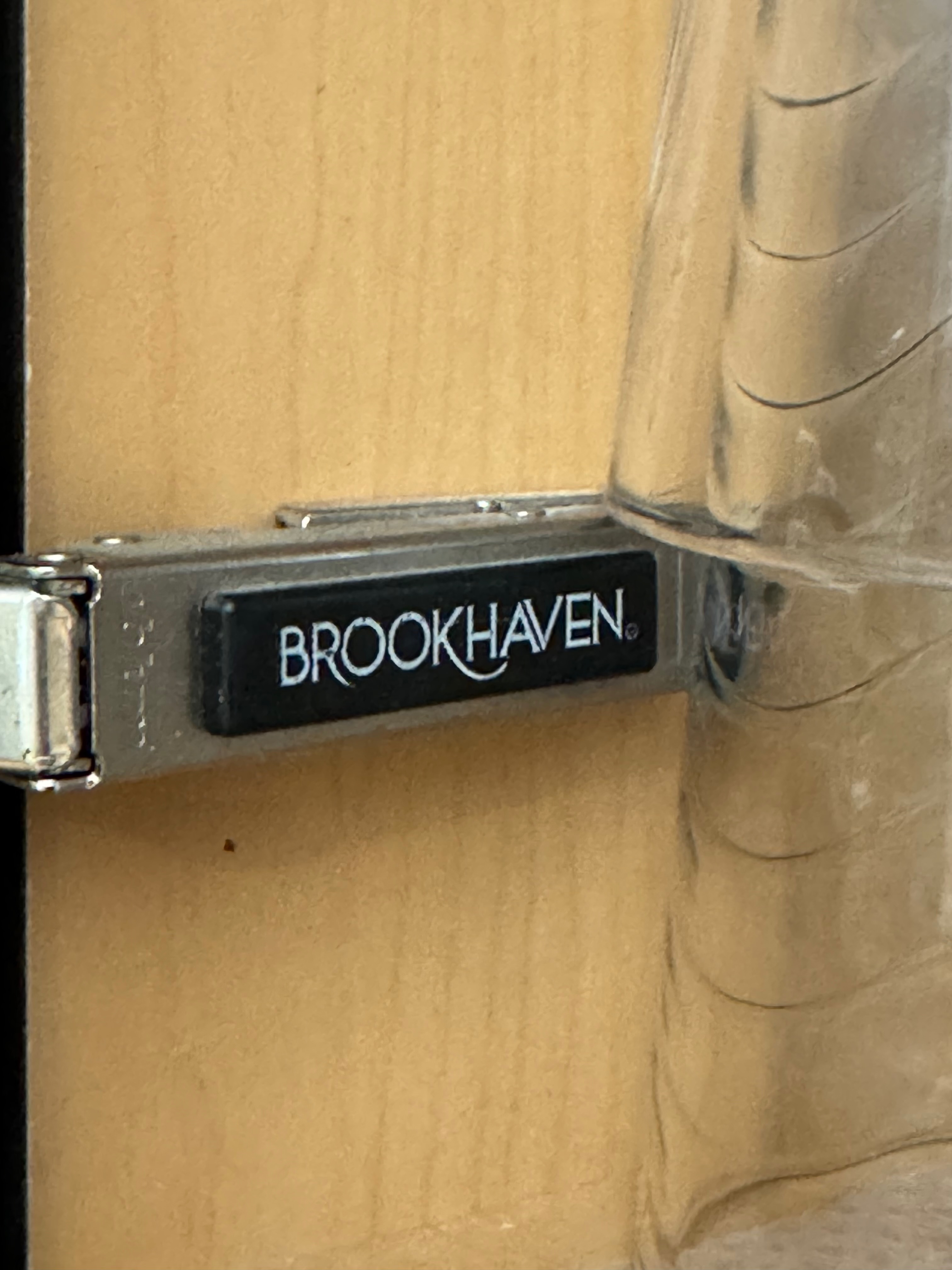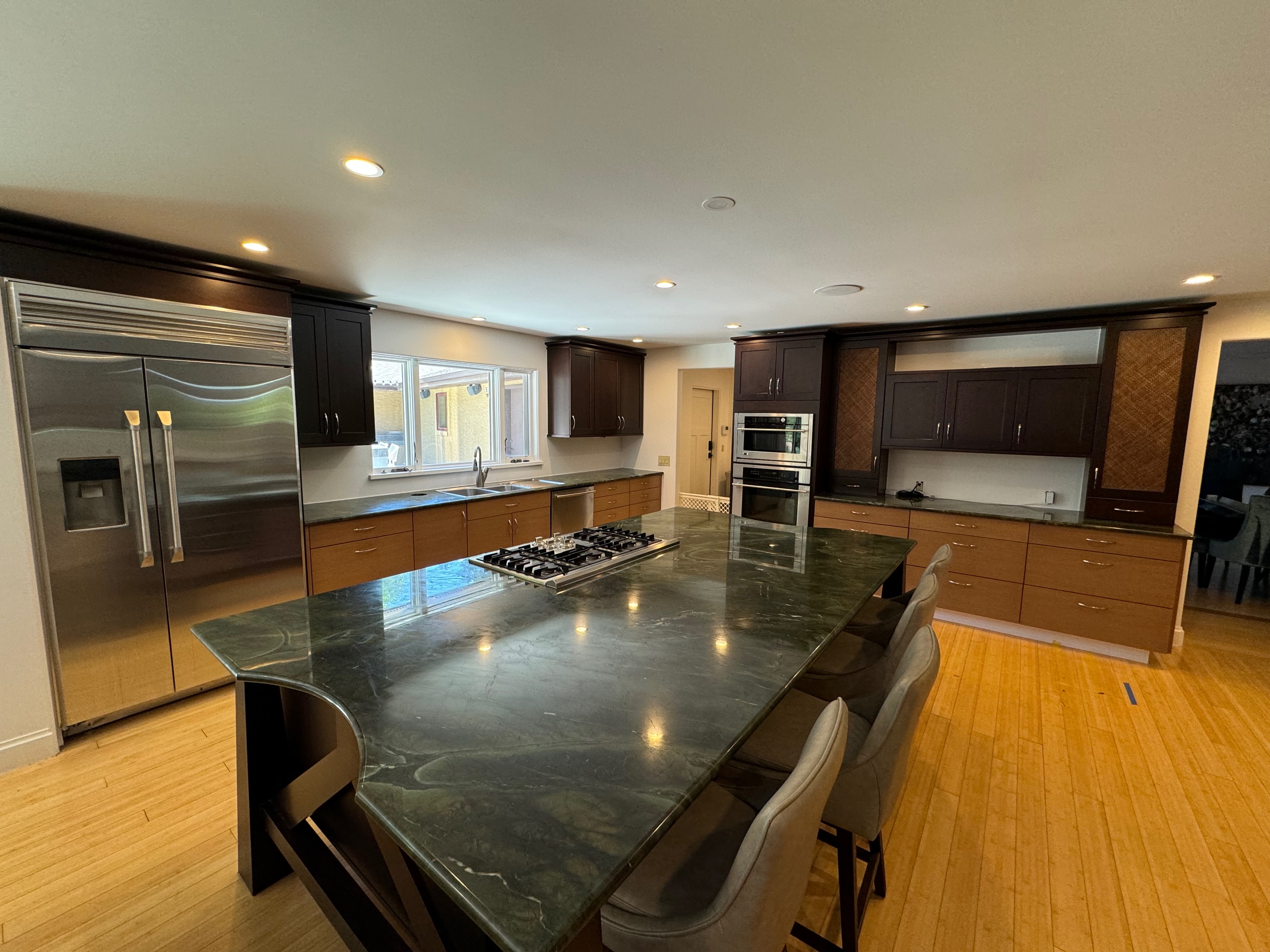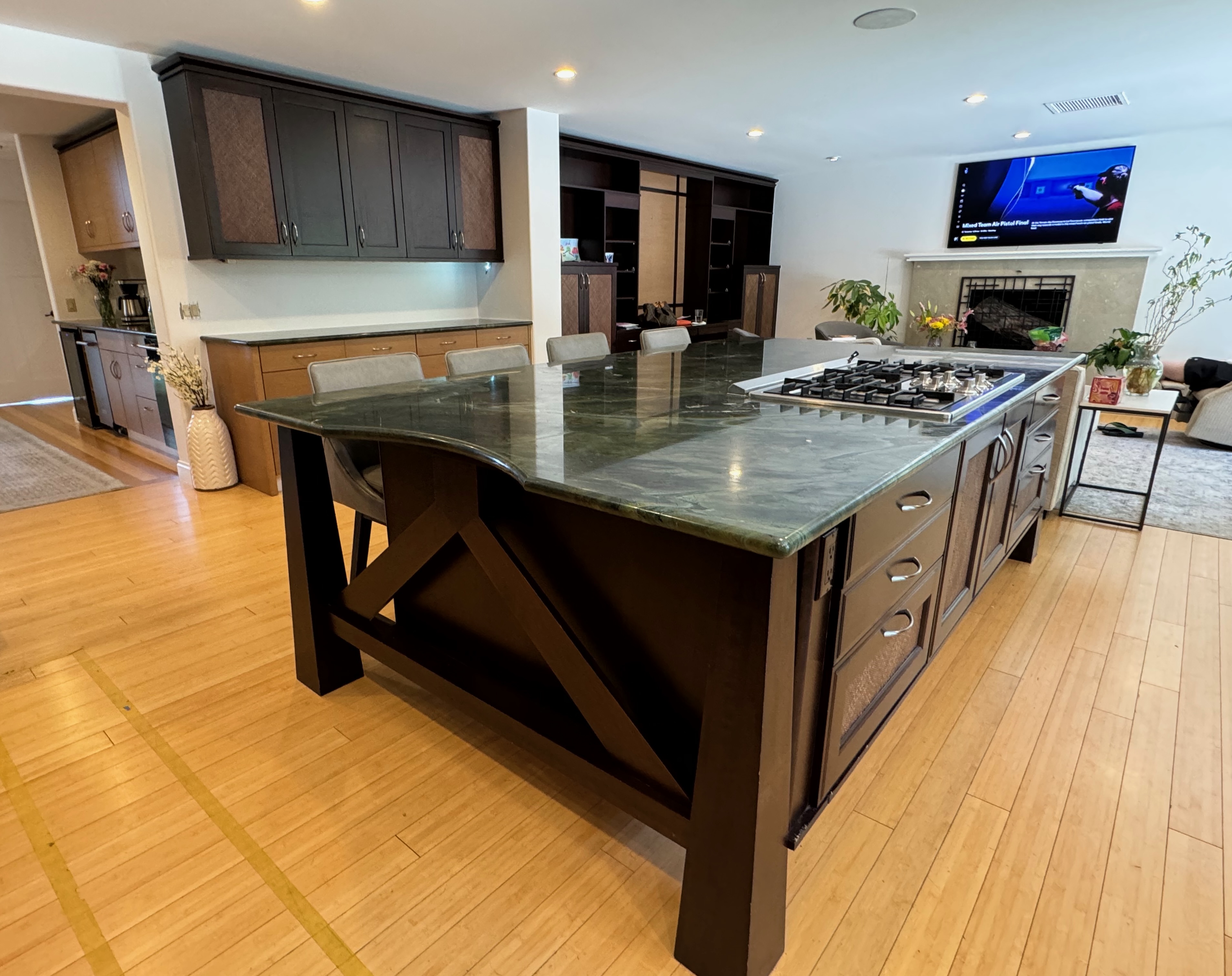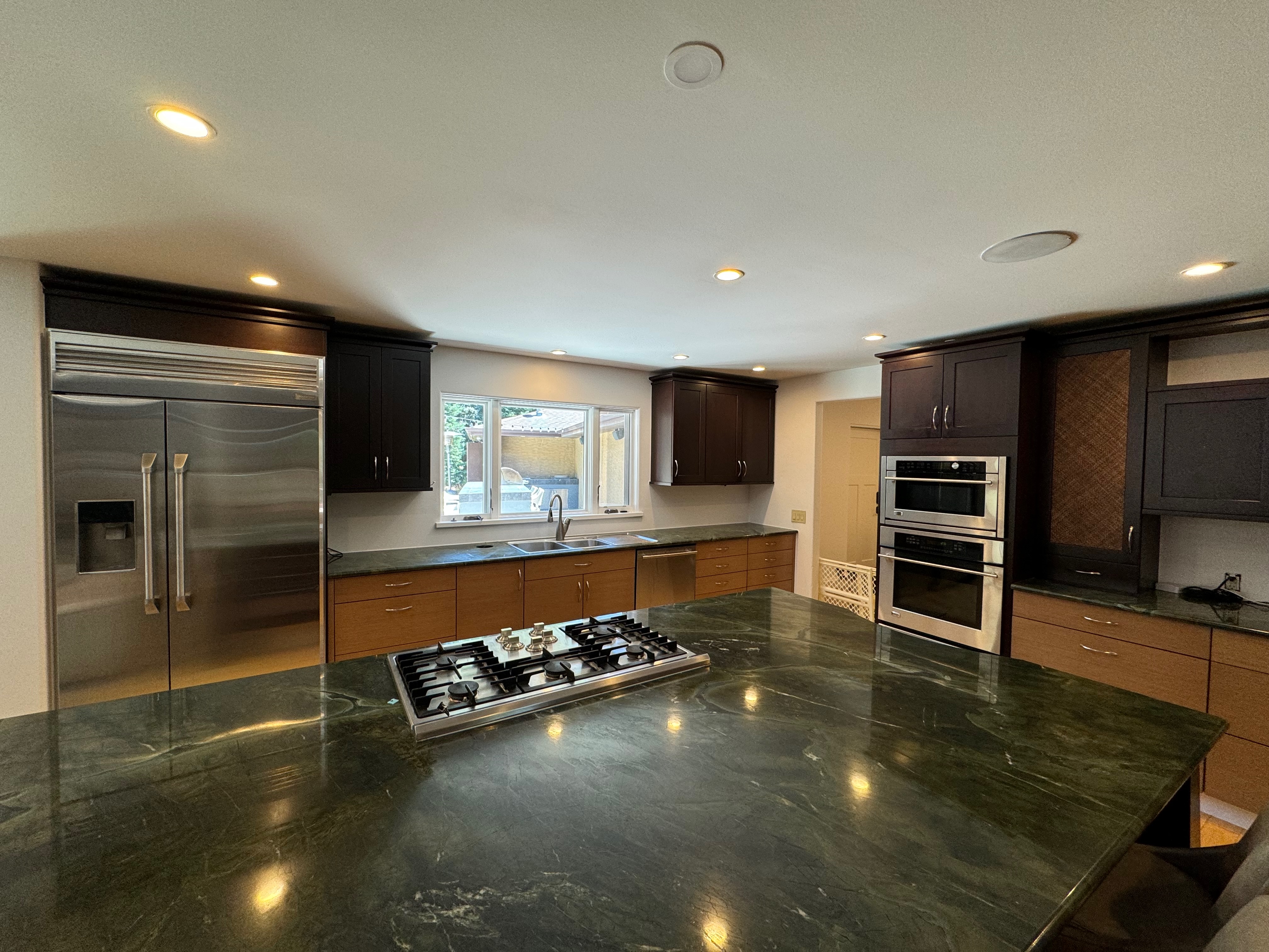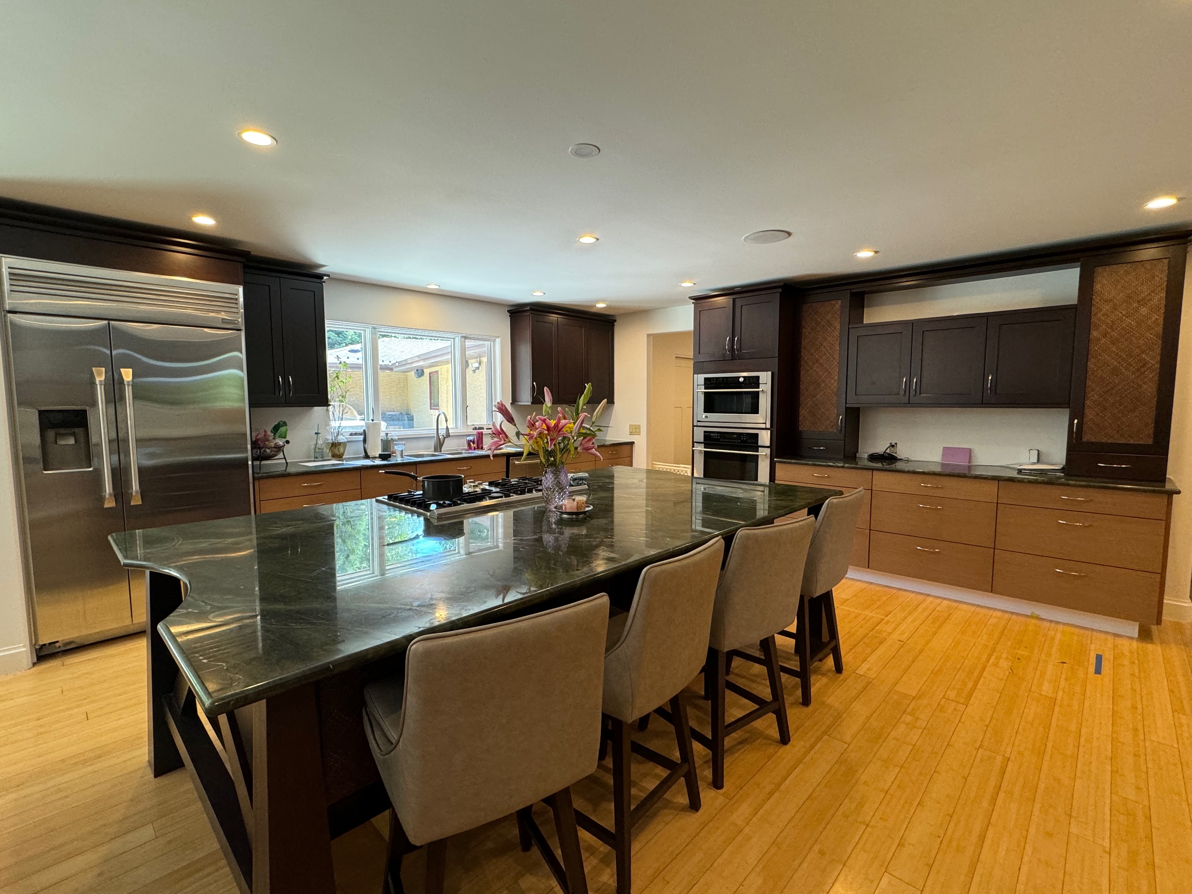 Nicely appointed Asian inspired Kitchen design with high-end "Wood-Mode" fine custom Kitchen cabinetry in a horizontal rift cut wheat finish with contrasting "Brookhaven" darker stained wood cabinetry. Some of the darker cabinetry has attractive cane inserts. The cabinetry has dove-tail and soft close drawers coming out of a multi-million-dollar home. The kitchen package comes with nice Monogram Stainless Steel appliances. The kitchen has stunning Rainforest marble slab countertops. The kitchen has been carefully uninstalled by licensed contractors. Ready to pick up! Movers available to hire. Price for the set below.