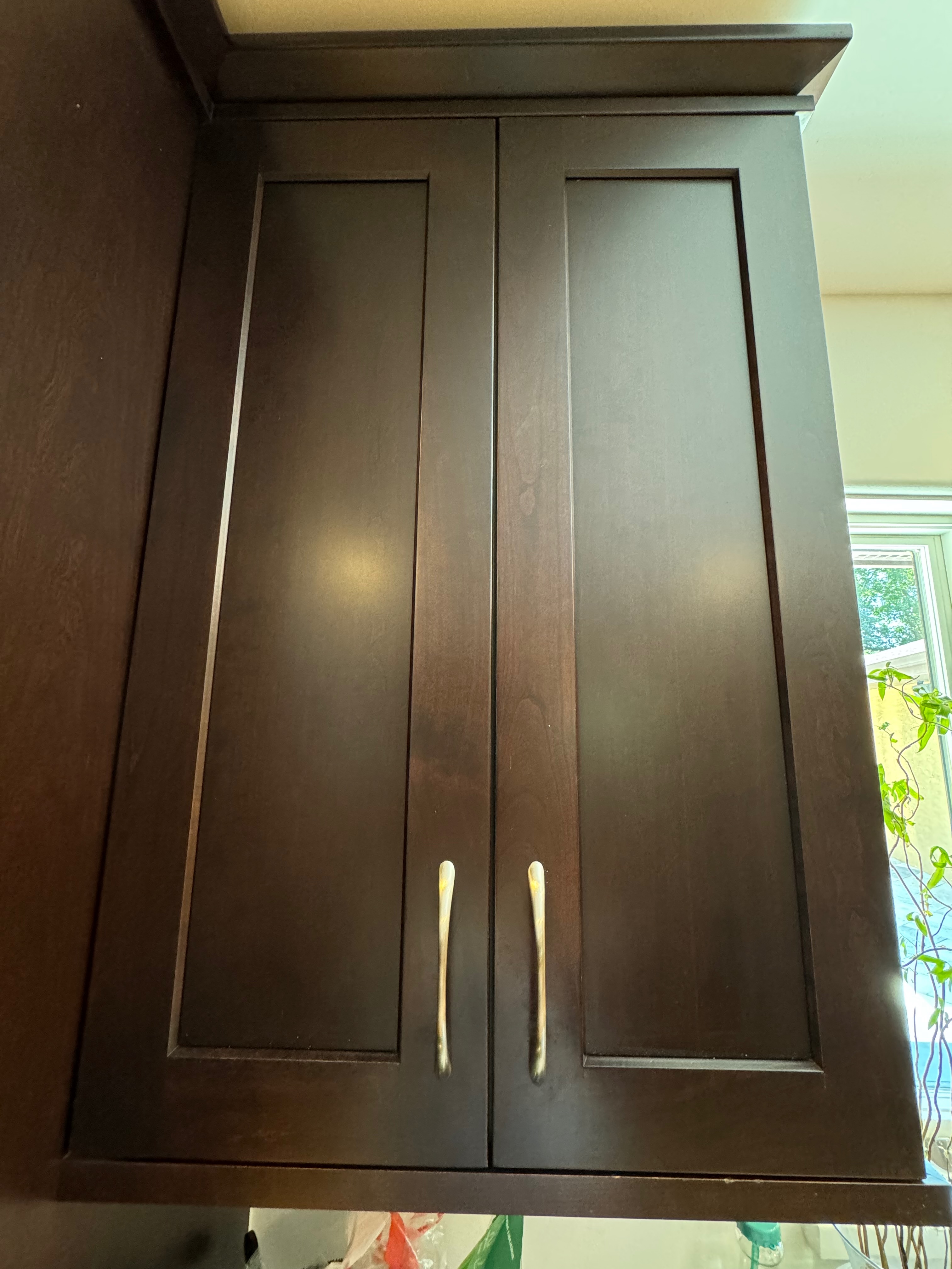 2-Two door wall cabinets in the lighter finish Dim.: 36” w x 30”h cabinet only/33 ¼” w/ crown/34 ½”h w/bottom trim x 14” d