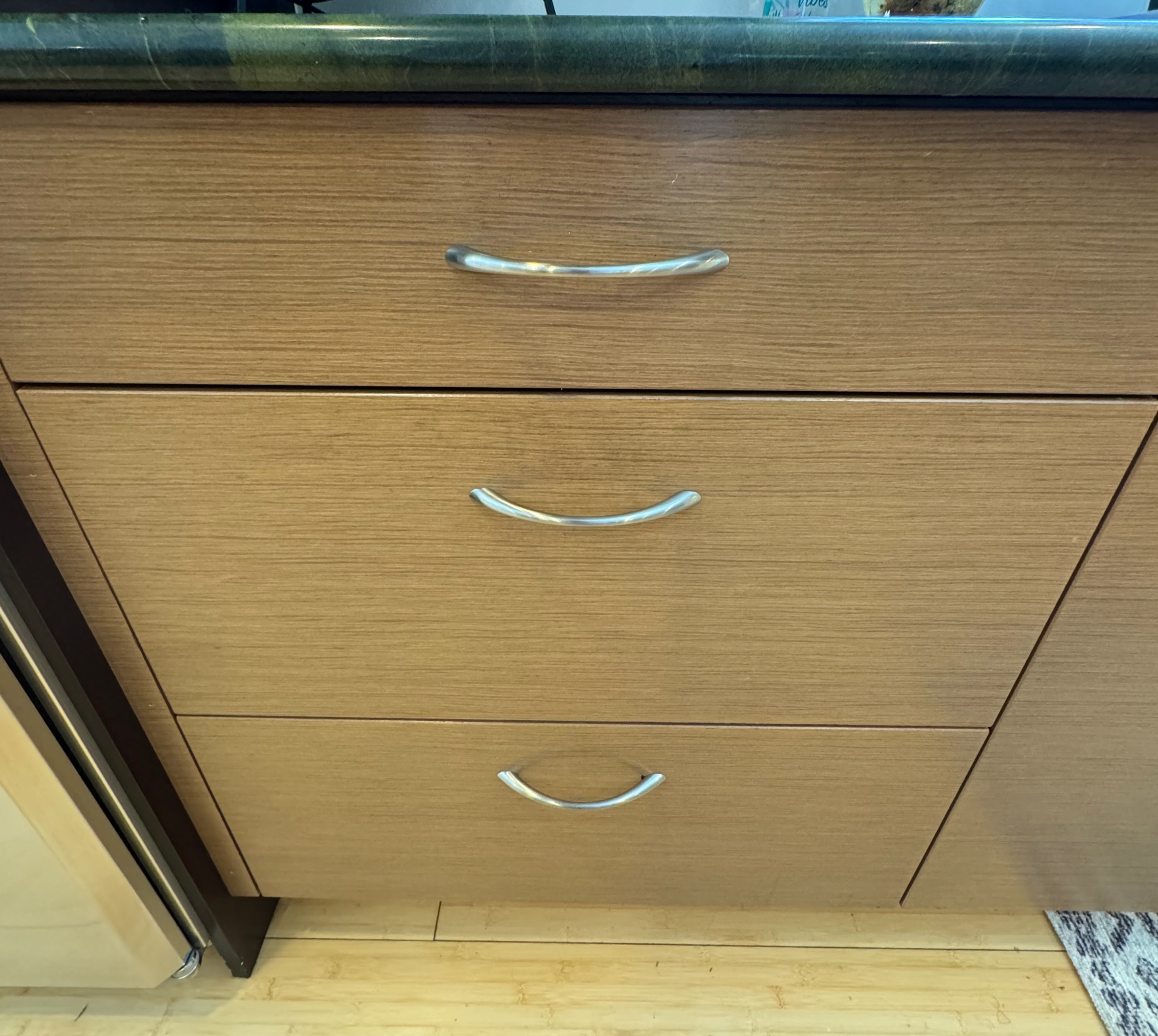 1-Three drawer base cabinet in the lighter finish Dim.: 27” w/28” w w/ filler left x 36”h x 24” d