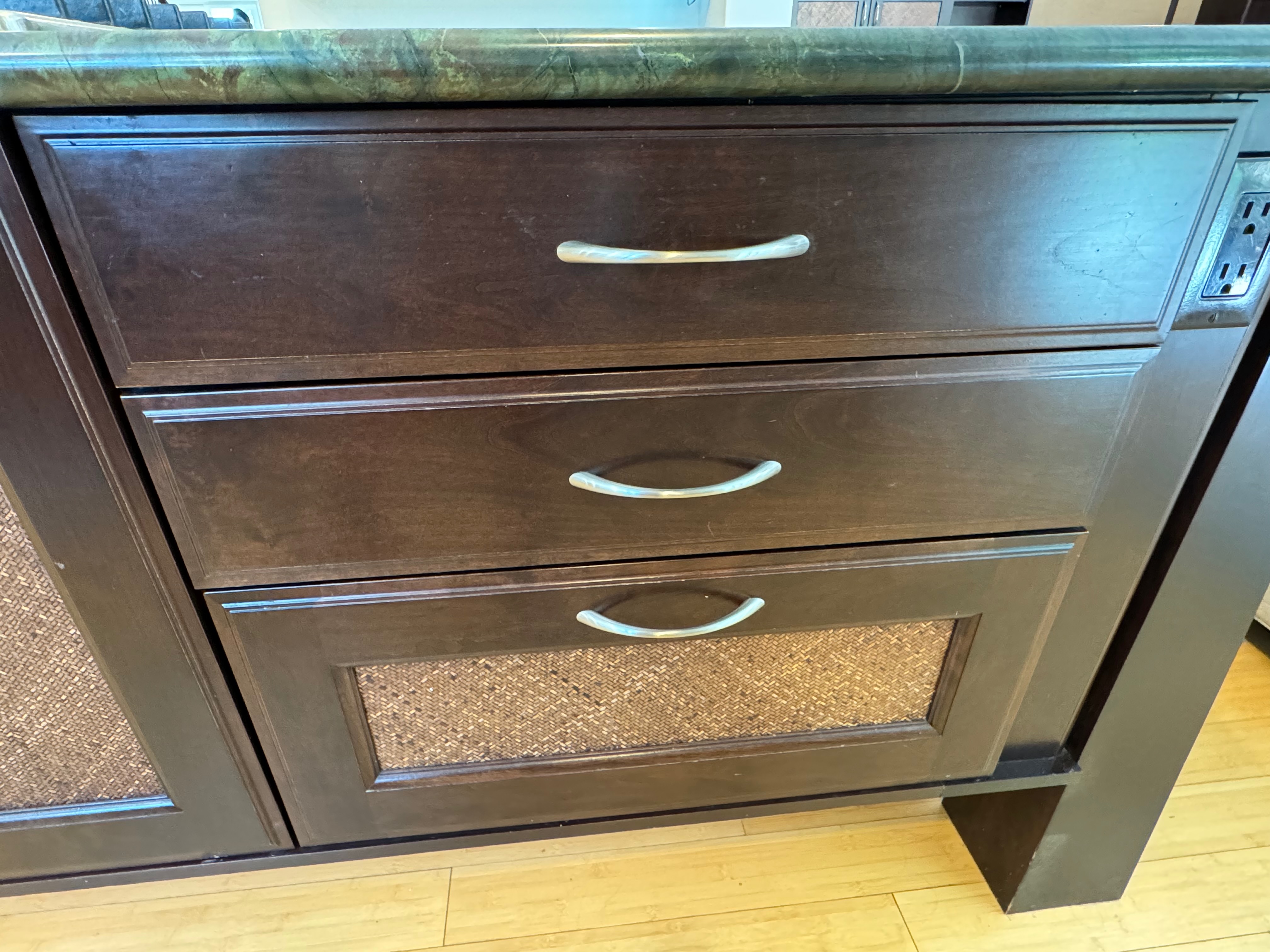 2-Three drawer base cabinets in the drawer finish with the bottom door cane insert Dim.: 27” w x 36”h x 24”d