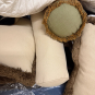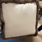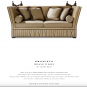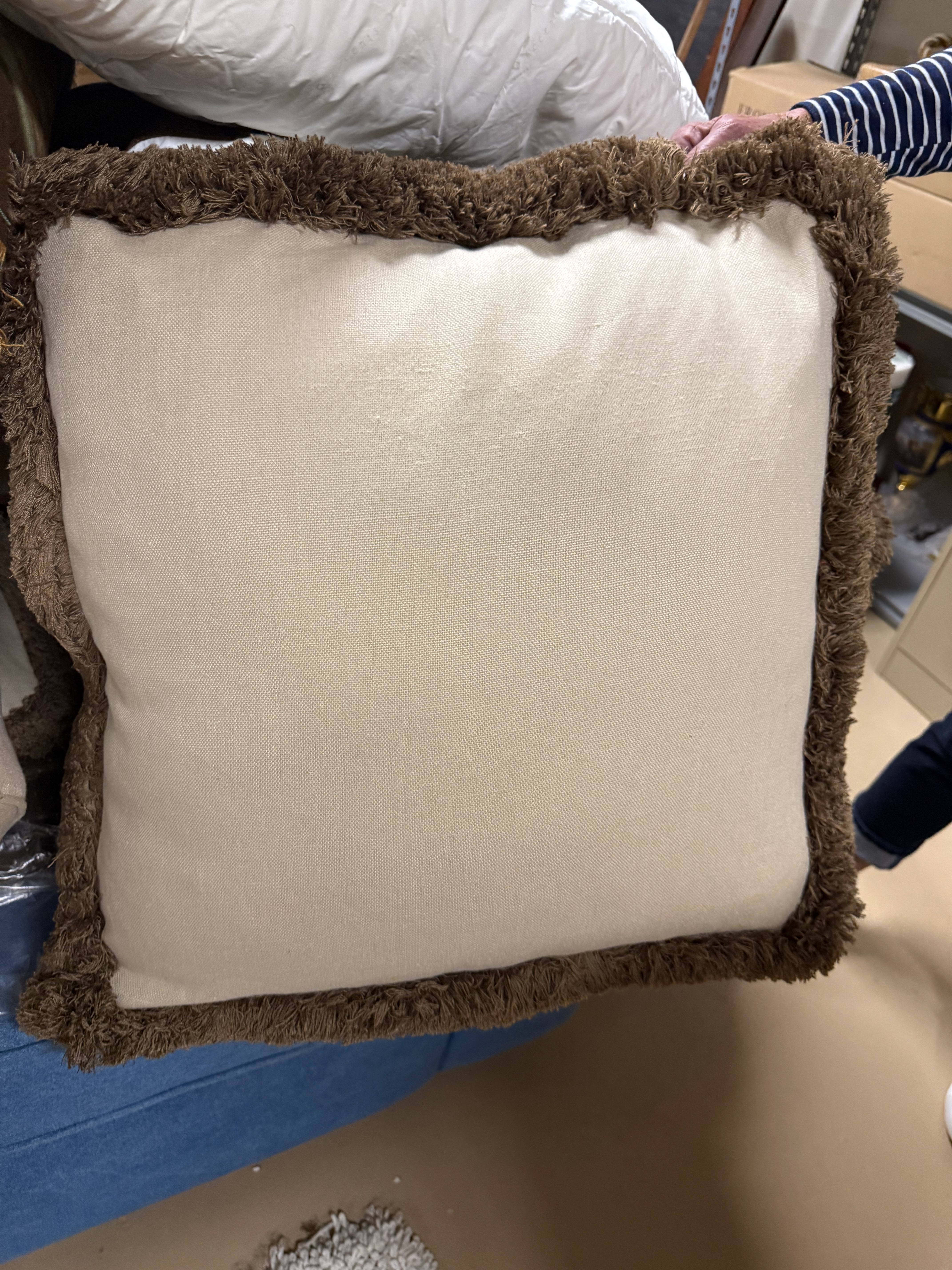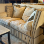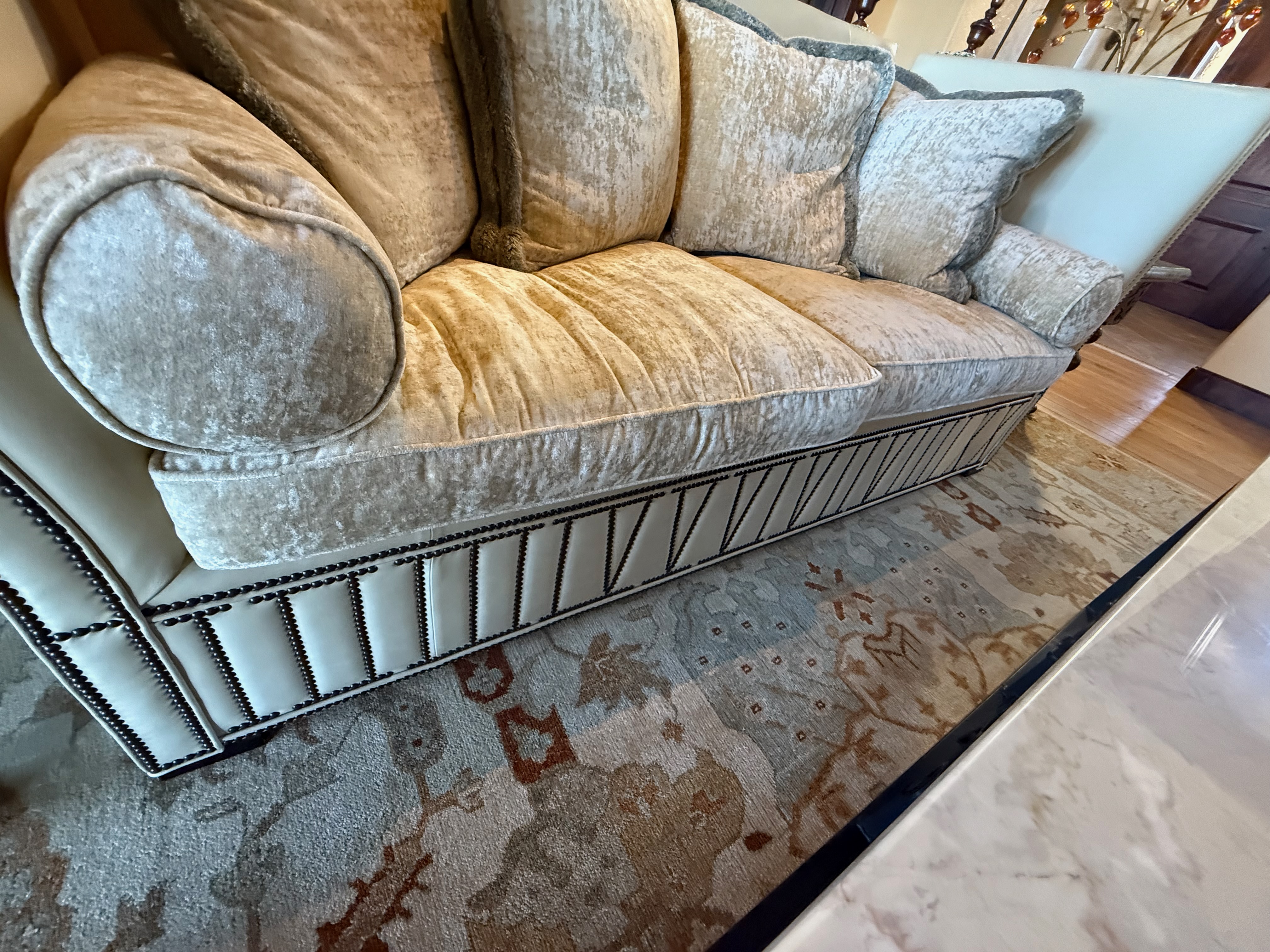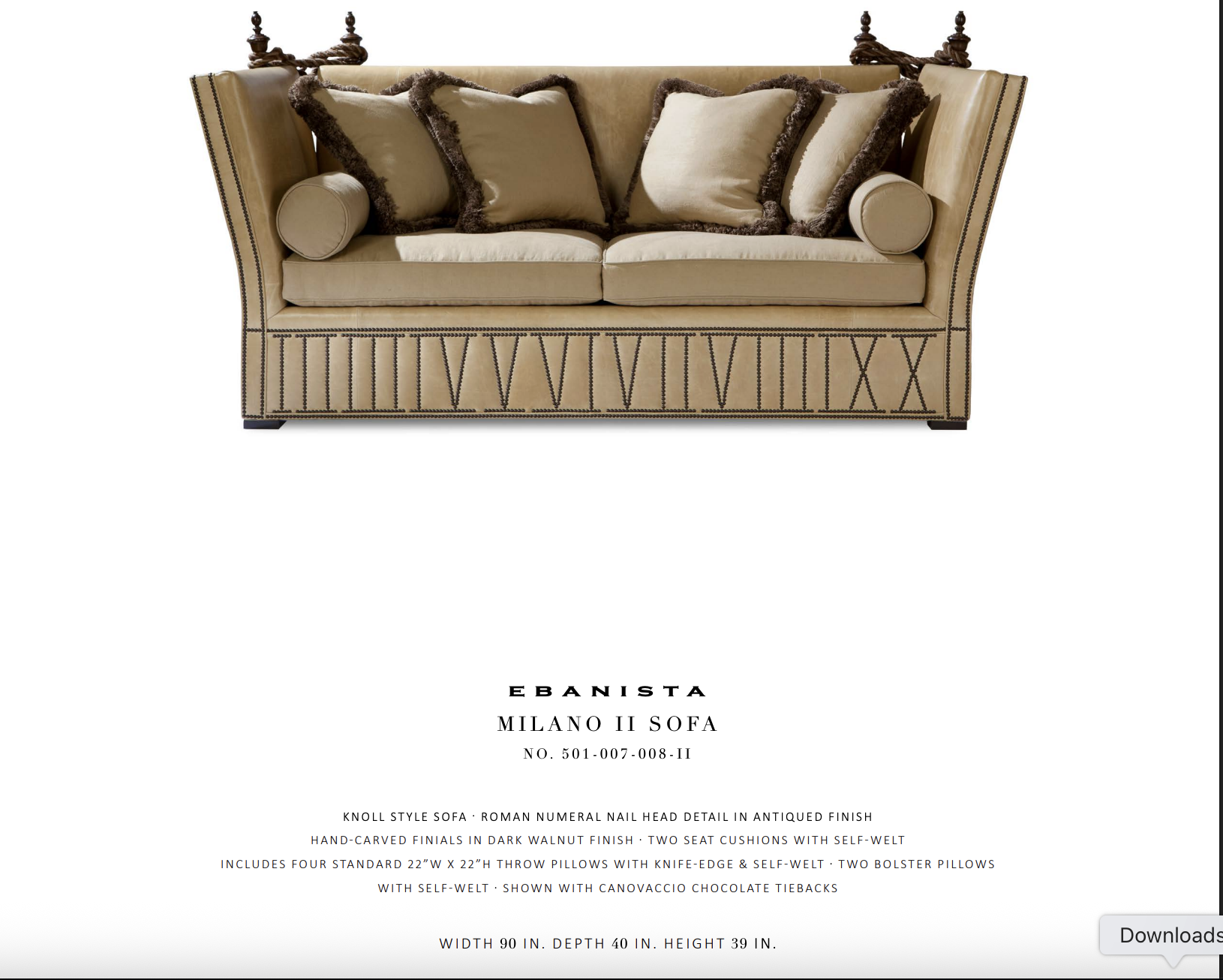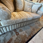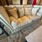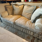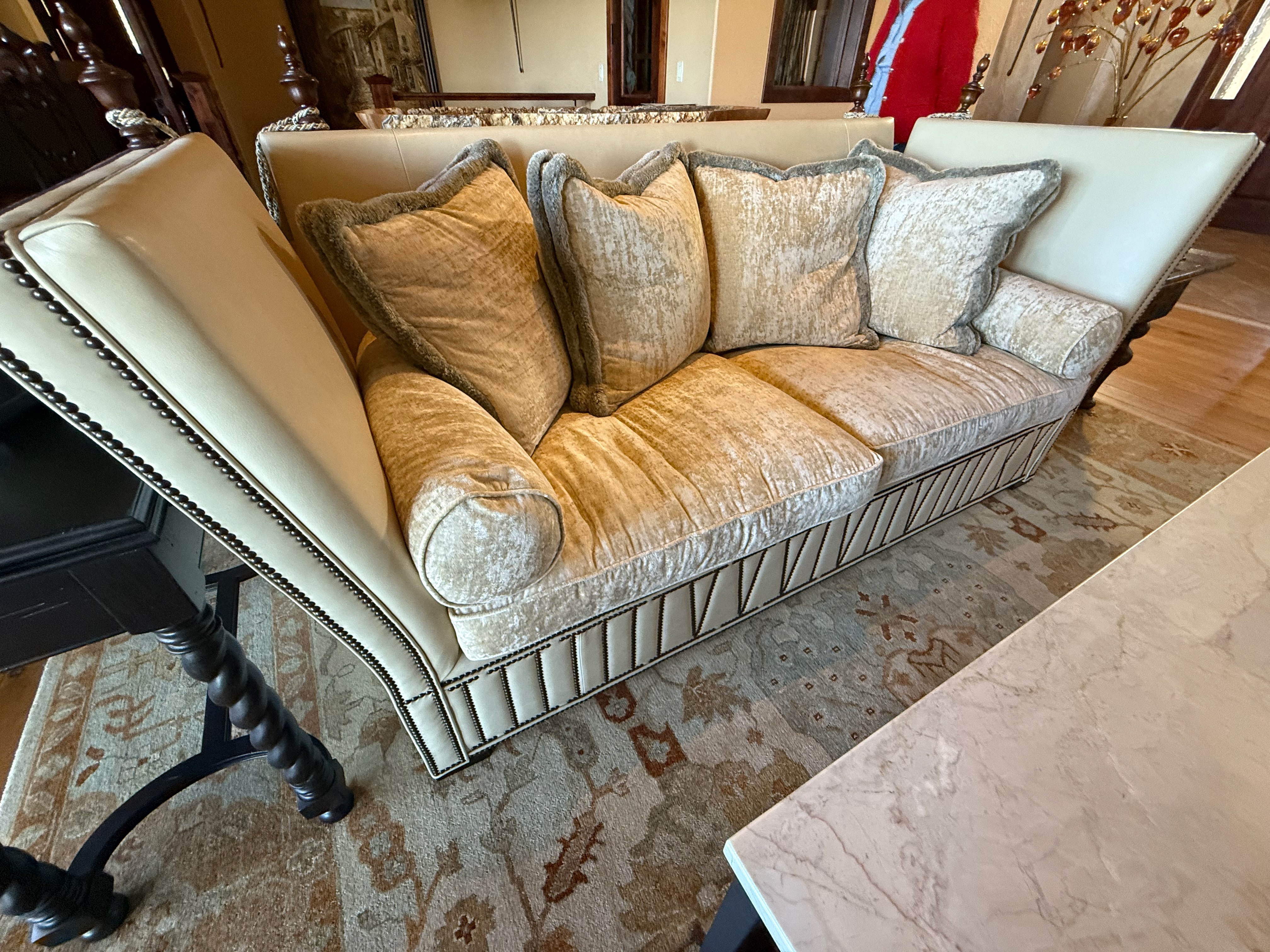 The sofa has hand-carved finials in a dark wood finish. Included are two self welt seat cushions, 4 standard throw pillows 22" x 22" and two Bolster pillows as shown in the original and plus the additional throw pillows that were custom made in the majority of the pillows. Sofa dimensions: 90"w x 39"h x 40" d. Listing price new $22,000.