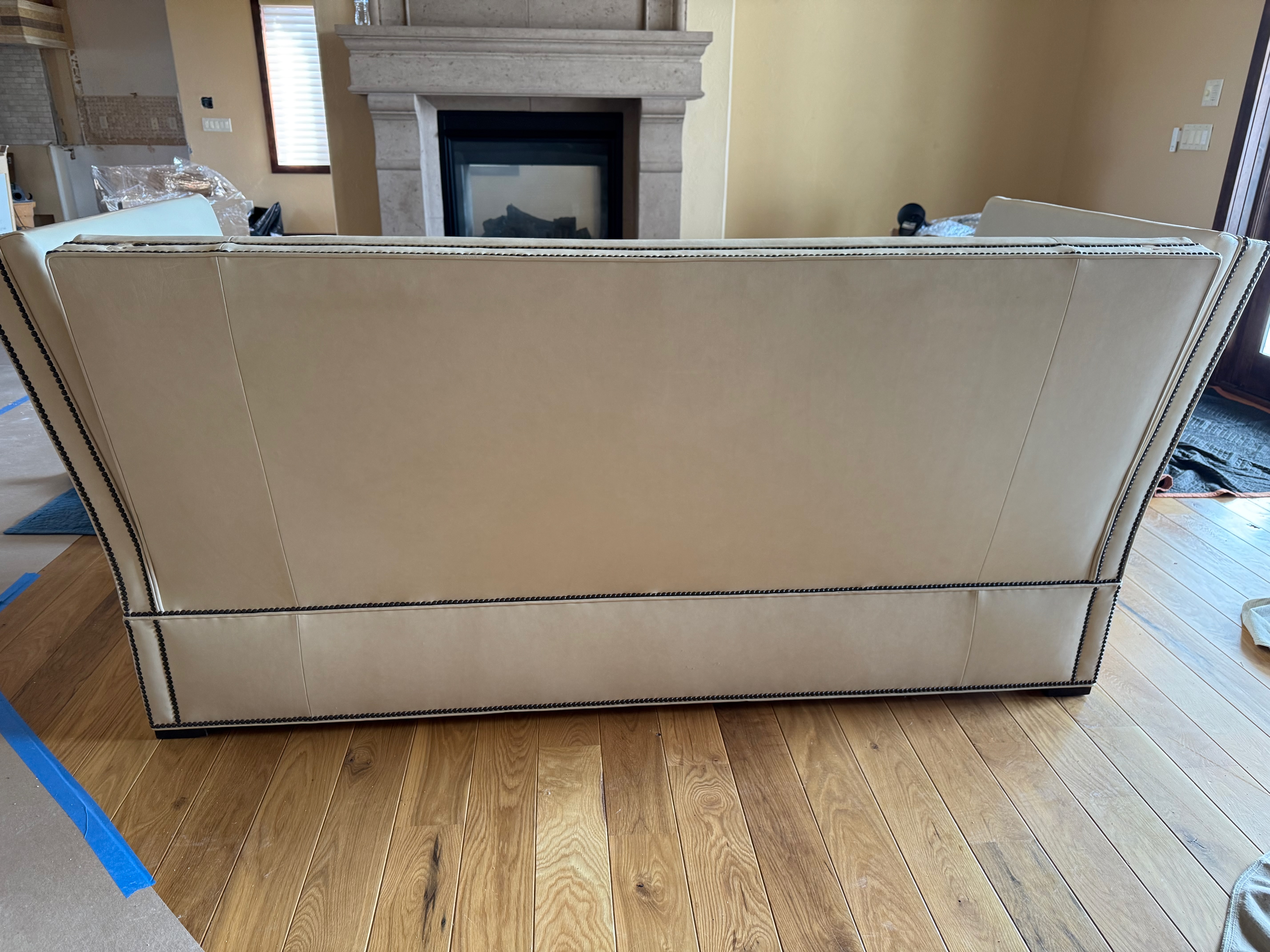 Gorgeous! High-end gently used "Ebanista" leather Milano II sofa. This is a Knoll style sofa with Roman numeral nailhead detailing in an antique finish. Ebanista furniture's craftsmanship at its finest: architectural construction and thoughtful detailing.